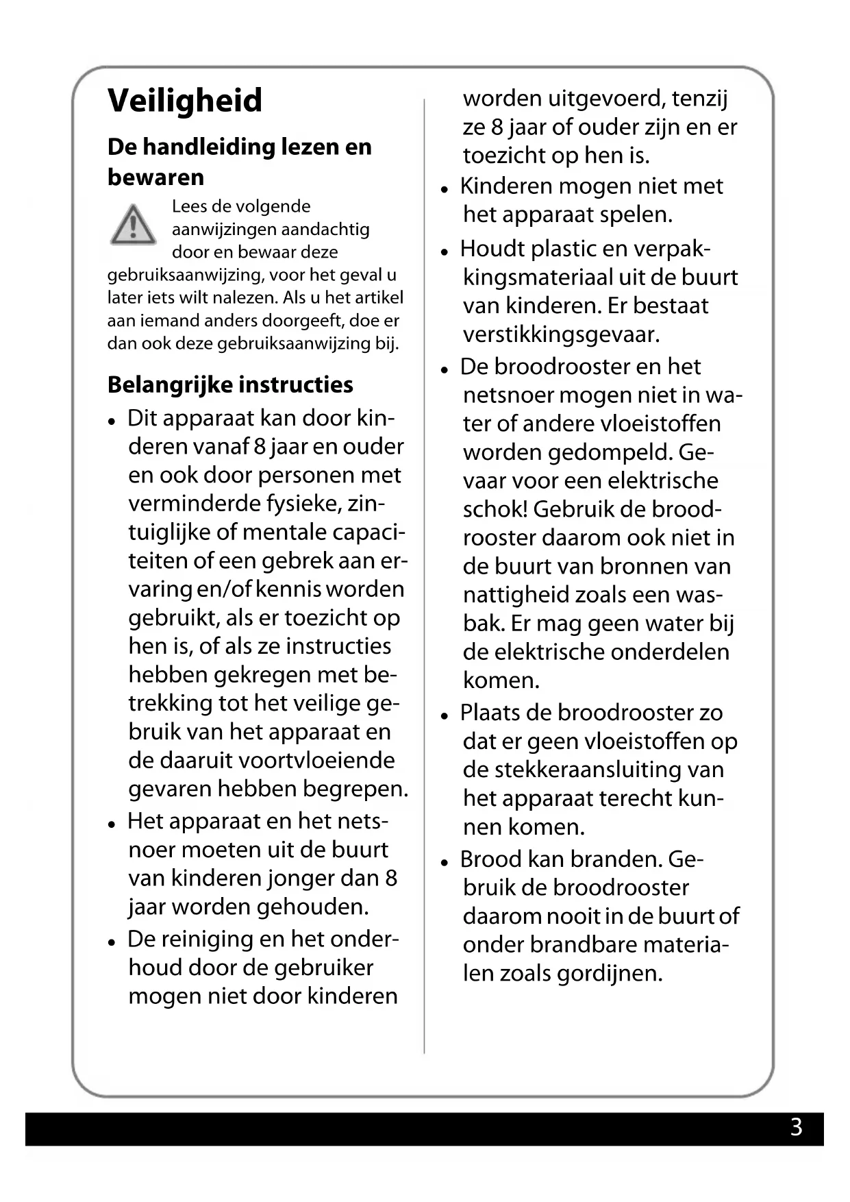 toegankelijk stopcontact met rand- aarding. De eerste keer opwarmen Brandgevaar – Dek de broodrooster en de broodjeshouder nooit af wanneer u hem gebruikt of wanneer hij nog warm is door het gebruik ervan. – Gebruik de broodrooster niet zonder dat er toezicht is. Hierbij moet de kruimel- lade zich altijd in het appa- raat bevinden. Gevaar voor verbranding – Het apparaat wordt tijdens het gebruik heet. Raak het niet aan en laat het volle- dig afkoelen voordat u het verplaatst, schoonmaakt of wegruimt. – Bij het eerste gebruik kan een lichte geurontwikke- ling worden waargeno- men die snel daarna ver- dwijnt. Zorg voor voldoen- de ventilatie, bijv. door een geopend venster. – De bedieningshendel klikt alleen vast wanneer de netstekker van de brood- rooster in een onder span- ning staand stopcontact zit. Voordat u het apparaat voor de eerste keer gebruikt, verwarmt u het 4 maal op zonder brood te roosteren.