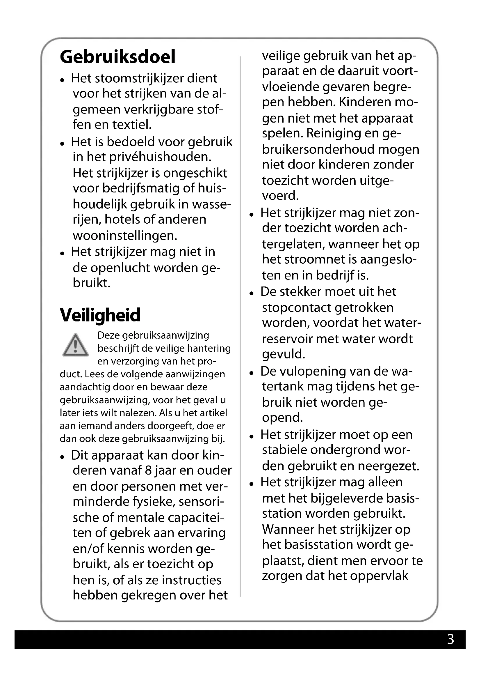 - Technische specificaties Gebruiksdoel z Het stoomstrijkijzer dient voor het strijken van de al- gemeen verkrijgbare stof- fen en textiel. z Het is bedoeld voor gebruik in het privéhuishouden. Het strijkijzer is ongeschikt voor bedrijfsmatig of huis- houdelijk gebruik in wasse- rijen, hotels of anderen wooninstellingen. z Het strijkijzer mag niet in de openlucht worden ge- bruikt. Veiligheid Deze gebruiksaanwijzing beschrijft de veilige hantering en verzorging van het pro- duct. Lees de volgende aanwijzingen aandachtig door en bewaar deze gebruiksaanwijzing, voor het geval u later iets wilt nalezen. Als u het artikel aan iemand anders doorgeeft, doe er dan ook deze gebruiksaanwijzing bij. z Dit apparaat kan door kin- deren vanaf 8 jaar en ouder en door personen met ver- minderde fysieke, sensori- sche of mentale capacitei- ten of gebrek aan ervaring en/of kennis worden ge- bruikt, als er toezicht op hen is, of als ze instructies hebben gekregen over het veilige gebruik van het ap- paraat en de daaruit voort- vloeiende gevaren begre- pen hebben. Kinderen mo- gen niet met het apparaat spelen. Reiniging en ge- bruikersonderhoud mogen niet door kinderen zonder toezicht worden uitge- voerd. z Het strijkijzer mag niet zon- der toezicht worden ach- tergelaten, wanneer het op het stroomnet is aangeslo- ten en in bedrijf is. z De stekker moet uit het stopcontact getrokken worden, voordat het water- reservoir met water wordt gevuld. z De vulopening van de wa- tertank mag tijdens het ge- bruik niet worden ge- opend. z Het strijkijzer moet op een stabiele ondergrond wor- den gebruikt en neergezet. z Het strijkijzer mag alleen met het bijgeleverde basis- station worden gebruikt. Wanneer het strijkijzer op het basisstation wordt ge- plaatst, dient men ervoor te zorgen dat het oppervlak4 waarop het basisstation is geplaatst, stabiel is. z Als het strijkijzer op een strijkerhouder wordt gezet, moet worden gecontro- leerd of het oppervlak waarop de strijkerhouder staat, stabiel is. z Het strijkijzer mag niet wor- den gebruikt als het op de grond gevallen is, als het zichtbaar beschadigd of lek is. z Het strijkijzer en het net- snoer moeten tijdens het inschakelen of afkoelen buiten bereik zijn van kin- deren, jonger dan 8 jaar. z Als het netsnoer van dit ap- paraat wordt beschadigd, moet dit door de fabrikant of zijn klantendienst of een soortgelijk gekwalificeerde persoon worden vervan- gen, om risico's te vermij- den. Het netsnoer is een speciaal snoer. z Het strijkijzer mag alleen met het bijgeleverde basis- station worden gebruikt. Gevaar voor kinderen en een uitgebreidere kring personen z Het strijkijzer mag met water wor- den gevuld. Dompel het apparaat en de stroomkabel en stekker ech- ter nooit in water of een andere vloeistof, omdat er anders gevaar bestaat voor een elektrische schok. Als er bij het vullen water over het strijkijzer is gelopen, moet het apparaat eerst volledig drogen, voordat u het aansluit. z Sluit het apparaat aan op een naar behoren geïnstalleerd stopcontact met randaarding, waarvan de span- ning voldoet aan de 'Technische specificaties'. z Let erop, dat het stopcontact goed toegankelijk is, zodat u de netstek- ker er zo nodig snel kunt uittrekken. z Gebruik het strijkijzer niet: –als het apparaat beschadigd is (bijv. bij lekken), –als de stroomkabel of de stekker beschadigd is, –of als het apparaat gevallen is. z Let erop, dat de stroomkabel niet door scherpe randen of hete voor- werpen kan worden beschadigd, bijv. door de hete strijkzool. z Laat het strijkijzer en basisstation niet zonder toezicht achter zolang ze op het elektriciteitsnet zijn aan- gesloten. z Trek de stekker uit het stopcontact: –als u het apparaat niet gebruikt of het strijken onderbreekt (ook bij korte onderbrekingen!), –voordat u het reinigt of weg- ruimt, LET OP - Heet oppervlak Tijdens het gebruik wordt het strijkijzer erg heet.5 –voordat u het met water vult of het water eruit giet, –als er tijdens het gebruik kenne- lijk een storing optreedt, –bij onweer. Trek daarbij steeds aan de stek- ker, niet aan het snoer. z Trek de netstekker ook uit het stop- contact, als u het strijken slechts kort wilt onderbreken. z Breng geen veranderingen aan aan het apparaat of aan de stroomka- bel. Laat reparaties alleen door een vakwerkplaats uitvoeren, omdat niet volgens de vakvereisten gere- pareerde apparaten de gebruiker in gevaar brengen. Let ook op de bij- gevoegde garantievoorwaarden. Gevaar voor verbrandingen/ brandwonden en brand z De strijkzool wordt tijdens het gebruik erg heet. Raak deze niet aan en pak het strijkijzer uitsluitend op aan de greep. Strijk uw kleding of andere stof nooit op het lichaam. z De uittredende stoom is erg heet. Zorg dat u niet in aanraking komt met de stoom. Richt de strijkzool en stoomstoot nooit op mensen en dieren. z Zet het strijkijzer nooit met de hete strijkzool naar beneden op een tafel, een werkblad o. d. Zet het strijkijzer steeds op zijn voet of de daarvoor voorziene en geschikte strijkerhouder van uw strijkplank. z Laat het apparaat niet zonder toe- zicht als het wordt verwarmd of nog afkoelt. z Laat het strijkijzer helemaal afkoe- len voordat u het reinigt of weg- ruimt. Waarschuwing tegen letsels door andere oorzaken z Let erop, dat de stroomkabel geen gevaar voor struikelen vormt. Voorzichtig - materiële schade z Strijk met het strijkijzer alleen tex- tiel, dat daarvoor bedoeld is en er geschikt voor is. Als u niet zeker weet, of het textiel geschikt is voor de gekozen instellingen, strijkt u eerst als proef op een niet zichtbare plek. z Zet het strijkijzer steeds zo neer, dat het niet naar beneden kan vallen. Plaats het altijd op zijn standaard, op het basisstation of op het daar- voor voorziene en geschikte plaat van uw strijkplank. z Wikkel de stroomkabel nooit om de strijkzool. z Let op de aanwijzingen en symbo- len in het te strijken textiel. De sym- bolen op de temperatuurregelaar komen overeen met de op de markt gebruikelijke pictogrammen 