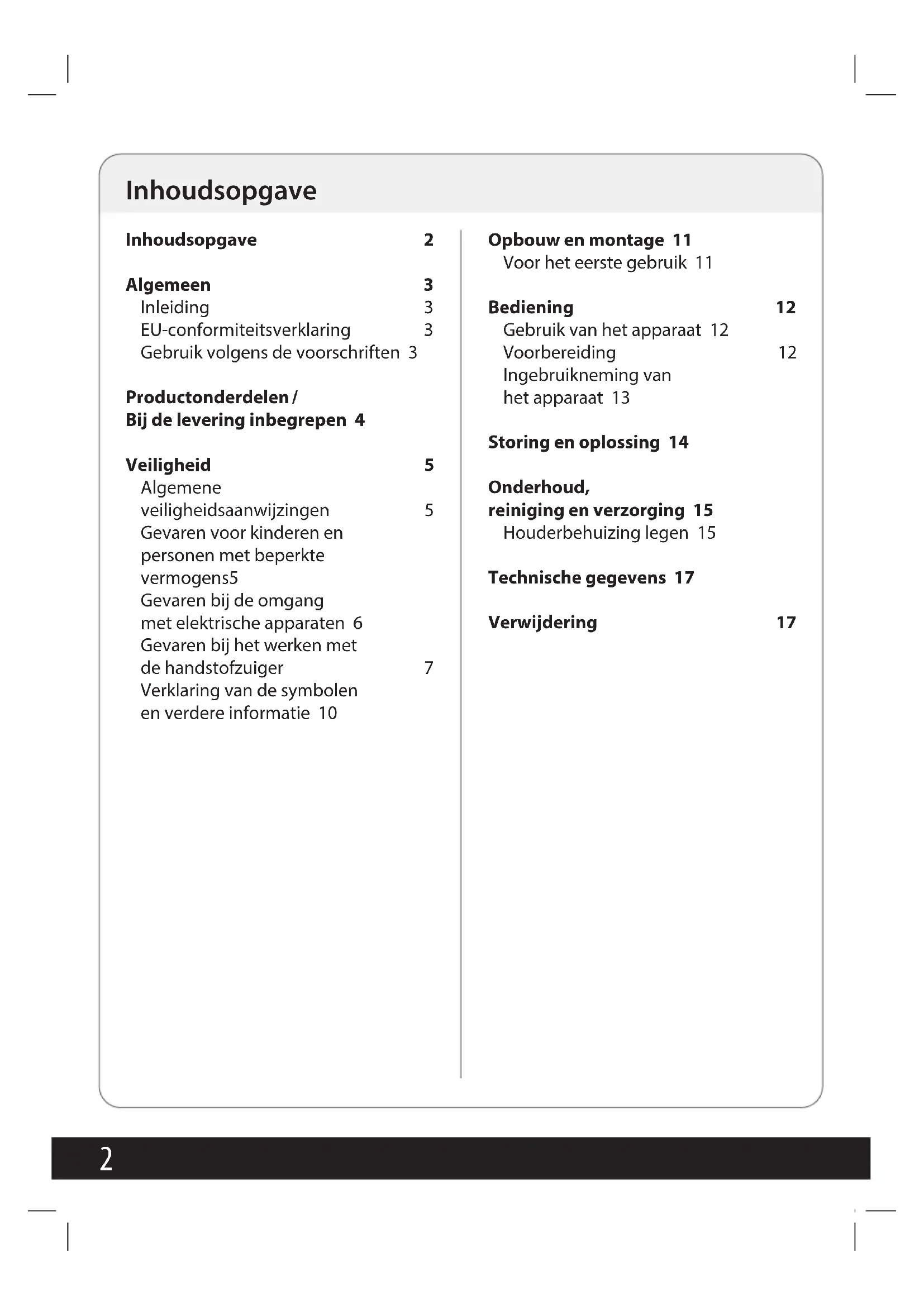 Inhoudsopgave 2 Algemeen 3 Inleiding 3 EU-conformiteitsverklaring 3 Gebruik volgens de voorschriften 3 Productonderdelen / Bij de levering inbegrepen 4 Veiligheid 5 Algemene veiligheidsaanwijzingen 5 Gevaren voor kinderen en personen met beperkte vermogens 5 Gevaren bij de omgang met elektrische apparaten 6 Gevaren bij het werken met dehandstofzuiger 7 Verklaring van de symbolen en verdere informatie 10 Opbouw en montage 11 Voor het eerste gebruik 11 Bediening 12 Gebruik van het apparaat 12 Voorbereiding 12 Ingebruikneming van het apparaat 13 Storing en oplossing 14 Onderhoud, reiniging en verzorging 15 Houderbehuizing legen 15 Technische gegevens 17 Verwijdering 17 Inhoudsopgave3