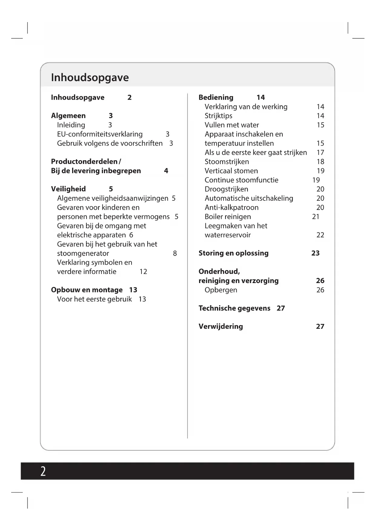 Inhoudsopgave 2 Algemeen 3 Inleiding 3 EU-conformiteitsverklaring 3 Gebruik volgens de voorschriften 3 Productonderdelen / Bijdeleveringinbegrepen 4 Veiligheid 5 Algemene veiligheidsaanwijzingen 5 Gevaren voor kinderen en personenmet beperkte vermogens 5 Gevaren bij de omgang met elektrische apparaten 6 Gevaren bij het gebruik van het stoomgenerator 8 Verklaring symbolen en verdereinformatie 12 Opbouw en montage 13 Voor het eerste gebruik 13 Bediening 14 Verklaring van de werking 14 Strijktips 14 Vullen met water 15 Apparaat inschakelen en temperatuur instellen 15 Als u de eerste keer gaat strijken 17 Stoomstrijken 18 Verticaal stomen 19 Continue stoomfunctie 19 Droogstrijken 20 Automatische uitschakeling 20 Anti-kalkpatroon 20 Boiler reinigen 21 Leegmaken van het waterreservoir 22 Storing en oplossing 23 Onderhoud, reinigingenverzorging 26 Opbergen 26 Technische gegevens 27 Verwijdering 27 Inhoudsopgave3