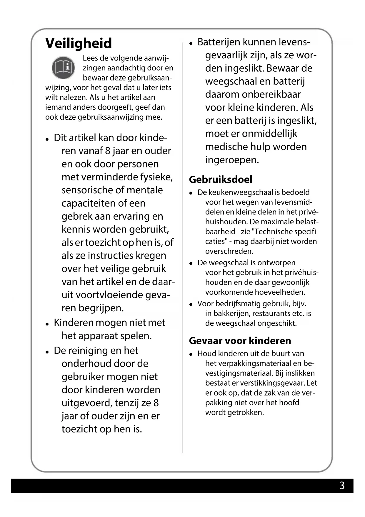 - Conformiteitsverklaring Levering z Keukenweegschaal z Batterij 1x CR2032 / 3V (Knoopcel) z Gebruiksaanwijzing z Garantiebewijs3 Veiligheid Lees de volgende aanwij- zingen aandachtig door en bewaar deze gebruiksaan- wijzing, voor het geval dat u later iets wilt nalezen. Als u het artikel aan iemand anders doorgeeft, geef dan ook deze gebruiksaanwijzing mee. z Dit artikel kan door kinde- ren vanaf 8 jaar en ouder en ook door personen met verminderde fysieke, sensorische of mentale capaciteiten of een gebrek aan ervaring en kennis worden gebruikt, als er toezicht op hen is, of als ze instructies kregen over het veilige gebruik van het artikel en de daar- uit voortvloeiende geva- ren begrijpen. z Kinderen mogen niet met het apparaat spelen. z De reiniging en het onderhoud door de gebruiker mogen niet door kinderen worden uitgevoerd, tenzij ze 8 jaar of ouder zijn en er toezicht op hen is. z Batterijen kunnen levens- gevaarlijk zijn, als ze wor- den ingeslikt. Bewaar de weegschaal en batterij daarom onbereikbaar voor kleine kinderen. Als er een batterij is ingeslikt, moet er onmiddellijk medische hulp worden ingeroepen. Gebruiksdoel z De keukenweegschaal is bedoeld voor het wegen van levensmid- delen en kleine delen in het privé- huishouden. De maximale belast- baarheid - zie "Technische specifi- caties" - mag daarbij niet worden overschreden. z De weegschaal is ontworpen voor het gebruik in het privéhuis- houden en de daar gewoonlijk voorkomende hoeveelheden. z Voor bedrijfsmatig gebruik, bijv. in bakkerijen, restaurants etc. is de weegschaal ongeschikt. Gevaar voor kinderen z Houd kinderen uit de buurt van het verpakkingsmateriaal en be- vestigingsmateriaal. Bij inslikken bestaat er verstikkingsgevaar. Let er ook op, dat de zak van de ver- pakking niet over het hoofd wordt getrokken.4 Gevaar voor letsels z Let op: explosiegevaar bij ondes- kundig vervangen van de batterij. Vervang alleen door hetzelfde of een gelijkwaardig batterijtype. Let op de "Technische specifica- ties". z De batterijen mogen niet worden opgeladen, niet met andere mid- delen worden gereactiveerd, niet uit elkaar worden genomen, niet in het vuur worden gegooid, niet worden verhit of worden kortge- sloten. Anders bestaat er een ver- hoogd risico op explosie en leeg- lopen, bovendien kunnen er gas- sen ontsnappen! z Contact met huid, ogen en slijm- vliezen vermijden. Bij contact met batterijzuur moet u de getroffen plaatsen onmiddellijk met over- vloedig schoon water afspoelen en onmiddellijk een arts raadple- gen. Let op - materiële schade z De keukenweegschaal mag niet in water of andere vloeistoffen worden gedompeld. z Zet de weegschaal op een stabie- le, vlakke ondergrond. z Overbelast de weegschaal niet. Let op de "Technische specifica- ties". z Leg voorwerpen uitsluitend op de weegschaal om ze te wegen. z Zet de weegschaal niet in de buurt van apparaten, van welke elektromagnetische straling kan uitgaan, zoals mobiele telefoons, zendontvangapparaten, o. d. Dit kan leiden tot verkeerde display- weergaven of functiestoornissen. z Aan de onderkant van de weeg- schaal bevinden zich de voetjes van het apparaat. Omdat meubel, resp. vloeroppervlakken uit de meest verschillende materialen bestaan en met de meest uiteen- lopende onderhoudsmiddelen behandeld worden, kan niet hele- maal worden uitgesloten, dat sommige van deze stoffen be- standdelen bevatten, die de voet- jes van het apparaat aantasten en zacht maken. Leg eventueel een antislip ondergrond onder de voetjes van het apparaat. z Neem de batterij uit het apparaat, als deze verbruikt is of als u de weegschaal niet langer gebruikt. Zo vermijdt u schades, die door leeglopen kunnen ontstaan. z Stel batterijen niet bloot aan bui- tengewone omstandigheden, door deze bijv. op radiatoren of onder directe zonnestraling te bewaren. Verhoogd leeglooprisico! z Reinig batterij- en apparaatcon- tacten zo nodig voordat u er de batterij inlegt. z Voer ook geen veranderingen uit aan het apparaat. Laat reparaties alleen door een vakwerkplaats uitvoeren en houd u aan de ga- rantievoorwaarden. z Gebruik in geen geval harde, kras- sende of schurende reinigings- middelen o. d. om de weegschaal te reinigen. Hierbij kan het opper- vlak worden bekrast.5 Onderdelen en bedieningselementen Ingebruikname Bij levering is de batterij er al ingelegd en van een ISO-strookje voorzien als be- scherming tegen vroegtijdige ontlading. Om de weegschaal in gebruik te nemen, 1 Uitsparing voor ophanging 2 Weegschaal met Tap on-functie om deze in te schakelen 3 Toets TARE: Waarden op nul zetten (bijweegfunctie) 4 Display 5 Toets MODE: Omschakelen tussen vaste en vloeibare weegwaren en maateenheden 6 Batterijvak (onderkant) p. 11
