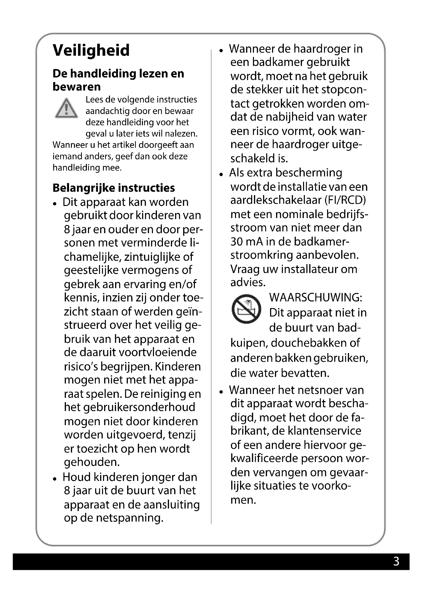 et gebruikersonderhoud mogen niet door kinderen worden uitgevoerd, tenzij er toezicht op hen wordt gehouden. Houd kinderen jonger dan 8 jaar uit de buurt van het apparaat en de aansluiting op de netspanning. Wanneer de haardroger in een badkamer gebruikt wordt, moet na het gebruik de stekker uit het stopcon- tact getrokken worden om- dat de nabijheid van water een risico vormt, ook wan- neer de haardroger uitge- schakeld is. Als extra bescherming wordt de installatie van een aardlekschakelaar (FI/RCD) met een nominale bedrijfs- stroom van niet meer dan 30 mA in de badkamer- stroomkring aanbevolen. Vraag uw installateur om advies. WAARSCHUWING: Dit apparaat niet in de buurt van bad- kuipen, douchebakken of anderen bakken gebruiken, die water bevatten. Wanneer het netsnoer van dit apparaat wordt bescha- digd, moet het door de fa- brikant, de klantenservice