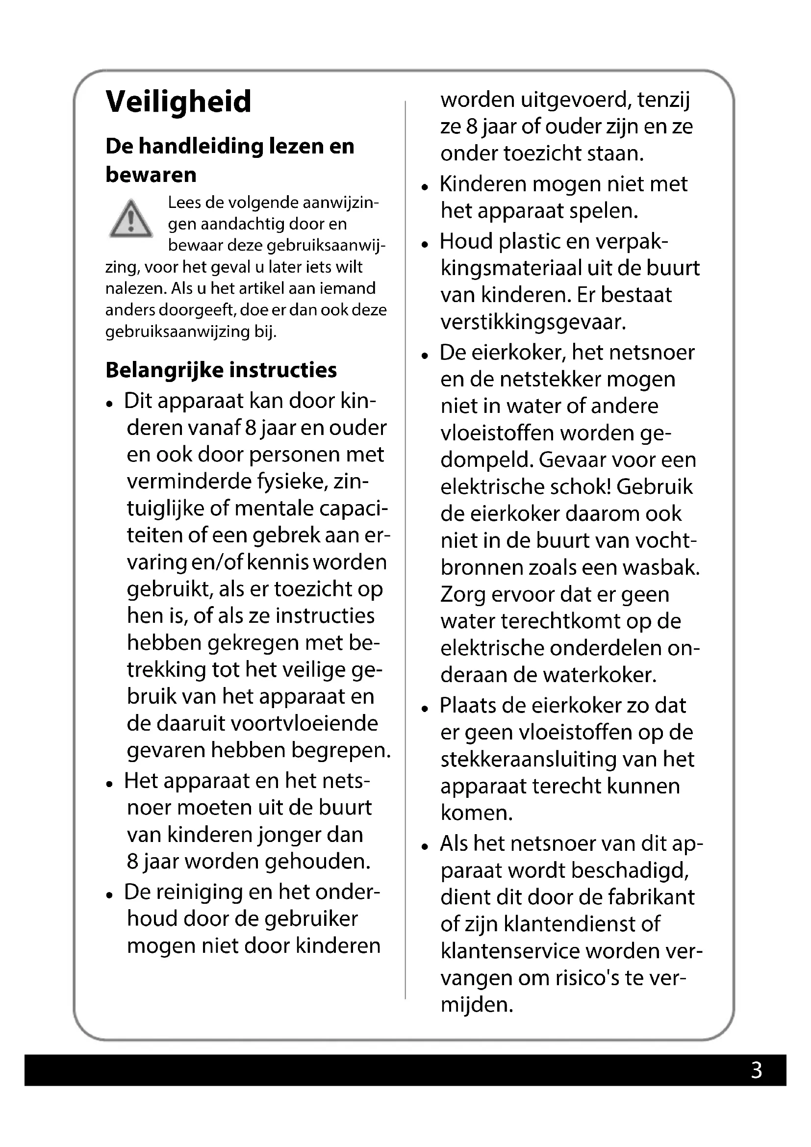 - Afvoer Inhoud van de levering z Eierkoker met maatbekerz Gebruiksaanwijzingz Garantiekaart Druckbuch Eierkocher BEL.book Seite 2 Freitag, 28. September 2018 1:18 133 Veiligheid De handleiding lezen en bewaren Lees de volgende aanwijzin- gen aandachtig door en bewaar deze gebruiksaanwij- zing, voor het geval u later iets wilt nalezen. Als u het artikel aan iemand anders doorgeeft, doe er dan ook deze gebruiksaanwijzing bij. Belangrijke instructies z Dit apparaat kan door kin- deren vanaf 8 jaar en ouder en ook door personen met verminderde fysieke, zin- tuiglijke of mentale capaci- teiten of een gebrek aan er- varing en/of kennis worden gebruikt, als er toezicht op hen is, of als ze instructies hebben gekregen met be- trekking tot het veilige ge- bruik van het apparaat en de daaruit voortvloeiende gevaren hebben begrepen. z Het apparaat en het nets- noer moeten uit de buurt van kinderen jonger dan 8 jaar worden gehouden. z De reiniging en het onder- houd door de gebruiker mogen niet door kinderen worden uitgevoerd, tenzij ze 8 jaar of ouder zijn en ze onder toezicht staan. z Kinderen mogen niet met het apparaat spelen. z Houd plastic en verpak- kingsmateriaal uit de buurt van kinderen. Er bestaat verstikkingsgevaar. z De eierkoker, het netsnoer en de netstekker mogen niet in water of andere vloeistoffen worden ge- dompeld. Gevaar voor een elektrische schok! Gebruik de eierkoker daarom ook niet in de buurt van vocht- bronnen zoals een wasbak. Zorg ervoor dat er geen water terechtkomt op de elektrische onderdelen on- deraan de waterkoker. z Plaats de eierkoker zo dat er geen vloeistoffen op de stekkeraansluiting van het apparaat terecht kunnen komen. z Als het netsnoer van dit ap- paraat wordt beschadigd, dient dit door de fabrikant of zijn klantendienst of klantenservice worden ver- vangen om risico's te ver- mijden. Druckbuch Eierkocher BEL.book Seite 3 Freitag, 28. September 2018 1:18 134 z Het apparaat mag niet aan een tijdschakelklok, een dimschakelaar of aan een ander op afstand werkend systeem worden aangeslo- ten. z Gebruik het apparaat al- leen zoals beschreven in deze handleiding. Anders bestaat er kans op letsel! Gebruik volgens de voorschriften z Deze eierkoker is uitslui- tend bestemd voor het be- reiden van kippeneieren. z Het apparaat is ontworpen voor gebruik in het privé- huishouden en de daar ge- woonlijk voorkomende hoeveelheden. De eierko- ker is niet geschikt voor za- kelijk of huishoudelijk ge- bruik in keukens voor me- dewerkers in winkels, kantoren en op andere za- kelijke terreinen, in agrari- sche hoeven, door klanten in hotels, motels of andere wooninstellingen of in bed- and-breakfast-pensions. Gevaar door elektriciteit z Bedien het apparaat niet met natte handen. z Gebruik het apparaat niet in de openlucht. z Sluit het apparaat aan op een naar behoren geïnstalleerd stopcontact met randaarding, waarvan de span- ning voldoet aan de 'Technische specificaties'. z Let erop dat het stopcontact goed toegankelijk is zodat u de netstek- ker er zo nodig snel kunt uittrekken. z Schakel die eierkoker steeds uit voordat u deze met water vult. z Gebruik de eierkoker niet zonder dat er toezicht is. z Gebruik het apparaat niet: – als de eierkoker of delen ervan beschadigd zijn, – als het netsnoer of de stekker beschadigd is, – als de eierkoker op de grond gevallen is. z Wikkel het netsnoer voor elk gebruik helemaal af. Let er daarbij op dat het netsnoer niet door scher- pe randen of hete voorwerpen wordt beschadigd. z Trek de stekker uit het stopcontact: – wanneer u de eierkoker niet gebruikt, – na elk gebruik, – voordat u het apparaat schoon- maakt of wegzet, – als er tijdens het gebruik kenne- lijk een storing optreedt, – bij onweer. – Trek daarbij steeds aan de stek- ker, niet aan het snoer. Druckbuch Eierkocher BEL.book Seite 4 Freitag, 28. September 2018 1:18 135 z Breng geen veranderingen aan het apparaat of aan het netsnoer aan. Laat reparaties alleen door een vak- werkplaats uitvoeren. Niet vakkun- dig gerepareerde apparaten bren- gen de gebruiker in gevaar. Houd u ook aan de bijgevoegde garantie- voorwaarden. z Gebruik geen verlengsnoer. Gevaar voor verbrandingen/ brandwonden en brand z Tijdens het gebruik ontsnapt hete stoom uit de stoomuitlaatopening. Vermijd contact met de hete stoom. Gevaar voor brandwonden! z Raak de hete delen van de eierkoker tijdens het gebruik niet aan met blote handen. Gebruik altijd ther- misch geïsoleerde kookhandschoe- nen of pannenlappen om de eierko- ker en de accessoires aan te raken. Wijs ook andere gebruikers op de gevaren. z Houd er rekening mee dat er ook na het uitschakelen van de eierkoker hete stoom kan ontsnappen of dat afzonderlijke delen nog heet kun- nen zijn. Laat de eierkoker helemaal afkoelen, voordat u hem schoon- maakt of opbergt. z Nadat het signaal klinkt dient u op hete stoom te letten bij het verwij- deren van het deksel en het eierrek- je. Draag indien mogelijk keuken- handschoenen of iets dergelijks. Waarschuwing - gevaar voor verwonding z Voorzichtig zijn bij het aanprikken van de eieren of het schoonmaken van de maatbeker. De eierprikker is erg scherp. Opmerking - materiële schade z Giet bij gebruik water in de verwar- mingsschaal, maar nooit vloeistof in de eierkoker. z Zet het apparaat op een stabiele en vlakke ondergrond. Let daarbij op een voldoende grote afstand tot sterke warmtebronnen zoals kook- platen, verwarmingsbuizen e.a. Het netsnoer moet goed in de kabeluit- sparing van de sokkel liggen zodat de sokkel veilig staat. z Zet het apparaat dan zo neer dat de bij het gebruik optredende hete waterdamp goed kan wegtrekken. Zet de eierkoker niet onder een hangkast of een rek en draai de stoomuitlaatopening weg van gevoelige oppervlakken of behang. Houd ook afstand tot gemakkelijk brandbare materialen zoals bijv. gordijnen of tafelkleden. z Gebruik de eierkoker niet meer wanneer de kunststofcomponen- ten van de eierkoker scheuren of barsten vertonen of vervormd zijn. Vervang beschadigd