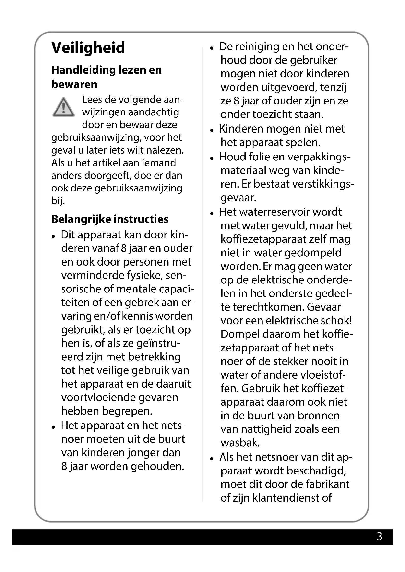 - Technische specificaties Druckbuch Kaffeemaschine BEL.book Seite 2 Freitag, 6. April 2018 2:37 143 Veiligheid Handleiding lezen en bewaren Lees de volgende aan- wijzingen aandachtig door en bewaar deze gebruiksaanwijzing, voor het geval u later iets wilt nalezen. Als u het artikel aan iemand anders doorgeeft, doe er dan ook deze gebruiksaanwijzing bij. Belangrijke instructies z Dit apparaat kan door kin- deren vanaf 8 jaar en ouder en ook door personen met verminderde fysieke, sen- sorische of mentale capaci- teiten of een gebrek aan er- varing en/of kennis worden gebruikt, als er toezicht op hen is, of als ze geïnstru- eerd zijn met betrekking tot het veilige gebruik van het apparaat en de daaruit voortvloeiende gevaren hebben begrepen. z Het apparaat en het nets- noer moeten uit de buurt van kinderen jonger dan 8 jaar worden gehouden. z De reiniging en het onder- houd door de gebruiker mogen niet door kinderen worden uitgevoerd, tenzij ze 8 jaar of ouder zijn en ze onder toezicht staan. z Kinderen mogen niet met het apparaat spelen. z Houd folie en verpakkings- materiaal weg van kinde- ren. Er bestaat verstikkings- gevaar. z Het waterreservoir wordt met water gevuld, maar het koffiezetapparaat zelf mag niet in water gedompeld worden. Er mag geen water op de elektrische onderde- len in het onderste gedeel- te terechtkomen. Gevaar voor een elektrische schok! Dompel daarom het koffie- zetapparaat of het nets- noer of de stekker nooit in water of andere vloeistof- fen. Gebruik het koffiezet- apparaat daarom ook niet in de buurt van bronnen van nattigheid zoals een wasbak. z Als het netsnoer van dit ap- paraat wordt beschadigd, moet dit door de fabrikant of zijn klantendienst of Druckbuch Kaffeemaschine BEL.book Seite 3 Freitag, 6. April 2018 2:37 144 klantenservice worden ver- vangen, om risico's te ver- mijden. z Het koffiezetapparaat mag niet op een tijdschakelklok, een schemeringsschake- laar of op een ander op af- stand werkend systeem worden aangesloten. Voorschriftmatig gebruik z Dit koffiezetapparaat is uit- sluitend bedoeld om koffie te zetten. Daarvoor mag al- leen gemalen koffie wor- den gebruikt. z Voor het koffiezetapparaat zijn filterzakjes maat 1x4 nodig. z Het koffiezetapparaat is ontworpen voor gebruik in het privéhuishouden en de daar gewoonlijk gebruikte hoeveelheden. Het koffie- zetapparaat is ongeschikt voor zakelijk of huishoude- lijk gebruik in keukens voor medewerkers in winkels, kantoren en op andere za- kelijke terreinen, in agrari- sche hoeven, door klanten in hotels, motels of andere wooninstellingen of in bed- and-breakfast-pensions. Gevaar door elektriciteit z Bedien het apparaat niet met natte handen. z Gebruik het apparaat niet in de openlucht. z Sluit het apparaat aan op een naar behoren geïnstalleerd stopcontact, waarvan de spanning voldoet aan de 'Technische specificaties'. z Let erop, dat het stopcontact goed toegankelijk is, zodat u de netstek- ker er zo nodig snel kunt uittrekken. z Zet het koffiezetapparaat niet aan zonder dat er toezicht is. z Gebruik het apparaat niet: – als het apparaat zelf of onderde- len ervan beschadigd zijn, – als het netsnoer of de stekker be- schadigd is, – als het apparaat gevallen is. z Wikkel het netsnoer voor elk ge- bruik helemaal af. Let er daarbij op, dat het netsnoer niet door scherpe randen of hete voorwerpen wordt beschadigd. z Trek de stekker uit het stopcontact: – als u het koffiezetapparaat niet gebruikt, – na elk gebruik, – voordat u het apparaat schoon- maakt of wegzet, – als er tijdens het gebruik kenne- lijk een storing optreedt, – bij onweer. – Trek daarbij steeds aan de stek- ker, niet aan het snoer. Druckbuch Kaffeemaschine BEL.book Seite 4 Freitag, 6. April 2018 2:37 145 z Breng geen veranderingen aan aan het apparaat of aan het netsnoer. Laat reparaties alleen door een vak- werkplaats uitvoeren, omdat niet vakkundig gerepareerde apparaten de gebruiker in gevaar brengen. Houd u ook aan de bijgevoegde ga- rantievoorwaarden. z Gebruik geen verlengsnoer. Gevaar voor verbrandingen/ brandwonden z Raak het hete koffiefilter niet aan. Neem het filter er pas uit, als de vloeistof helemaal is weggelopen en het filter is afgekoeld. z Vers gezette koffie is heet. Wees voorzichtig bij het inschenken of omvullen. Gevaar voor letsels z De glazen kan van het koffiezetap- paraat is niet geschikt voor de mag- netron. Letselgevaar door glassplin- ters! Aanwijzing - materiële schade z Gebruik het koffiezetapparaat uit- sluitend me de originele accessoi- res. Gebruik bijv. uitsluitend de meegeleverde kan, om met dit kof- fiezetapparaat koffie te zetten. z Schenk uitsluitend koud water in het waterreservoir. Mineraalwater of andere koolzuurhoudende vloei- stoffen mogen niet worden ge- bruikt. z Zet het koffiezetapparaat op een stabiele, vlakke ondergrond. Let daarbij op een voldoende grote af- stand tot sterke warmtebronnen zoals kookplaten, verwarmingsbui- zen e. d. z Aan de onderkant van het koffiezet- apparaat zitten rubberen voeten. Omdat oppervlakken uit de meeste verschillende materialen bestaan en met de meest uiteenlopende verzorgingsmiddelen worden be- handeld, kan niet helemaal worden uitgesloten, dat sommige van deze stoffen bestanddelen bevatten die de rubberen voeten aantasten en zacht maken. Leg eventueel een niet-slippende onderlaag onder het koffiezetapparaat. z Houd de koffiekan vast, als u het koffiezetapparaat verplaatst of wegruimt. De koffiekan staat slechts los op de verwarmingsplaat. z Reinig het koffiezetapparaat niet met harde, krassende of schurende reinigingsmiddelen, staalwol o. d. Druckbuch Kaffeemaschine BEL.book Seite 5 Freitag, 6. April 2018 2:37 146 Onderdelen en bedieningselementen Prog On/Off Auto Run Minute Hour CLOCK MAX p. 15