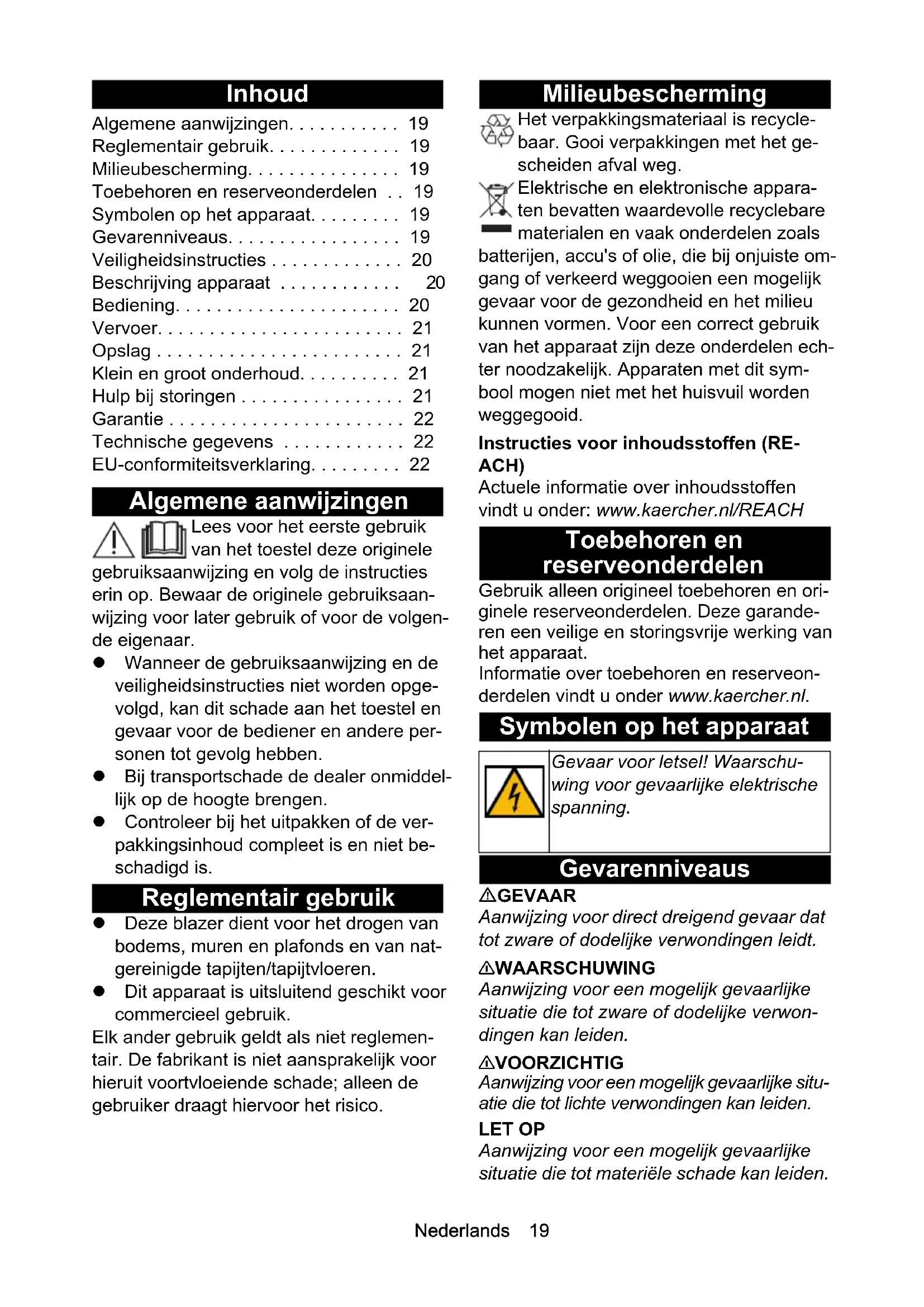 - Lunghezza cavo (UE) m 7,5 Chairman of the Board of Management Director Regulatory Affairs & CertificationNederlands 19 Inhoud Algemene aanwijzingen Lees voor het eerste gebruik van het toestel deze originele gebruiksaanwijzing en volg de instructies erin op. Bewaar de originele gebruiksaan- wijzing voor later gebruik of voor de volgen- de eigenaar. Wanneer de gebruiksaanwijzing en de veiligheidsinstructies niet worden opge- volgd, kan dit schade aan het toestel en gevaar voor de bediener en andere per- sonen tot gevolg hebben. Bij transportschade de dealer onmiddel- lijk op de hoogte brengen. Controleer bij het uitpakken of de ver- pakkingsinhoud compleet is en niet be- schadigd is. Reglementair gebruik Deze blazer dient voor het drogen van bodems, muren en plafonds en van nat- gereinigde tapijten/tapijtvloeren. Dit apparaat is uitsluitend geschikt voor commercieel gebruik. Elk ander gebruik geldt als niet reglemen- tair. De fabrikant is niet aansprakelijk voor hieruit voortvloeiende schade; alleen de gebruiker draagt hiervoor het risico. Milieubescherming Het verpakkingsmateriaal is recycle- baar. Gooi verpakkingen met het ge- scheiden afval weg. Elektrische en elektronische appara- ten bevatten waardevolle recyclebare materialen en vaak onderdelen zoals batterijen, accu's of olie, die bij onjuiste om- gang of verkeerd weggooien een mogelijk gevaar voor de gezondheid en het milieu kunnen vormen. Voor een correct gebruik van het apparaat zijn deze onderdelen ech- ter noodzakelijk. Apparaten met dit sym- bool mogen niet met het huisvuil worden weggegooid. Instructies voor inhoudsstoffen (RE- ACH) Actuele informatie over inhoudsstoffen vindt u onder: www.kaercher.nl/REACH Toebehoren en reserveonderdelen Gebruik alleen origineel toebehoren en ori- ginele reserveonderdelen. Deze garande- ren een veilige en storingsvrije werking van het apparaat. Informatie over toebehoren en reserveon- derdelen vindt u onder www.kaercher.nl. Symbolen op het apparaat Gevarenniveaus GEVAAR Aanwijzing voor direct dreigend gevaar dat tot zware of dodelijke verwondingen leidt. 몇 WAARSCHUWING Aanwijzing voor een mogelijk gevaarlijke situatie die tot zware of dodelijke verwon- dingen kan leiden. 몇 VOORZICHTIG Aanwijzing voor een mogelijk gevaarlijke situ- atie die tot lichte verwondingen kan leiden. LET OP Aanwijzing voor een mogelijk gevaarlijke situatie die tot materiële schade kan leiden. Algemene aanwijzingen p. 19