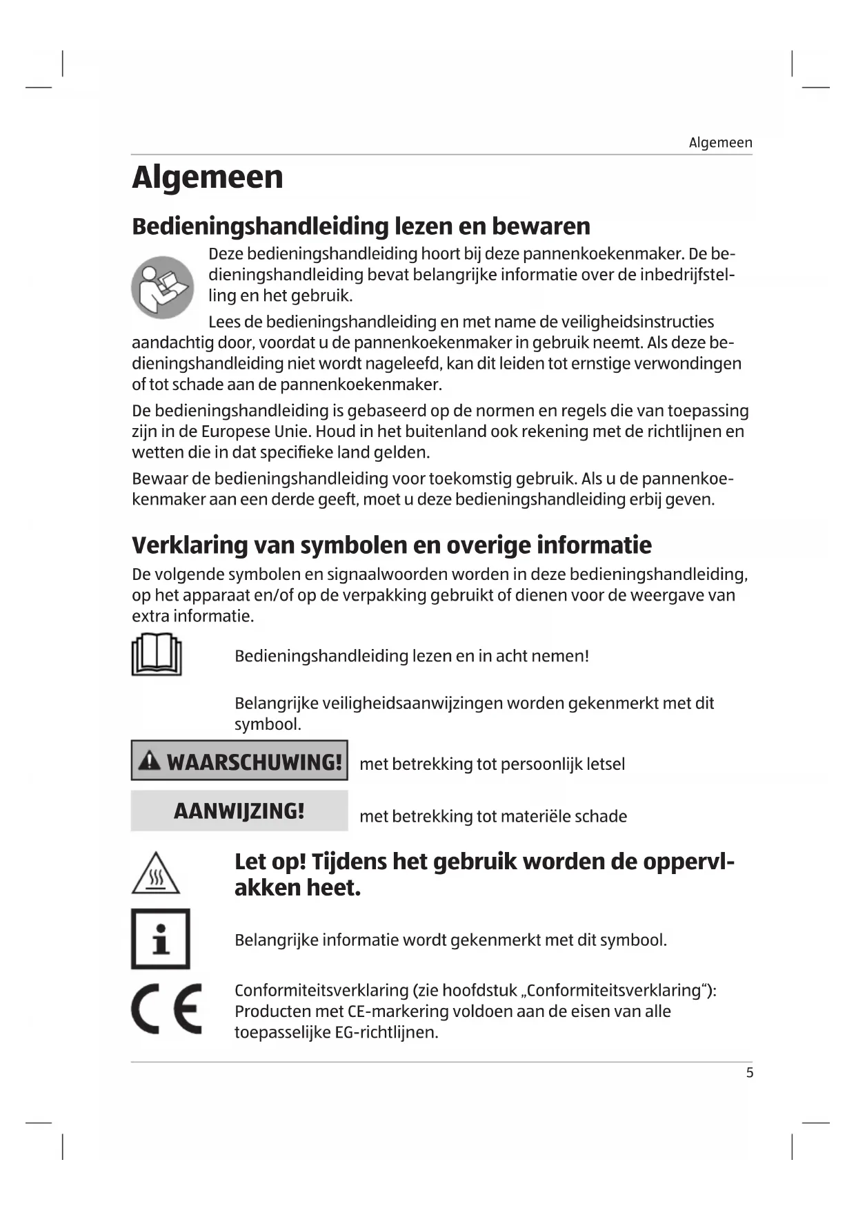 - Apparaat verwijderen Inhoudsopgave5 Algemeen Algemeen Bedieningshandleiding lezen en bewaren Deze bedieningshandleiding hoort bij deze pannenkoekenmaker. De be- dieningshandleiding bevat belangrijke informatie over de inbedrijfstel- ling en het gebruik. Lees de bedieningshandleiding en met name de veiligheidsinstructies aandachtig door, voordat u de pannenkoekenmaker in gebruik neemt. Als deze be- dieningshandleiding niet wordt nageleefd, kan dit leiden tot ernstige verwondingen of tot schade aan de pannenkoekenmaker. De bedieningshandleiding is gebaseerd op de normen en regels die van toepassing zijn in de Europese Unie. Houd in het buitenland ook rekening met de richtlijnen en wetten die in dat specifieke land gelden. Bewaar de bedieningshandleiding voor toekomstig gebruik. Als u de pannenkoe- kenmaker aan een derde geeft, moet u deze bedieningshandleiding erbij geven. Verklaring van symbolen en overige informatie De volgende symbolen en signaalwoorden worden in deze bedieningshandleiding, op het apparaat en/of op de verpakking gebruikt of dienen voor de weergave van extra informatie. Bedieningshandleiding lezen en in acht nemen! Belangrijke veiligheidsaanwijzingen worden gekenmerkt met dit symbool. WAARSCHUWING! met betrekking tot persoonlijk letsel AANWIJZING! met betrekking tot materiële schade Let op! Tijdens het gebruik worden de oppervl- akken heet. Belangrijke informatie wordt gekenmerkt met ditsymbool. Conformiteitsverklaring (zie hoofdstuk „Conformiteitsverklaring“): Producten met CE-markering voldoen aan de eisen van alle toepasselijke EG-richtlijnen.6 Algemeen/Veiligheid ID 1111239849 Het zegel “Veiligheid getest” bevestigt dat dit apparaat veilig is bij het gebruik waarvoor het is bedoeld. Het apparaat voldoet aan de eisen van de Duitse wet op productveiligheid. Dit wordt aangetoond met het GS-teken van het onafhankelijke testinstituut Dit symbool wijst op speciale voorschriften voor de verwijdering van oude apparaten (zie hoofdstuk "Afvalverwijdering"). Veiligheid Gebruik volgens de voorschriften Het apparaat is uitsluitend geschikt voor de bereiding van crê- pes/pannenkoeken. Bovendien is het apparaat niet bestemd voor commercieel gebruik, maar uitsluitend voor gebruik in de privéhuishouding, maar niet in keukens voor medewerkers in winkels, kantoren en andere commerciële bedrijven, niet in agrarische bedrijven en niet door klanten in hotels, motels en andere wooninstellingen of ontbijtpensions. Iedere andere toepassing van of wijziging aan het apparaat is niet volgens de voorschriften en is principieel verboden. Voor schade die ontstaan is door niet reglementair gebruik of een verkeerde bediening, kan geen aansprakelijkheid geaccepteerd worden.7 Veiligheid Veiligheids aanwijzingen WAARSCHUWING! Lees alle onderstaande veiligheidsaanwijzingen zorgvuldig en neem deze in acht. Bij het niet in acht nemen bestaat er gevaar voor ernstige ongelukken en verwondingen en het risico voor materiële schade en schade aan het apparaat. Gevaren voor kinderen en personen met beperkte vermogens - Dit apparaat kan gebruikt worden door kinderen van 8jaar en ouder en door personen met beperkte fysieke, sensori- sche of mentale vermogens of gebrek aan ervaring en/of kennis, als ze onder toezicht staan of geïnstrueerd werden over het veilige gebruik van het apparaat en de eventueel daaruit voortkomende gevaren begrepen hebben. - Het reinigen en het onderhoud door de gebruiker mogen niet uitgevoerd worden door kinderen, tenzij ze 8 jaar of ouder zijn en onder toezicht staan. Het apparaat en zijn aansluitsnoer moeten bij kinderen jonger dan 8 jaar uit de buurt gehouden worden. - Kinderen mogen niet met het apparaat spelen. Kinderen herkennen het gevaar niet dat ontstaan kan bij het omgaan met elektrische apparaten. Gebruik en bewaar het apparaat daarom buiten het bereik van kinderen jonger dan 8jaar. Laat het snoer niet naar beneden hangen, zodat er niet aan getrokken kan worden. - Houd het verpakkings materiaal verwijderd van kinderen verstikkings gevaar!8 Veiligheid Gevaren bij de omgang met elektrische apparaten - Sluit het apparaat alleen aan een volgens de voorschriften geïnstalleerd, geaard stopcontact aan met een netspanning die in overeenstemming is met de opgave op het typeplaatje. - Als het snoer beschadigd is, mag dit alleen vervangen wor- den door een door de fabrikant genoemd servicestation om gevaar voor letsel en ongevallen of schade aan het apparaat te voorkomen. - Zorg er voor dat het stopcontact in de buurt zit van het appa- raat en goed bereikbaar is, zodat de stekker er in geval van storing snel uitgehaald kan worden. - Reparaties mogen alleen uitgevoerd worden door erkende werkplaatsen. Niet deskundig gerepareerde apparaten vor- men een gevaar voor de gebruiker. - Laat het apparaat niet zonder toezicht als het aanstaat om ongevallen te voorkomen. - Om ongelukken te voorkomen, mogen er nooit meerdere huishoudelijke apparaten aan hetzelfde geaarde stopcontact aangesloten worden (bijv. met een 3-weg stekker). - Dompel het apparaat nooit in water en gebruik het niet bui- ten, zodat het niet blootgesteld wordt aan regen of ander vocht! Gevaar voor een elektrische schok! - Indien het apparaat toch in het water gevallen zou zijn, trek dan eerst de stekker uit het stopcontact en haal dan het appa- raat eruit! Gebruik het apparaat daarna niet meer, maar laat het eerst controleren door een erkend servicestation. Dit geldt ook als het snoer of het apparaat beschadigd is of als het apparaat gevallen is. Gevaar voor een elektrische schok! - Haal altijd de stekker uit het stopcontact als het apparaat niet gebruikt wordt en voor iedere reiniging of bij storingen! Nooit aan het snoer trekken! Gevaar voor een elektrische schok! - Let erop dat het snoer of het apparaat nooit op hete opper- vlakken of in de buurt van warmtebronnen geplaatst wordt.9 Veiligheid Leg het snoer zo neer dat het niet in contact komt met hete of scherpe voorwerpen. Gevaar voor een elektrische schok! - 