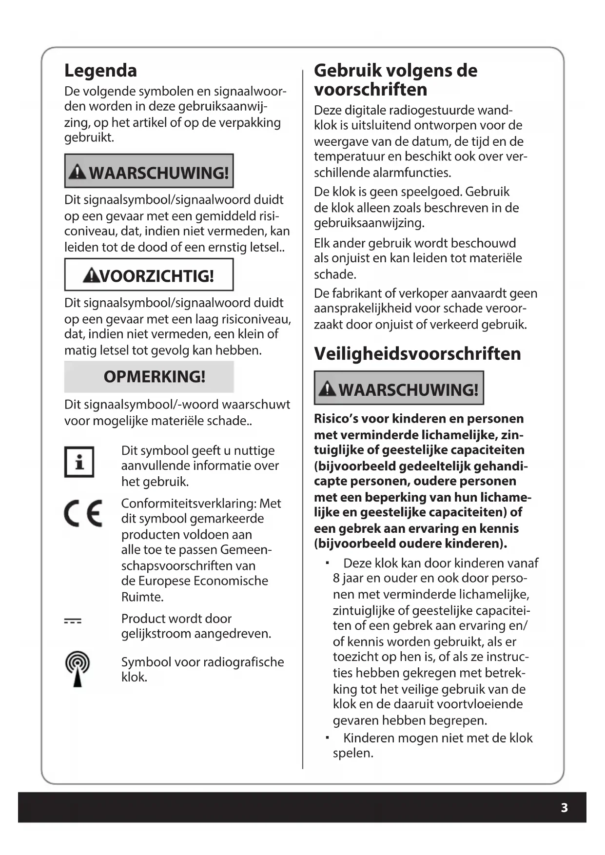 Legenda De volgende symbolen en signaalwoor- den worden in deze gebruiksaanwij- zing, op het artikel of op de verpakking gebruikt. WAARSCHUWING! Dit signaalsymbool/signaalwoord duidt op een gevaar met een gemiddeld risi- coniveau, dat, indien niet vermeden, kan leiden tot de dood of een ernstig letsel.. VOORZICHTIG! Dit signaalsymbool/signaalwoord duidt op een gevaar met een laag risiconiveau, dat, indien niet vermeden, een klein of matig letsel tot gevolg kan hebben. OPMERKING! Dit signaalsymbool/-woord waarschuwt voor mogelijke materiële schade.. Dit symbool geeft u nuttige aanvullende informatie over het gebruik. Conformiteitsverklaring: Met dit symbool gemarkeerde producten voldoen aan alle toe te passen Gemeen- schapsvoorschriften van de Europese Economische Ruimte. Product wordt door gelijkstroom aangedreven. Symbool voor radiografische klok. Gebruik volgens de voorschriften Deze digitale radiogestuurde wand- klok is uitsluitend ontworpen voor de weergave van de datum, de tijd en de temperatuur en beschikt ook over ver- schillende alarmfuncties. De klok is geen speelgoed. Gebruik de klok alleen zoals beschreven in de gebruiksaanwijzing. Elk ander gebruik wordt beschouwd als onjuist en kan leiden tot materiële schade. De fabrikant of verkoper aanvaardt geen aansprakelijkheid voor schade veroor- zaakt door onjuist of verkeerd gebruik. Veiligheidsvoorschriften WAARSCHUWING! Risico’s voor kinderen en personen met verminderde lichamelijke, zin- tuiglijke of geestelijke capaciteiten (bijvoorbeeld gedeeltelijk gehandi- capte personen, oudere personen met een beperking van hun lichame- lijke en geestelijke capaciteiten) of een gebrek aan ervaring en kennis (bijvoorbeeld oudere kinderen). Deze klok kan door kinderen vanaf 8 jaar en ouder en ook door perso- nen met verminderde lichamelijke, zintuiglijke of geestelijke capacitei- ten of een gebrek aan ervaring en/ of kennis worden gebruikt, als er toezicht op hen is, of als ze instruc- ties hebben gekregen met betrek- king tot het veilige gebruik van de klok en de daaruit voortvloeiende gevaren hebben begrepen. Kinderen mogen niet met de klok spelen. Druckbuch BEL.indb 3Druckbuch BEL.indb 3 21.04.2020 11:28:5721.04.2020 11:28:574 Reiniging en onderhoud door de gebruiker mogen niet door kinde- ren worden uitgevoerd als er geen toezicht op hen is. Laat kinderen niet spelen met verpakkingsmateriaal, maar gooi het onmiddellijk weg. VOORZICHTIG! Explosie- en verbrandingsgevaar door zuur! Onjuist omgaan met de batterij kan lei- den tot letsels. Alleen vervanging door hetzelfde of een gelijkwaardig type (zie “Techni- sche specicaties”). Laad de batterijen niet opnieuw op en reactiveer de batterijen ook niet met andere middelen. Let bij het plaatsen van de batterijen op de juiste polariteit (+/-). Reinig indien nodig de batterij- en apparaatcontacten. Haal batterijen niet uit elkaar en bewaar de batterij op een koele, droge plaats. Laat de batterijen niet kortsluiten. Stel de batterijen niet bloot aan overmatige hitte (bijvoorbeeld direct zonlicht) en gooi ze niet in vuur. Bewaar de batterij niet in een omgeving met een zeer lage lucht- druk. Als het batterijvak niet meer veilig kan afgesloten worden, de klok niet meer gebruiken. Vermijd contact van batterijvloeistof met huid, ogen en slijmvliezen. Bij contact dient u de getroen gebie- den overvloedig met veel helder water te spoelen en onmiddellijk een arts te raadplegen. Batterijen kunnen levensgevaar- lijk zijn. Bewaar batterijen daarom onbereikbaar voor kleine kinderen. Indien een batterij werd ingeslikt of op een andere manier in een lichaam terechtkomt, dient u onmid- dellijk een arts te raadplegen. Haal lege batterijen uit het batterij- vak. Het risico bestaat dat batterij- vloeistof gaat lekken. Verwijder de batterij ook: - als u het artikel langere tijd niet gaat gebruiken, - voor u het artikel afvoert. OPMERKING! Gevaar voor schade! Oneigenlijk gebruik van de wekker kan leiden tot beschadigingen. Bescherm de klok tegen extreme hitte, zonlicht, stof, magnetische velden, chemicaliën en mechanische slijtage. Plaats de klok niet in de onmiddel- lijke nabijheid van open vuur zoals kaarsen. Laat het horloge niet vallen en stel het niet bloot aan sterke slagen. Dompel de klok niet onder in water of andere vloeistoen en bescherm ze tegen vocht. Inhoud van de levering Radiogestuurde wandklok 2x batterij LR03/R03 (AAA) Gebruiksaanwijzing Garantiekaart Druckbuch BEL.indb 4Druckbuch BEL.indb 4 21.04.2020 11:28:5721.04.2020 11:28:57Onderdelen en bedieningselementen Display 1 Seconden 2 Weergave zomertijd (DST) 3 Weergave radiosymbool 4 Weergave AM/PM 5 Uren 6 Minuten 7 Sluimerweergave* 8 Maanfase 9 Tijdzonesymbool 10 Alarmsymbool 11 Batterijniveau-indicator 12 Dag/maand ** 13 Maand/dag **