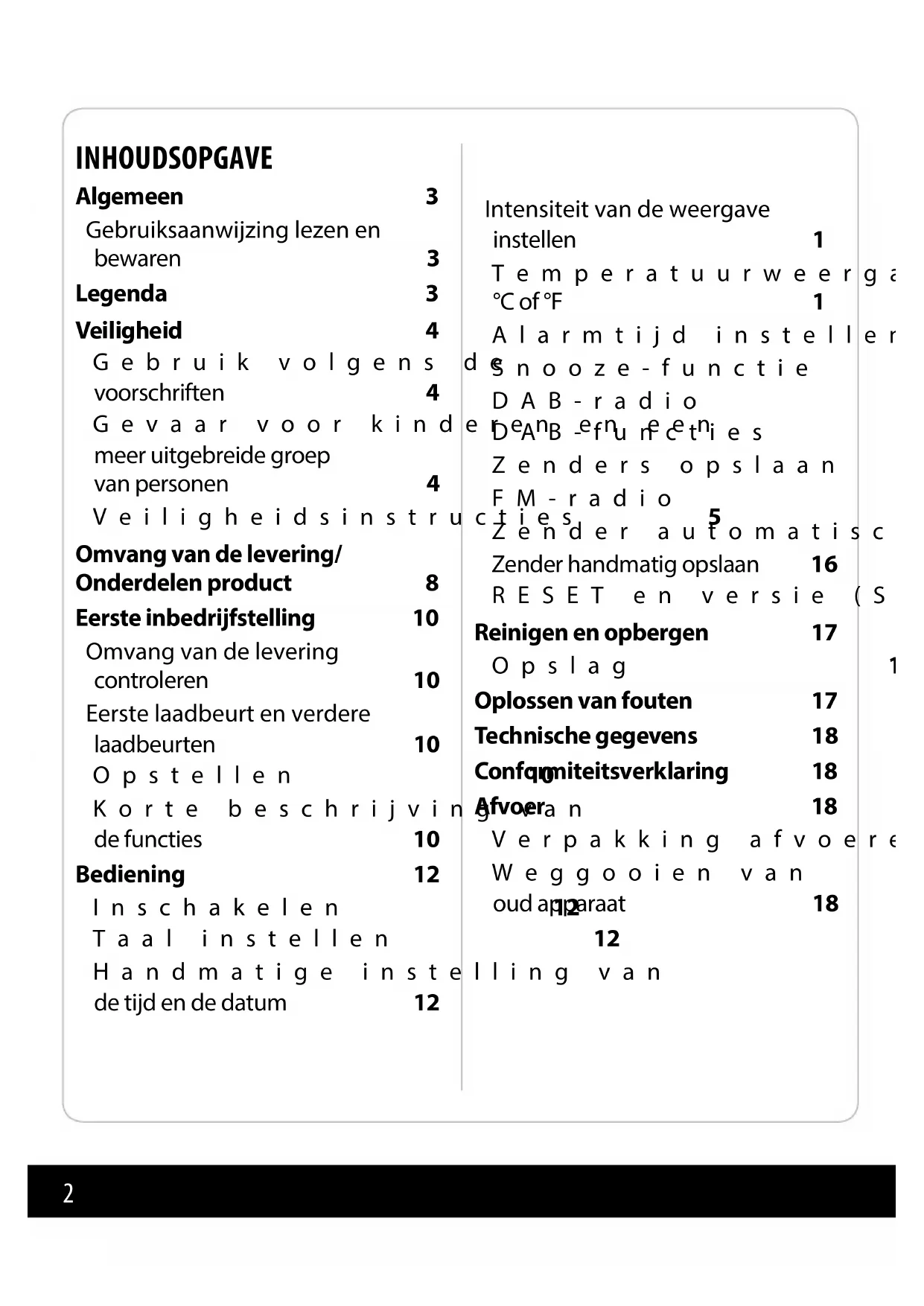 GEBRUIKSAANWIJZING (2-19) • MODE D’EMPLOI (20-37) • BEDIENUNGSANLEITUNG (38-53)2 Intensiteit van de weergave instellen 13 Temperatuurweergave °C of °F 13 Alarmtijd instellen 13 Snooze-functie 14 DAB-radio 14 DAB-functies 15 Zenders opslaan 15 FM-radio 16 Zender automatisch opslaan 16 Zender handmatig opslaan 16 RESET en versie (SV VER) 16 Reinigen en opbergen 17 Opslag 17 Oplossen van fouten 17 Te ch ni sc he g eg even s 1 8 Conformiteitsverklaring 18 Afvoer 18 Verpakking afvoeren 18 Weggooien van oud apparaat 18 INHOUDSOPGAVE Algemeen 3 Gebruiksaanwijzing lezen en bewaren 3 Legenda 3 Veiligheid 4 Gebruik volgens de voorschriften 4 Gevaar voor kinderen en een meer uitgebreide groep van personen 4 Veiligheidsinstructies 5 Omvang van de levering/ Onderdelen product 8 Eerste inbedrijfstelling 10 Omvang van de levering controleren 10 Eerste laadbeurt en verdere laadbeurten 10 Opstellen 10 Korte beschrijving van de functies 10 Bediening 12 Inschakelen 12 Taal instellen 12 Handmatige instelling van de tijd en de datum 123 ALGEMEEN Gebruiksaanwijzing lezen en bewaren De gebruiksaanwijzing bevat belangrijke in- formatie voor de inbedrijfstelling en het ge- bruik. Lees de gebruiksaanwijzing aandachtig, vooral de veilig- heidsinstructies, voor u dit artikel gebruikt. Het niet in acht nemen van deze gebruiksaanwijzing kan ern- stig letsel of materiële schade tot gevolg hebben. De gebruiksaanwijzing is gebaseerd op de normen en regels die in de Europese Unie gelden. Let in het buitenland ook op landspeci eke richtlijnen en wetten. Bewaar de gebruiksaanwijzing voor verder gebruik. Indien u dit artikel aan derden doorgeeft, vergeet dan niet deze ge- bruiksaanwijzing mee te geven. U kunt deze gebruiksaanwijzing ook als pdf-bestand down- loaden op de thuispagina www.gt-support.de LEGENDA De volgende symbolen en signaalwoorden worden in deze gebruiksaanwijzing, op het artikel of op de verpakking ge- bruikt. Dit signaalsymbool/signaal- woord duidt op een gevaar met een gemiddeld risiconiveau, dat, indien niet vermeden, kan leiden tot de dood of een ernstig letsel. Dit signaalsymbool/signaal- woord duidt op een gevaar met een laag risiconiveau, dat, indien niet vermeden, kan leiden tot licht of middelzwaar letsel. Dit signaalsymbool/-woord waarschuwt voor mogelijke materiële schade. Dit symbool geeft u nuttige aanvullende informa- tie over het in elkaar zetten of over de werking. Conformiteitsverklaring (zie hoofdstuk “Confor- miteitsverklaring”): Producten die gemerkt zijn met dit symbool voldoen allemaal aan de toe te passen Ge- meenschapsvoorschriften van de Europese Economische Ruimte. Producten die zijn voorzien van een dergelijk sym- bool worden bedreven met gelijkstroom.4 Gevaar voor kinderen en een meer uit- gebreide groep van personen