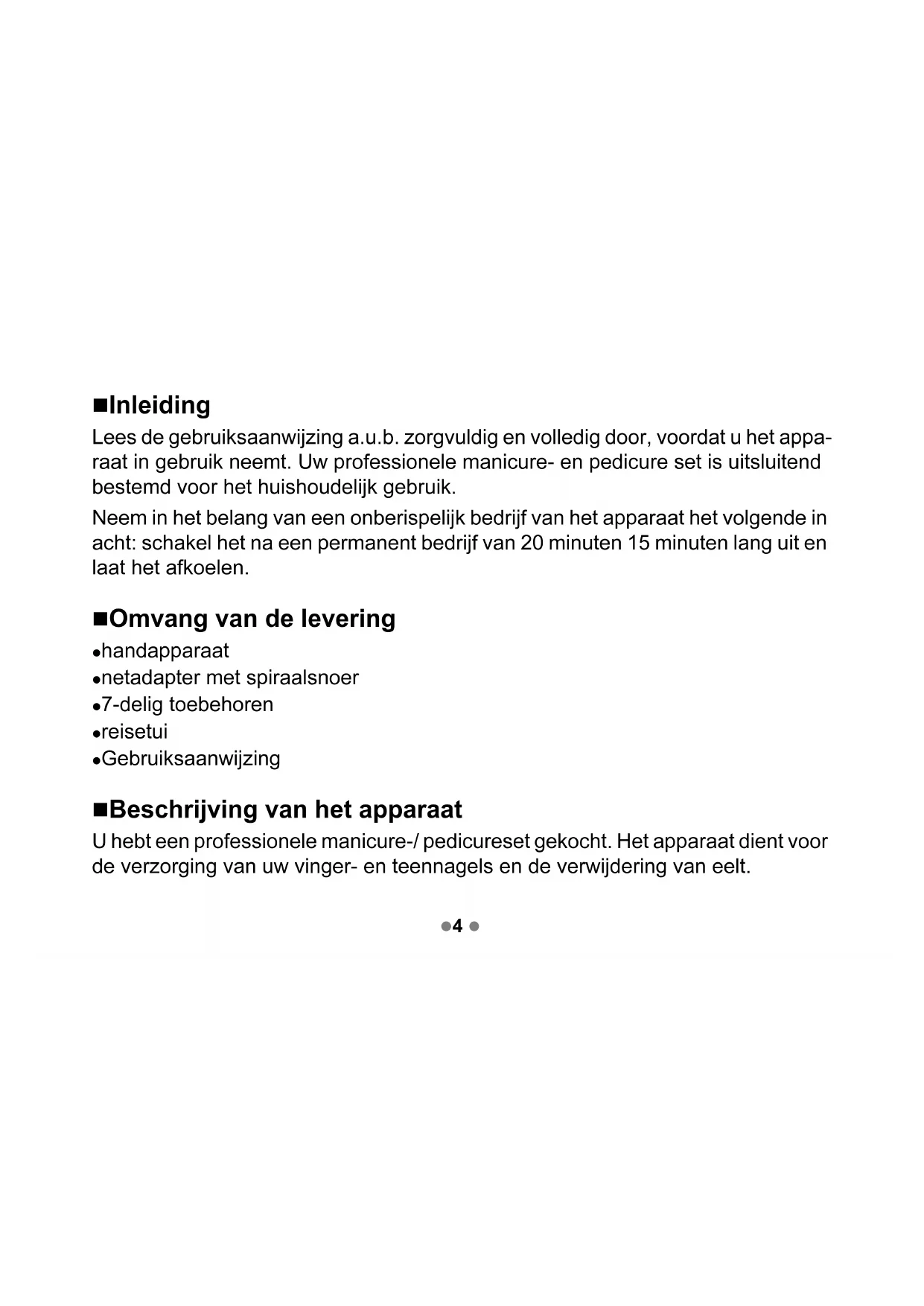 Lees de gebruiksaanwijzing a.u.b. zorgvuldig en volledig door, voordat u het apparaat in gebruik neemt. Uw professionele manicure- en pedicure set is uitsluitend bestemd voor het huishoudelijk gebruik.