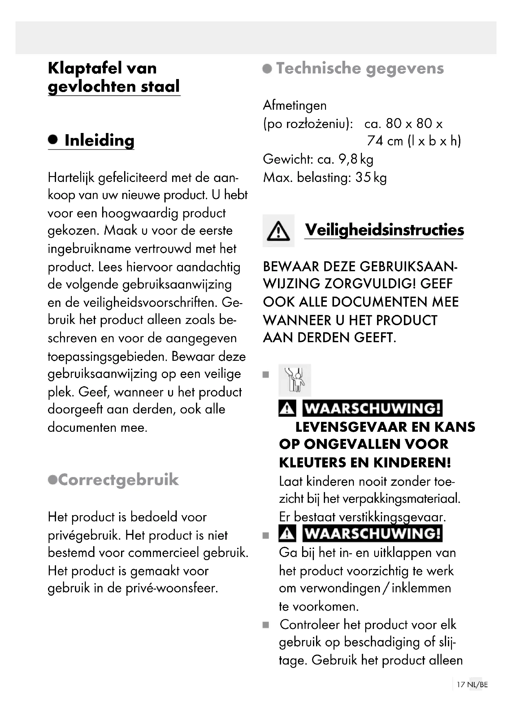 SCHADE! Wij zijn niet aans- prakelijk voor ongevallen die ontstaan door het niet opvolgen van bovenstaande veiligheidsins- tructies of door onjuiste omgang met het product. Reiniging en onderhoud Reinig het product met een vochtige doek en een mild reinigingsmiddel. Laat alle onderdelen goed dro- gen voordat u het product weer inpakt. Dit voorkomt schimmel- vorming, nare geurtjes en verk- leuringen.19 NL/BE Opslag Bewaar het product in een be- schermde, droge ruimte. Bewaar het droge en schone product altijd op kamertemperatuur. Afvoer De verpakking bestaat uit milieu- vriendelijke grondstoffen die u via de plaatselijke recyclingcontainers kunt afvoeren. Informatie over de mogelijkheden om het uitgediende product na gebruik te verwijderen, verstrekt uw gemeentelijke overheid. Garantie Het product wordt volgens strenge kwaliteitsrichtlijnen zorgvuldig ge- produceerd en voor levering grondig getest. In geval van schade aan het product kunt u rechtmatig beroep doen op de verkoper van het product. Deze wettelijke rechten worden door onze hierna vermelde garantie niet beperkt. Op dit product verlenen wij 3 jaar garantie vanaf aankoopdatum. De garantieperiode start op de dag van aankoop. Bewaar de originele kassabon alstublieft. Dit document is nodig als bewijs voor aankoop. Wanneer binnen 3 jaar na de aankoopdatum van dit product een materiaal- of productiefout optreedt, dan wordt het product door ons – naar onze keuze – gratis voor u gerepareerd of vervangen. Deze garantie komt te vervallen als het product beschadigd wordt, niet correct gebruikt of onderhouden wordt. De garantie geldt voor materiaal- en productiefouten. Deze garantie is niet van toepassing op product- onderdelen, die onderhevig zijn aan normale slijtage en hierdoor als aan slijtage onderhevige onder- delen gelden (bijv. batterijen) of voor beschadigingen aan breekbare onderdelen, zoals bijv. schakelaars, accu’s of dergelijke onderdelen, die gemaakt zijn van glas.20 NL/BE Afwikkeling in geval van garantie Om een snelle afhandeling van uw reclamatie te waarborgen dient u de volgende instructies in acht te nemen: Houd bij alle vragen alstublieft de kassabon en het artikelnummer (bijv. IAN 123456_7890) als bewijs van aankoop bij de hand. Het artikelnummer vindt u op de typeplaat, ingegraveerd, op het ti- telblad van uw handleiding (links- onder) of als sticker op de achter- of onderzijde. Wanneer er storingen in de werking of andere gebreken optreden, dient u eerst telefonisch of per e-mail contact met de onderstaande service-afdeling op te nemen. Een als defect geregistreerd product kunt u dan samen met uw aankoop- bewijs (kassabon) en vermelding van de concrete schade alsmede het tijdstip van optreden voor u franco aan het u meegedeelde servicepunt verzenden. Service Service Nederland Tel.: 0900 0400 223 (0,10 EUR / Min.) E-Mail: owim@lidl.nl Service Belgiё Tel.: 070 270 171 (0,15 EUR / Min.) E-Mail: owim@lidl.be21 PL Stalowy, pleciony stół składany Wstęp Gratulujemy Państwu zakupu nowego produktu. Zdecydowali się Państwo na zakup produktu najwyższej jakości. Przed uruchomieniem urządzenia po raz pierwszy zapoznaj się z nim. W tym celu przeczytaj uważnie po- niższą instrukcję obsługi oraz wska- zówki dotyczące bezpieczeństwa. Produkt należy użyt kować w sposób tu opisany i zgodnie z określonym zakresem zastosowania. Należy przechowywać tę instrukcję w bezpiecznym miejscu. Przekazując produkt innej osobie, należy również przekazać wszystkie dokumenty. Użycie zgodne z przeznaczeniem Produkt przeznaczony jest do prywatnego użytku. Produkt nie jest przeznaczony do użytku komercyj- nego. Produkt został wykonany do prywatnych gospodarstw domowych. Dane techniczne Wymiary (po rozłożeniu): ok. 80 x 80 x 74 cm (dł. x szer. x wys.) Waga: ok. 9,8 kg Maks. obciążenie: 35 kg Wskazówki bezpieczeństwa
