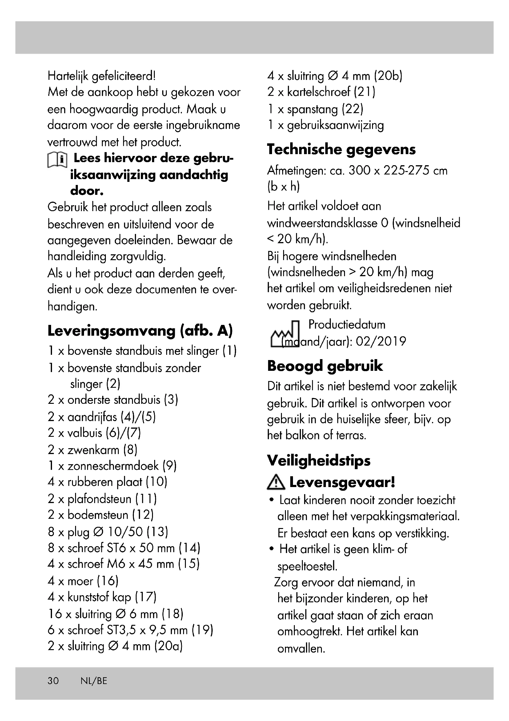 (8) aan de valbuis (6 + 7) met de kartelschroef (21) (afb. S). Gebruik Draai aan de slinger om het zonnescherm te openen of te sluiten. Opslag, reiniging Bewaar het artikel altijd droog en schoon op kamertemperatuur. Reinig alleen met water en veeg vervolgens droog met een reinigingsdoekje. BELANGRIJK! Reinig nooit met scherpe reinigingsmiddelen. Afvalverwerking Voer het artikel en verpakkingsmateri- alen in overeenstemming met actuele lokale voorschriften af. Verpakkings- materialen, zoals bv. foliezakjes, horen niet thuis in kinderhanden. Berg het verpakkingsmateriaal buiten het bereik van kinderen op. Voer de producten en verpak- kingen op milieuvriendelijke wijze af. De recyclingcode dient om verschillende materialen te kenmerken ten behoeve van hergebru- ik via het recyclingproces. De code bestaat uit het recyclingsym- bool, dat het recyclingproces weer- spiegelt, en een getal dat het materiaal identificeert. Opmerkingen over garan- tie en serviceafhandeling Het product is geproduceerd met grote zorg en onder voortdurende controle. U ontvangt een garantie van drie jaar op dit product, vanaf de datum van aankoop. Bewaar alstublieft uw aan- koopbewijs. De garantie geldt alleen voor materiaal- en fabricagefouten en vervalt bij foutief of oneigenlijk gebru- ik. Uw wettelijke rechten, met name het garantierecht, worden niet beïnvloed door deze garantie. In geval van reclamaties dient u zich aan de beneden genoemde service- hotline te wenden of zich per e-mail met ons in verbinding te zetten. Onze servicemedewerkers zullen de verdere handelswijze zo snel mogelijk met u afspreken. Wij zullen u in ieder geval persoonlijk te woord staan. De garantieperiode wordt na even- tuele reparaties en op basis van de garantie, wettelijke garantie of cou- lance niet verlengd. Dit geldt ook voor vervangen en gerepareerde delen. Na afloop van de garantieperiode dienen eventuele reparaties te worden betaald.36 NL/BE IAN: 296717 Service België Tel.: 070 270 171 (0,15 EUR/Min.) E-Mail: deltasport@lidl.be Service Nederland Tel.: 0900 0400223 (0,10 EUR/Min.) E-Mail: deltasport@lidl.nl37PL Gratulujemy! Przez Państwa zakup wybraliście produkt o wysokiej jakości. Przed pierwszym użyciem zapoznajcie się z produktem. W tym celu przeczytajcie następującą instrukcję obsługi. Z produktu należy korzystać jedynie jak to zostało opisane i w podanych zakresach zastosowania. Zachować niniejszą instrukcję. W razie przekazania produktu osobom trzecim dołączyć do niego wszystkie dokumenty. Zakres dostawy (rys. A) 1 x górny słupek stojący z korbą (1) 1 x górny słupek stojący bez korby (2) 2 x dolny słupek stojący (3) 2 x wałek napędowy (4)/(5) 2 x ramię opadające (6)/(7) 2 x ramię obrotowe (8) 1 x tkanina markizowa (9) 4 x płyta gumowa (10) 2 x uchwyt sufitowy (11) 2 x uchwyt do podłoża (12) 8 x kołek rozporowy Ø 10/50 (13) 8 x śruba ST6 x 50 mm (14) 4 x śruba M6 x 45 mm (15) 4 x nakrętka (16) 4 x osłona z tworzywa sztucznego (17) 16 x podkładka Ø 6 mm (18) 6 x śruba ST3,5 x 9,5 mm (19) 2 x podkładka Ø 4 mm (20a) 4 x podkładka Ø 4 mm (20b) 2 x śruba radełkowana (21) 1 x belka napinająca (22) 1 x instrukcja obsługi Dane techniczne Wymiary: ok. 300 x 225-275 cm Produkt jest odporny na działanie wiatru w klasie: 0 (prędkość wiatru < 20 km/h). Ze względów bezpieczeństwa nie wolno korzystać z tego produktu przy silnym wietrze o prędkości > 20 km/h! Data produkcji (miesiąc/rok): 02/2019 Użytkowanie zgodne z przeznaczeniem Produkt ten nie jest przeznaczony do użytku komercyjnego. Produkt ten jest przeznaczony do użytkowania w pomieszczeniach mieszkalnych, np. na balkonie lub tarasie. Wskazówki bezpieczeństwa Zagrożenie życia!