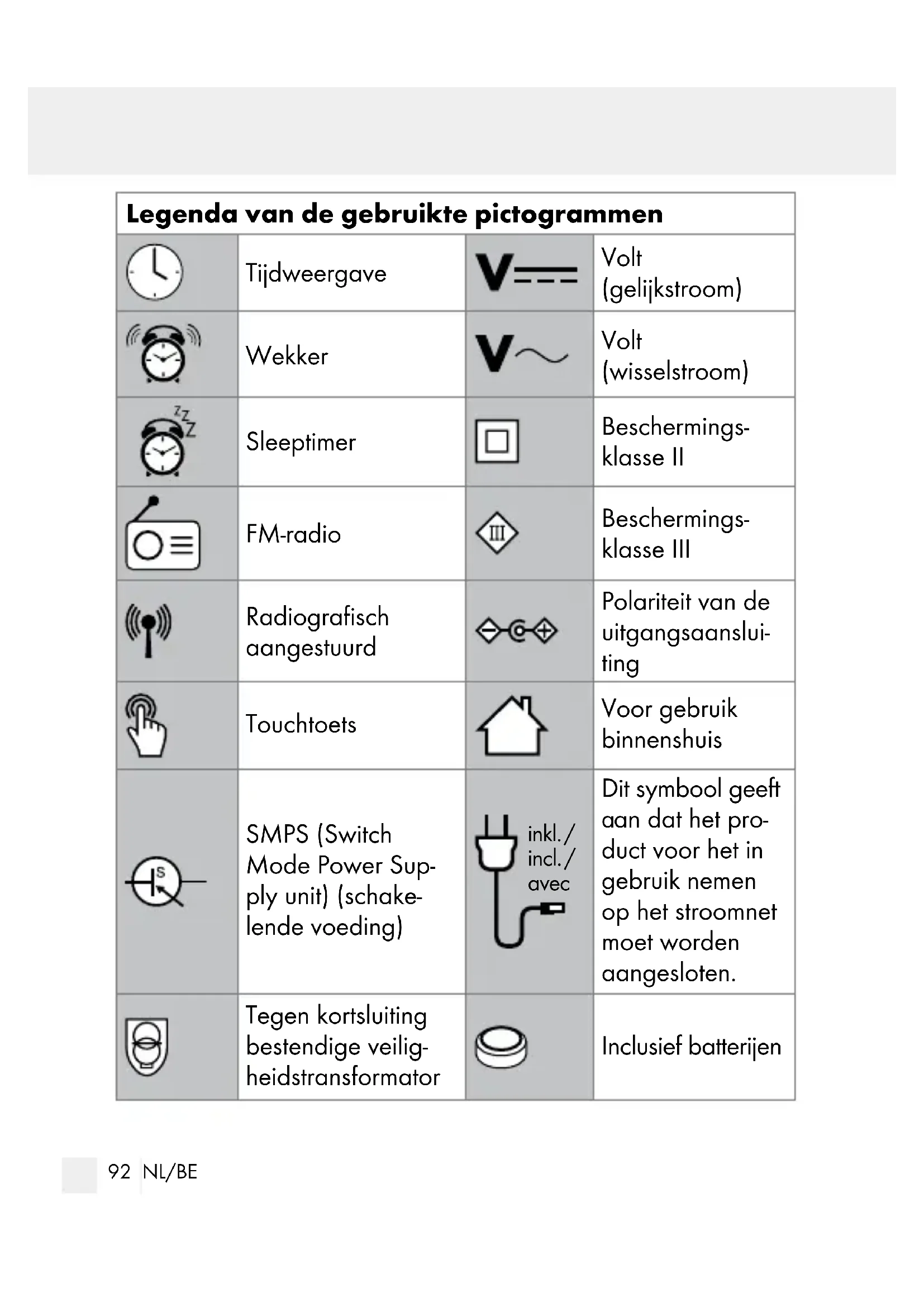 beschreven en voor de aangegeven toepassingsgebieden. Over- handig alle documenten bij doorgifte van het product aan derden. Correct gebruik Het product toont tijd, datum en weekdag en heeft een optische en akoestische alarmfunctie evenals een elektronisch alarmsignaal en radio-ontvangst. Het product is bestemd voor privégebruik in droge ruimtes. Het product is niet geschikt voor commer- cieel gebruik of voor gebruik op andere gebieden.94 NL/BE Beschrijving van de onderdelen
