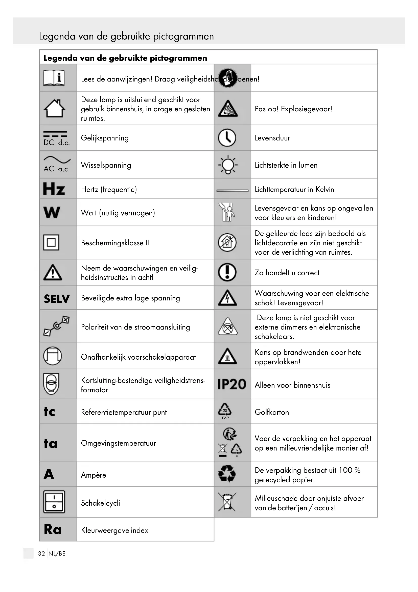 KLEUTERS EN KINDEREN! Laat kinderen nooit zonder toezicht bij het ver- pakkingsmateriaal. Er bestaat verstikkingsge- vaar door het verpakkingsmateriaal. Kinderen onderschatten vaak de gevaren. Laat de lamp of het verpakkingsmateriaal niet achteloos liggen. Plastic folie / -zakken, kunststof delen etc. kunnen voor kinderen een gevaarlijk speelgoed vormen. Dit apparaat kan door kinderen vanaf 8 jaar en ouder alsmede door personen met verminderde fysieke, sensorische of mentale vaardigheden of een gebrek aan ervaring en kennis worden gebruikt, als zij onder toezicht staan of geïnstru- eerd werden met betrekking tot het veilige gebru