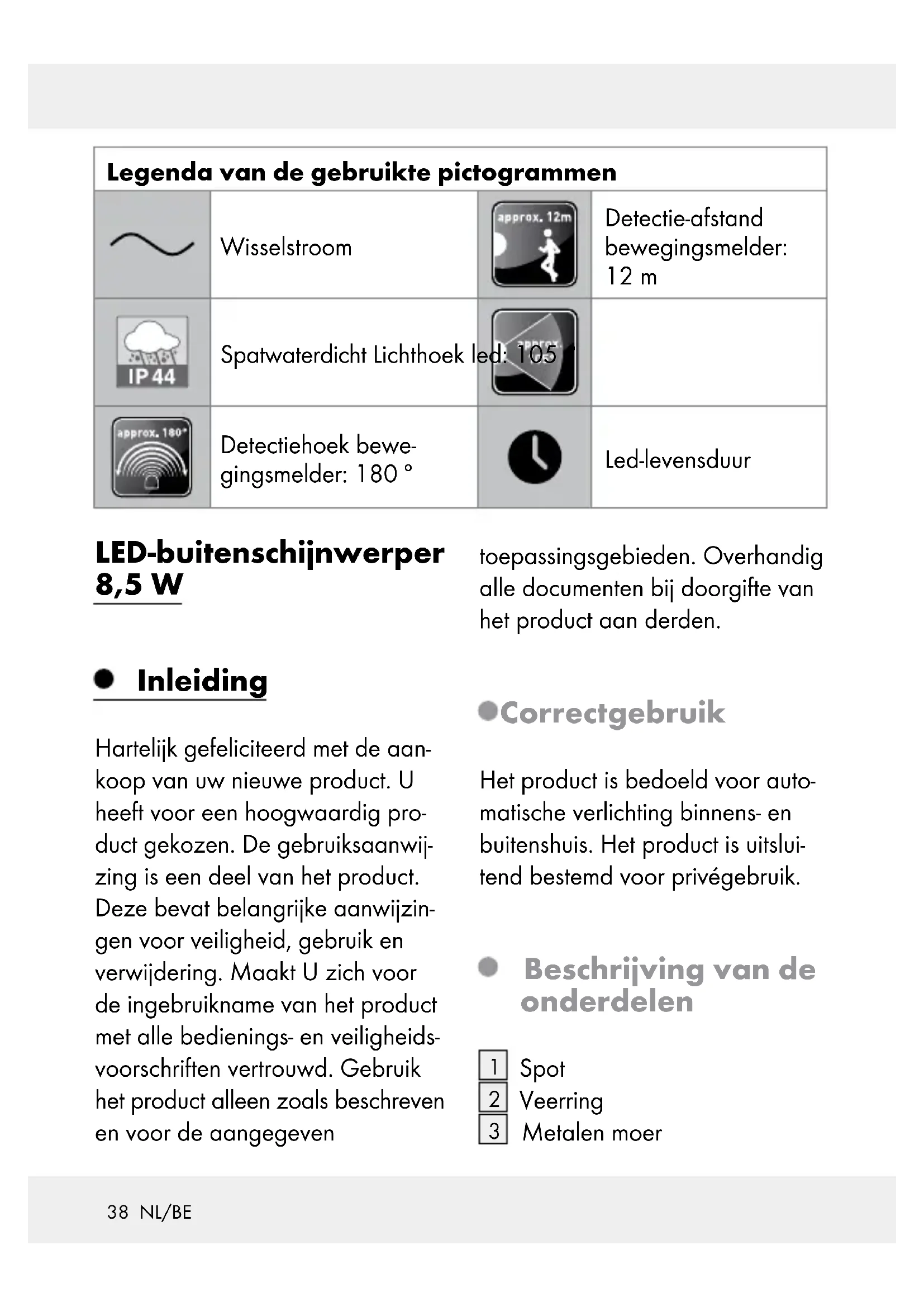Neem de aanduiding van de verpakkingsma- terialen voor de afval- scheiding in acht. Deze zijn gemar- keerd met de afkortingen (a) en een cijfers (b) met de volgende be- tekenis: 1–7: kunststoffen / 20–22: papier en vezelplaten / 80–98: composietmaterialen. Het product en de ver- pakkingsmaterialen zijn recyclebaar; verwijder deze afzonderlijk voor een betere afvalbehandeling. Het Triman-logo geldt alleen voor Frankrijk. Informatie over de mo- gelijkheden om het uit- gediende product na gebruik te verwijderen, verstrekt uw gemeentelijke overheid. Gooi het afgedankte product omwille van het milieu niet weg via het huisvuil, maar geef het af bij het daarvoor bestemde depot of het gemeentelijke milieupark. Over af- gifteplaatsen en hun openingstijden kunt u zich bij uw aangewezen in- stantie informeren. Garantie Het product wordt volgens strenge kwaliteitsrichtlijnen zorgvuldig ge- produceerd en voor levering grondig getest. In geval van schade aan het product kunt u rechtmatig beroep doen op de verkoper van het pro- duct. Deze wettelijke rechten worden door onze hierna vermelde garantie niet beperkt. Op dit product verlenen wij 3 jaar garantie vanaf aankoopdatum. De garantieperiode start op de dag van aankoop. Bewaar de originele kassabon alstublieft. Dit document is nodig als bewijs voor aankoop. Wanneer binnen 3 jaar na de aan- koopdatum van dit product een materiaal- of productiefout optreedt, dan wordt het product door ons – naar onze keuze – gratis voor u gerepareerd of vervangen. Deze garantie komt te vervallen als het product beschadigd wordt, niet correct gebruikt of onderhouden wordt.47 NL/BE De garantie geldt voor materiaal- en productiefouten. Deze garantie is niet van toepassing op producton- derdelen, die onderhevig zijn aan normale slijtage en hierdoor als aan slijtage onderhevige onderdelen gelden (bijv. batterijen) of voor be- schadigingen aan breekbare on- derdelen, zoals bijv. schakelaars, accu’s of dergelijke onderdelen, die gemaakt zijn van glas.48 CZ Legenda použitých piktogramů .........................Strana 49 Úvod ........................................................................................... Strana 49 Použití ke stanovenému účelu....................................................Strana 49 Popis dílů ....................................................................................Strana 49 Technické údaje .........................................................................Strana 50 Obsah dodávky .........................................................................Strana 50 Všeobecná bezpečnostní upozornění ............Strana 50 Před montáží .......................................................................Strana 52 Před uvedením do provozu....................................Strana 52 Montáž .....................................................................................Strana 52 Uvedení do provozu .....................................................Strana 54 Nastavení pohybového senzoru ...............................................Strana 54 Nastavení doby svícení .............................................................Strana 54 Nastavení citlivosti senzoru ....................................................... Strana 54 Nastavení hladiny denního světla .............................................Strana 55 Nastavení pohybového senzoru ...............................................Strana 55 Čistění a ošetřování .......................................................Strana 55 Zlikvidování .........................................................................Strana 56 Záruka ......................................................................................Strana 5649 CZ Legenda použitých piktogramů Střídavý proud Dosah pohybového senzoru: 12 m Chráněný před stříkající vodou Úhel osvětlení LED: 105 ° Úhel dosahu pohybo- vého senzoru: 180 ° Životnost LED LED venkovní reflektor 8,5 W Úvod Blahopřejeme Vám ke koupi nového výrobku. Rozhodli jste se pro kvalitní produkt. Návod kobsluze je součástí tohoto výrobku. Obsahuje důležité pokyny pro bezpečnost, použití a likvidaci. Před použitím výrobku se seznamte se všemi pokyny k obsluze a bezpečnostními pokyny. Použí- vejte výrobek jen popsa ným způso- bem a na uvedených místech. Při předání výrobku třetí osobě předejte i všechny podklady. Použití ke stanovenému účelu Výrobek je určen kautomatickému osvětlení vnitřních i venkovních pro- storů. Výrobek je určen výhradně ksoukromému použití. Popis dílů
