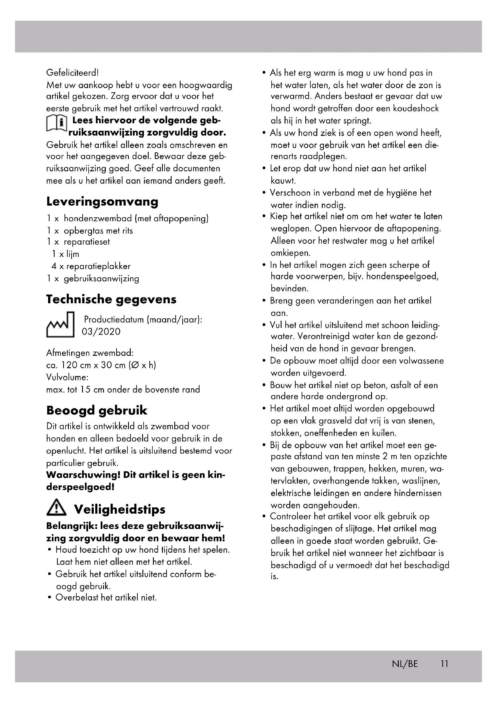 het artikel weer vullen. Opslag, reiniging Verschoon het water in het artikel regelmatig, met name bij warm weer en wanneer het water vies is! Bewaar het artikel wanneer u dit niet gebruikt altijd droog en schoon op kamertem- peratuur. Vouw het artikel alleen op en doe het alleen in de opbergtas als het volledig droog is. Zorg ervoor dat de aftapopening tijdens opslag altijd gesloten is. Reinig het artikel uitsluitend met water of mild zeepwater. Reinig nooit met agressieve schoonmaakmiddelen. Plaats tijdens de winteropslag geen scherpe voorwerpen op het artikel en poeder het artikel niet in met talkpoeder. Afvalverwerking Voer het artikel en verpakkingsmaterialen in overeenstemming met actuele lokale voor- schriften af. Verpakkingsmaterialen, zoals bv. foliezakjes, horen niet thuis in kinderhanden. Berg het verpakkingsmateriaal buiten het bereik van kinderen op. Voer de producten en verpakkingen op milieuvriendelijke wijze af. De recyclingcode dient om verschillende materialen te kenmerken ten behoeve van hergebruik via het recyclingproces. De code bestaat uit het recyclingsymbool, dat het recyclingproces weerspiegelt, en een getal dat het materiaal identificeert. NL/BE13NL/BE Opmerkingen over garantie en serviceafhandeling Het product is geproduceerd met grote zorg en onder voortdurende controle. U ontvangt een garantie van drie jaar op dit product, vanaf de datum van aankoop. Bewaar alstublieft uw aankoopbewijs. De garantie geldt alleen voor materiaal- en fa- bricagefouten en vervalt bij foutief of oneigenlijk gebruik. Uw wettelijke rechten, met name het garantierecht, worden niet beïnvloed door deze garantie. In geval van reclamaties dient u zich aan de beneden genoemde service-hotline te wenden of zich per e-mail met ons in verbinding te zetten. Onze servicemedewerkers zullen de verdere handelswijze zo snel mogelijk met u afspreken. Wij zullen u in ieder geval persoonlijk te woord staan. De garantieperiode wordt na eventuele repa- raties en op basis van de garantie, wettelijke garantie of coulance niet verlengd. Dit geldt ook voor vervangen en gerepareerde delen. Na afloop van de garantieperiode dienen even- tuele reparaties te worden betaald. IAN: 331646_1907 Service België Tel.: 070 270 171 (0,15 EUR/Min.) E-Mail: deltasport@lidl.be Service Nederland Tel.: 0900 0400223 (0,10 EUR/Min.) E-Mail: deltasport@lidl.nl14 Gratulujemy! Decydując się na ten produkt, otrzymują Państ- wo towar wysokiej jakości. Należy zapoznać się z produktem przed jego pierwszym użyciem. Należy uważnie przeczytać następującą instrukcję użytkowan- ia. Produkt ten należy użytkować wyłącznie w opisany sposób oraz zgodnie ze wskazanym przeznaczeniem. Niniejszą instrukcję użytkow- ania należy przechowywać w bezpiecznym miejscu. Przekazując produkt innej osobie, należy upewnić się, że otrzyma ona także całą dokumentację dotyczącą produktu. Zakres dostawy 1 x basen dla psa (z otworem spustowym) 1 x torba do przechowywania z zamkiem błyskawicznym 1 x zestaw naprawczy 1 x klej 4 x łatka do naprawy 1 x instrukcja użytkowania Dane techniczne Data produkcji (miesiąc/rok): 03/2020 Wymiary basenu: ok. 120 cm x 30 cm (Ø x wys.) Pojemność: maks. do 15 cm poniżej górnej krawędzi Użytkowanie zgodne z prze- znaczeniem Ten produkt jest zaprojektowany jako basen dla psów i jest przeznaczony wyłącznie do użytku na zewnątrz. Produkt jest przeznaczony wyłącz- nie do użytku prywatnego. Ostrzeżenie! Produkt nie jest zabawką! Wskazówki bezpieczeń- stwa Ważne: należy uważnie przeczytać instrukcję obsługi i zachować ją do póź- niejszego użytku!