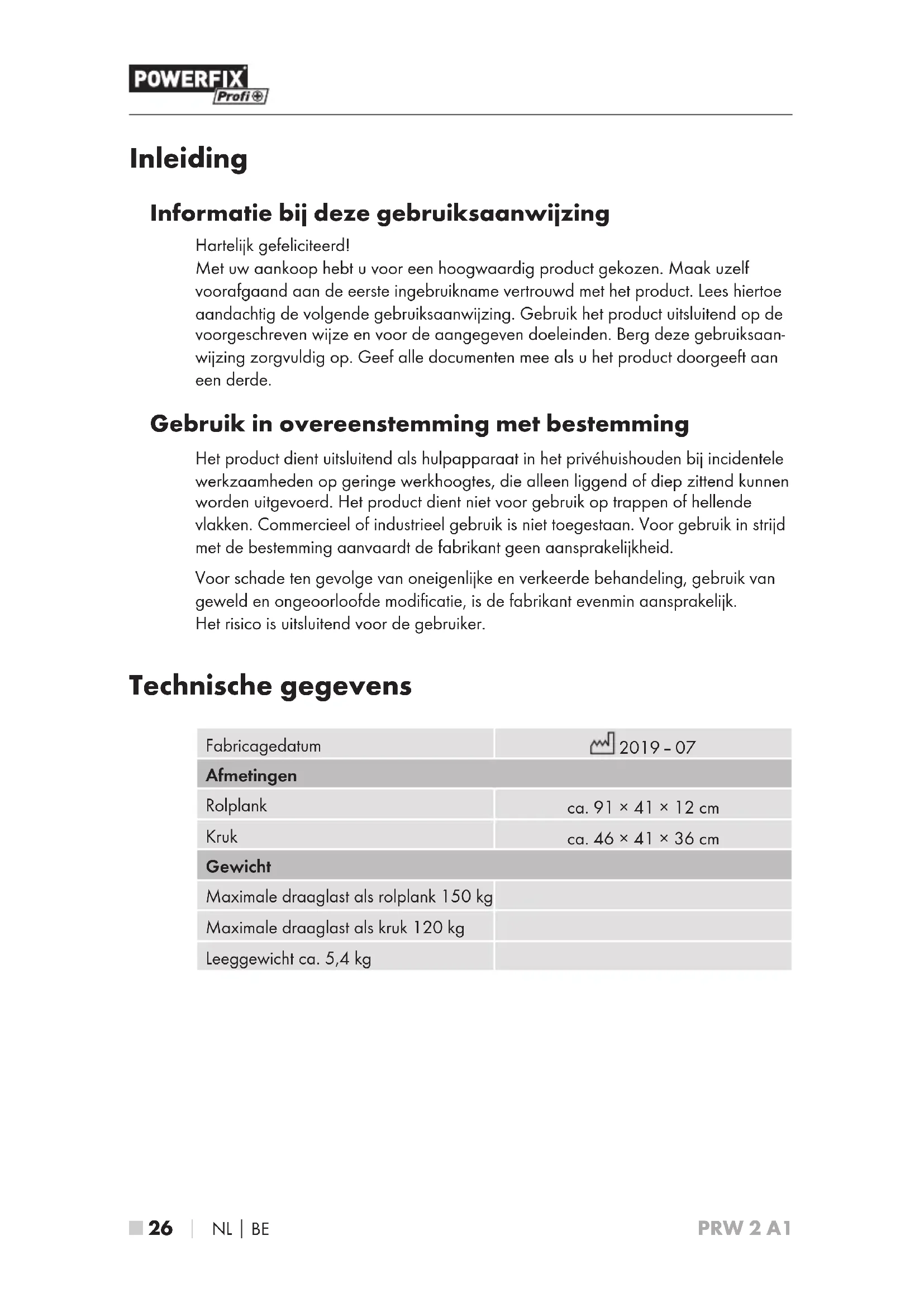 PRW 2 A1 Inleiding Informatie bij deze gebruiksaanwijzing Hartelijk gefeliciteerd! Met uw aankoop hebt u voor een hoogwaardig product gekozen. Maak uzelf voorafgaand aan de eerste ingebruikname vertrouwd met het product. Lees hiertoe aandachtig de volgende gebruiksaanwijzing. Gebruik het product uitsluitend op de voorgeschreven wijze en voor de aangegeven doeleinden. Berg deze gebruiksaan- wijzing zorgvuldig op. Geef alle documenten mee als u het product doorgeeft aan een derde. Gebruik in overeenstemming met bestemming Het product dient uitsluitend als hulpapparaat in het privéhuishouden bij incidentele werkzaamheden op geringe werkhoogtes, die alleen liggend of diep zittend kunnen worden uitgevoerd. Het product dient niet voor gebruik op trappen of hellende vlakken. Commercieel of industrieel gebruik is niet toegestaan. Voor gebruik in strijd met de bestemming aanvaardt de fabrikant geen aansprakelijkheid. Voor schade ten gevolge van oneigenlijke en verkeerde behandeling, gebruik van geweld en ongeoorloofde modificatie, is de fabrikant evenmin aansprakelijk. Het risico is uitsluitend voor de gebruiker. Technische gegevens Fabricagedatum 2019 – 07 Afmetingen Rolplank ca. 91 × 41 × 12 cm Kruk ca. 46 × 41 × 36 cm Gewicht Maximale draaglast als rolplank 150 kg Maximale draaglast als kruk 120 kg Leeggewicht ca. 5,4 kgNL
