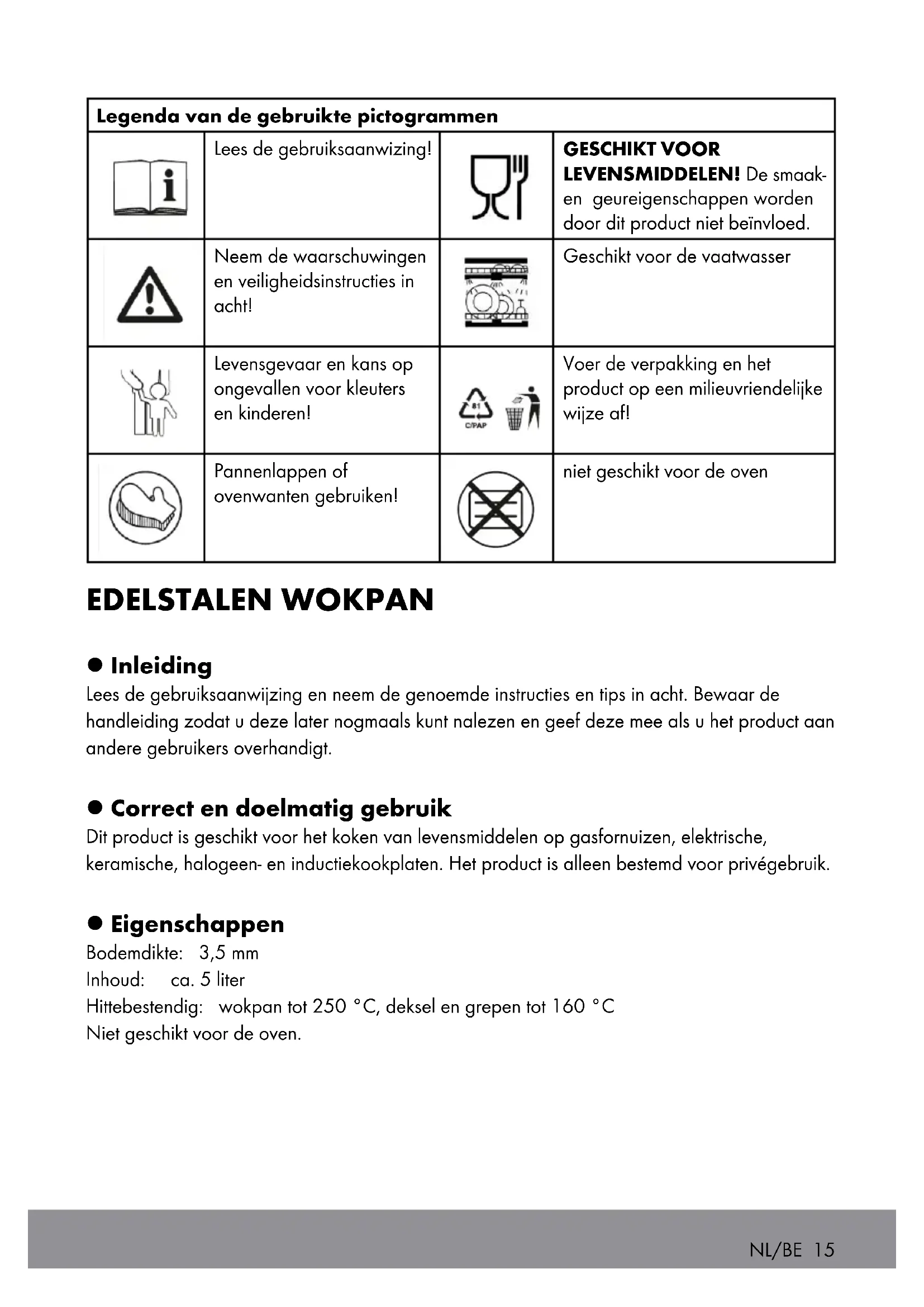 Dit product is geschikt voor het koken van levensmiddelen op gasfornuizen, elektrische, keramische, halogeen- en inductiekookplaten. Het product is alleen bestemd voor privégebruik.