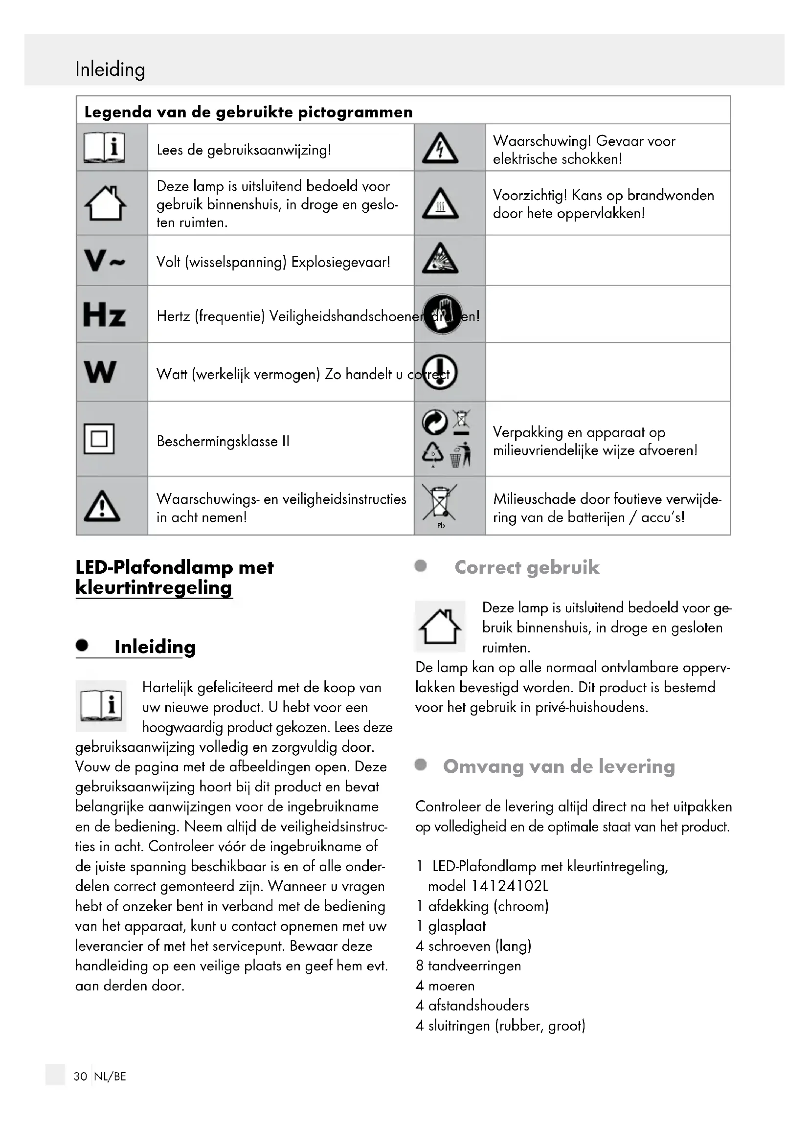 p volledigheid en de optimale staat van het product. 1 LED-Plafondlamp met kleurtintregeling, model 14124102L 1 afdekking (chroom) 1 glasplaat 4 schroeven (lang) 8 tandveerringen 4 moeren 4 afstandshouders 4 sluitringen (rubber, groot) Inleiding / Veiligheid31 NL/BE Inleiding Inleiding / Veiligheid 4 sluitringen (rubber, klein) 4 dopmoeren 2 schroeven 2 pluggen 2 batterijen (AAA) 1 afstandsbediening 1 montage- en gebruiksaanwijzing Beschrijving van de onderdelen