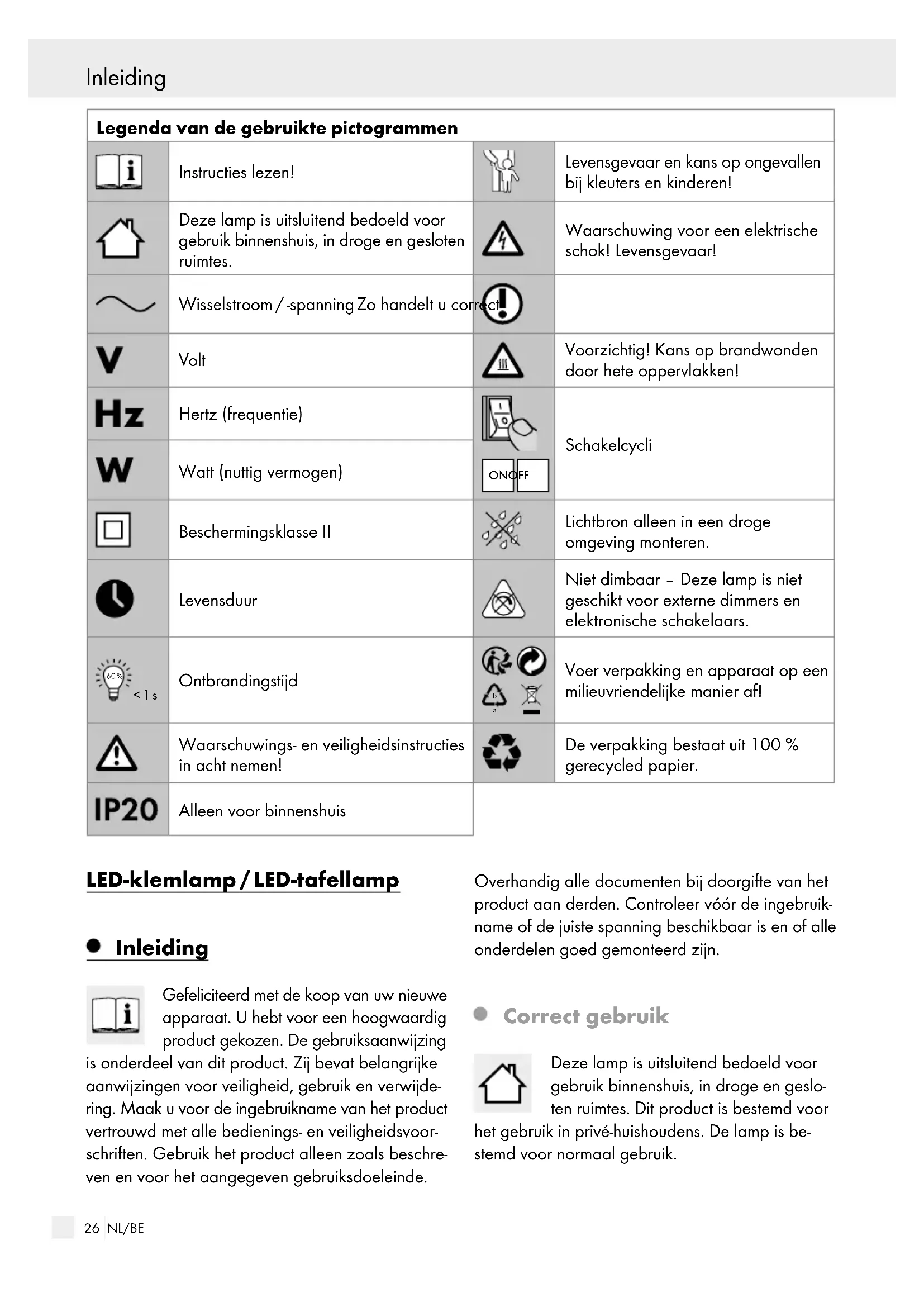 Voer verpakking en apparaat op een milieuvriendelijke manier af! Waarschuwings- en veiligheidsinstructies in acht nemen! De verpakking bestaat uit 100 % gerecycled papier. Alleen voor binnenshuis LED-klemlamp / LED-tafellamp Inleiding Gefeliciteerd met de koop van uw nieuwe apparaat. U hebt voor een hoogwaardig product gekozen. De gebruiksaanwijzing is onderdeel van dit product. Zij bevat belangrijke aanwijzingen voor veiligheid, gebruik en verwijde- ring. Maak u voor de ingebruikname van het product vertrouwd met alle bedienings- en veiligheidsvoor- schriften. Gebruik het product alleen zoals beschre- ven en voor het aangegeven gebruiksdoeleinde. Overhandig alle documenten bij doorgifte van het product aan derden. Controleer vóór de ingebruik- name of de juiste spanning beschikbaar is en of alle onderdelen goed gemonteerd zijn.