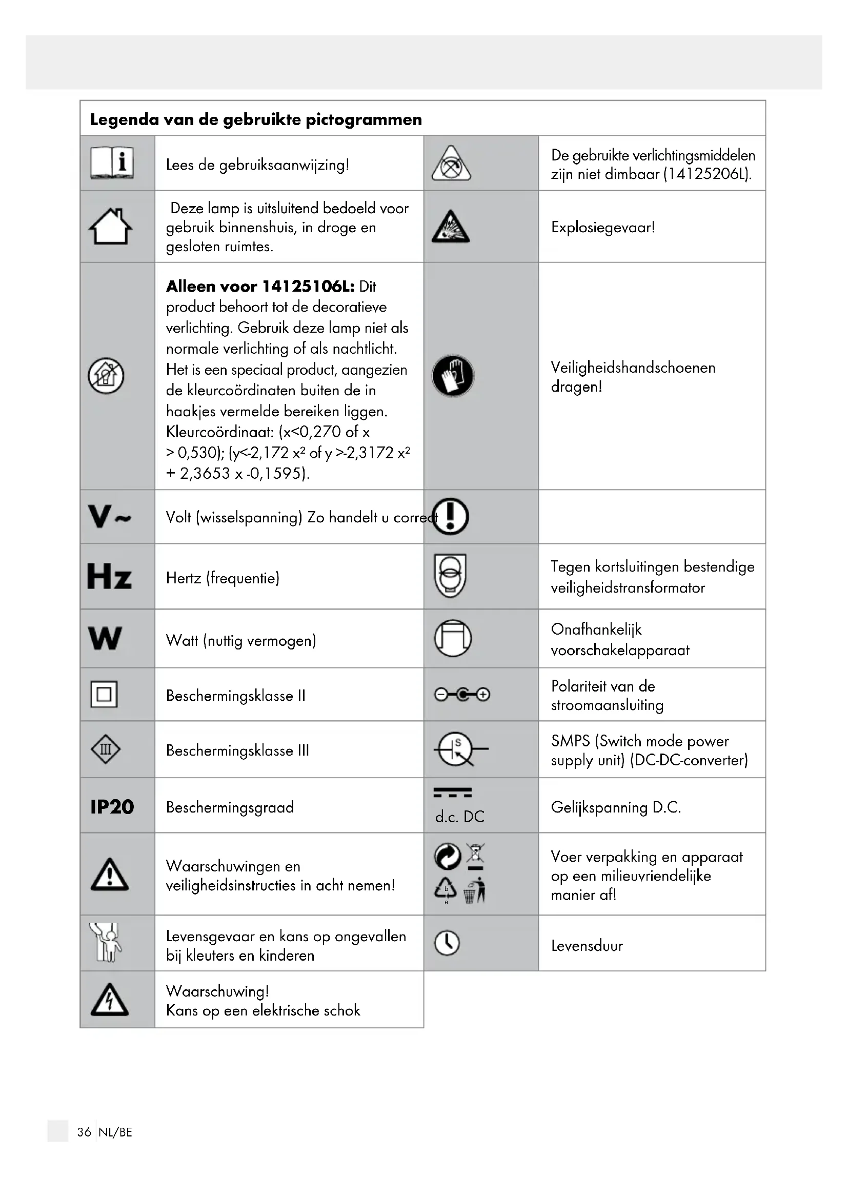 Deze lamp is uitsluitend bedoeld voor gebruik binnenshuis, in droge en gesloten ruimtes. Explosiegevaar! Alleen voor 14125106L: Dit product behoort tot de decoratieve verlichting. Gebruik deze lamp niet als normale verlichting of als nachtlicht. Het is een speciaal product, aangezien de kleurcoördinaten buiten de in haakjes vermelde bereiken liggen. Kleurcoördinaat: (x<0,270 of x > 0,530); (y<-2,172 x² of y >-2,3172 x² + 2,3653 x -0,1595). Veiligheidshandschoenen dragen! Volt (wisselspanning) Zo handelt u correct Hertz (frequentie) Tegen kortsluitingen bestendige veiligheidstransformator Watt (nuttig vermogen) Onafhankelijk voorschakelapparaat Beschermingsklasse II Polariteit van de stroomaansluiting Beschermingsklasse III SMPS (Switch mode power supply unit) (DC-DC-converter) IP20 Beschermingsgraad d.c. DC Gelijkspanning D.C. Waarschuwingen en veiligheidsinstructies in acht nemen!