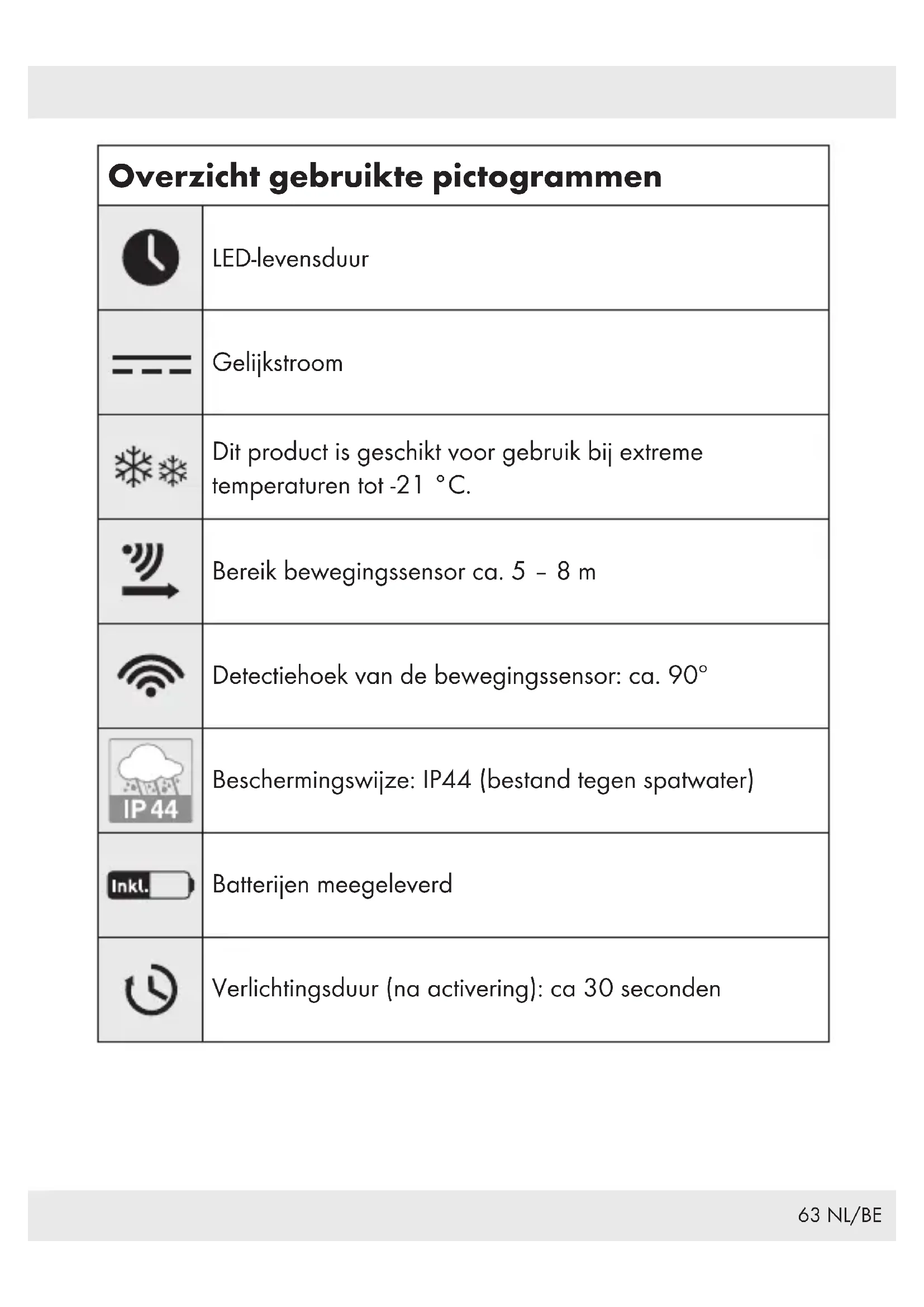 schoon blijven. Verwijder verontreinigingen om ervoor te zorgen dat het product probleemloos werkt. Hou het product, in het bijzonder in de winter, sneeuw- en ijsvrij.77 NL/BE Afvoer De verpakking bestaat uit milieuvriendelijke grondstoffen die u via de plaatselijke recyclingcontainers kunt afvoeren. Neem de aanduiding van de verpakkingsmaterialen voor de afvalscheiding in acht. Deze zijn gemarkeerd met de afkortingen (a) en een cijfers (b) met de volgende betekenis: 1 – 7: kunststoffen / 20 – 22: papier en vezelplaten / 80 – 98: composietmaterialen. Het product en de verpakkingsmaterialen zijn recyclebaar; verwijder deze afzonderlijk voor een betere afvalbehandeling. Het Triman-logo geldt alleen voor Frankrijk. Informatie over de mogelijkheden om het uitgediende product na gebruik te verwijderen, verstrekt uw gemeentelijke overheid. Gooi het afgedankte product omwille van het milieu niet weg via het huisvuil, maar geef het af bij het daarvoor bestemde depot of het gemeentelijke milieupark. Over afgifteplaatsen en hun openingstijden kunt u zich bij uw aangewezen instantie informeren. Defecte of verbruikte batterijen / accu‘s moeten volgens de richtlijn 2006/66/EG en veranderingen daarop worden gerecycled. Geef batterijen / accu‘s en / of het product af bij de daarvoor bestemde verzamelstations.78 NL/BE Milieuschade door foutieve verwijdering van de batterijen / accu‘s! Batterijen / accu‘s mogen niet via het huisvuil worden weggegooid. Ze kunnen giftige zware metalen bevatten en vallen onder het chemisch afval. De chemische symbolen van de zware metalen zijn: Cd = cadmium, Hg = kwik, Pb = lood. Geef verbruikte batterijen / accu‘s daarom af bij een gemeentelijk inzamelpunt. Garantie Het product wordt volgens strenge kwaliteitsrichtlijnen zorgvuldig geproduceerd en voor levering grondig getest. In geval van schade aan het product kunt u rechtmatig beroep doen op de verkoper van het product. Deze wettelijke rechten worden door onze hierna vermelde garantie niet beperkt. Op dit product verlenen wij 3 jaar garantie vanaf aankoopdatum. De garantieperiode start op de dag van aankoop. Bewaar de originele kassabon alstublieft. Dit document is nodig als bewijs voor aankoop. Wanneer binnen 3 jaar na de aankoopdatum van dit product een materiaal- of productiefout optreedt, dan wordt het product door ons – naar onze keuze – gratis voor u gerepareerd of vervangen. Deze garantie komt te vervallen als het product beschadigd wordt, niet correct gebruikt of onderhouden wordt.79 NL/BE De garantie geldt voor materiaal- en productiefouten. Deze garantie is niet van toepassing op productonderdelen, die onderhevig zijn aan normale slijtage en hierdoor als aan slijtage onderhevige onderdelen gelden (bijv. batterijen) of voor beschadigingen aan breekbare onderdelen, zoals bijv. schakelaars, accu’s of dergelijke onderdelen, die gemaakt zijn van glas. Afwikkeling in geval van garantie Om een snelle afhandeling van uw reclamatie te waarborgen dient u de volgende instructies in acht te nemen: Houd bij alle vragen alstublieft de kassabon en het artikelnummer (bijv. IAN 123456_7890) als bewijs van aankoop bij de hand. Het artikelnummer vindt u op de typeplaat, ingegraveerd, op het titelblad van uw handleiding (linksonder) of als sticker op de achter- of onderzijde. Wanneer er storingen in de werking of andere gebreken optreden, dient u eerst telefonisch of per e-mail contact met de onderstaande service-afdeling op te nemen. Een als defect geregistreerd product kunt u dan samen met uw aankoopbewijs (kassabon) en vermelding van de concrete schade alsmede het tijdstip van optreden voor u franco aan het u meegedeelde servicepunt verzenden.80 NL/BE Service Service Nederland Tel.: 0900 0400 223 (0,10 EUR/Min.) E-Mail: owim@lidl.nl Service Belgiё Tel.: 070 270 171 (0,15 EUR/Min.) E-Mail: owim@lidl.be81 PL Lista używanych piktogramów ......... Strona 82 Wstęp ....................................... Strona 83 Przeznaczenie ................................ Strona 83 Opis części .................................. Strona 83 Dane techniczne .............................. Strona 84 Elementy wyposażenia ......................... Strona 85 Ogólne informacje o bezpieczeństwie .......................... Strona 85 Wskazówki bezpieczeństwa dla baterii/ akumulatorów ................................ Strona 86 Przygotowanie produktu do użycia .... Strona 88 Ładowanie akumulatorków ...................... Strona 88 Wkładanie lub wymiana baterii ........ Strona 89 Montaż ..................................... Strona 90 Uruchomienie .............................. Strona 94 Konserwacja i czyszczenie ............... Strona 95 Utylizacja .................................. Strona 96 Gwarancja ................................. Strona 9782 PL Lista używanych piktogramów Żywotność diod LED Prąd stały Ten produkt nadaje się do stosowania w ekstremalnych temperaturach do -21°C. Zasięg czujnika ruchu ok. 5 – 8m Kąt detekcji czujnika ruchu: ok. 90º Typ ochrony: IP44 (ochrona przed strugami wody) Dołączona bateria Czas świecenia (po aktywacji): ok. 30 sekund83 PL