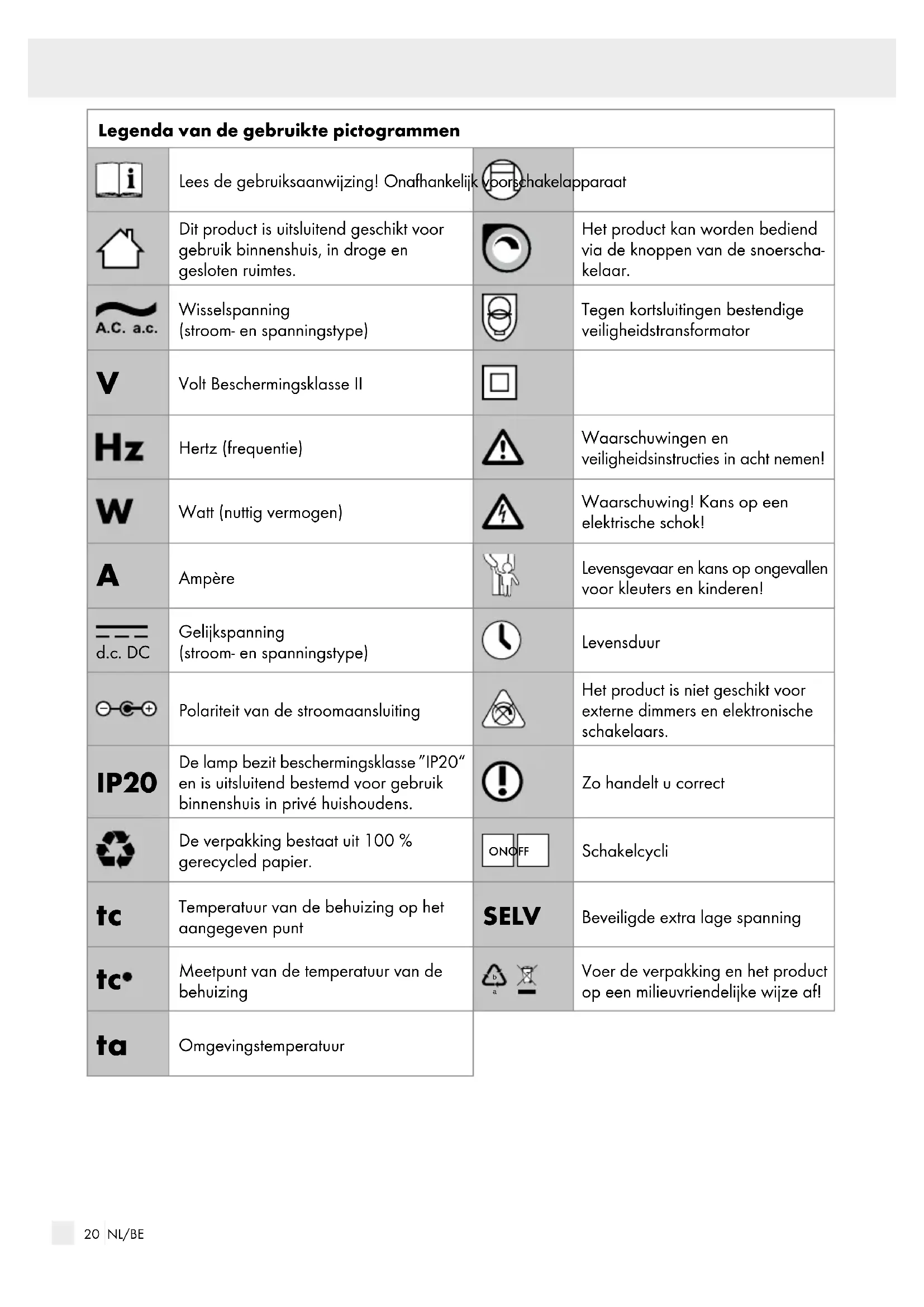 Ampère Levensgevaar en kans op ongevallen voor kleuters en kinderen! d.c. DC Gelijkspanning (stroom- en spanningstype) Levensduur Polariteit van de stroomaansluiting Het product is niet geschikt voor externe dimmers en elektronische schakelaars. IP20 De lamp bezit beschermingsklasse ″IP20“ en is uitsluitend bestemd voor gebruik binnenshuis in privé huishoudens. Zo handelt u correct De verpakking bestaat uit 100 % gerecycled papier. ON OFF Schakelcycli