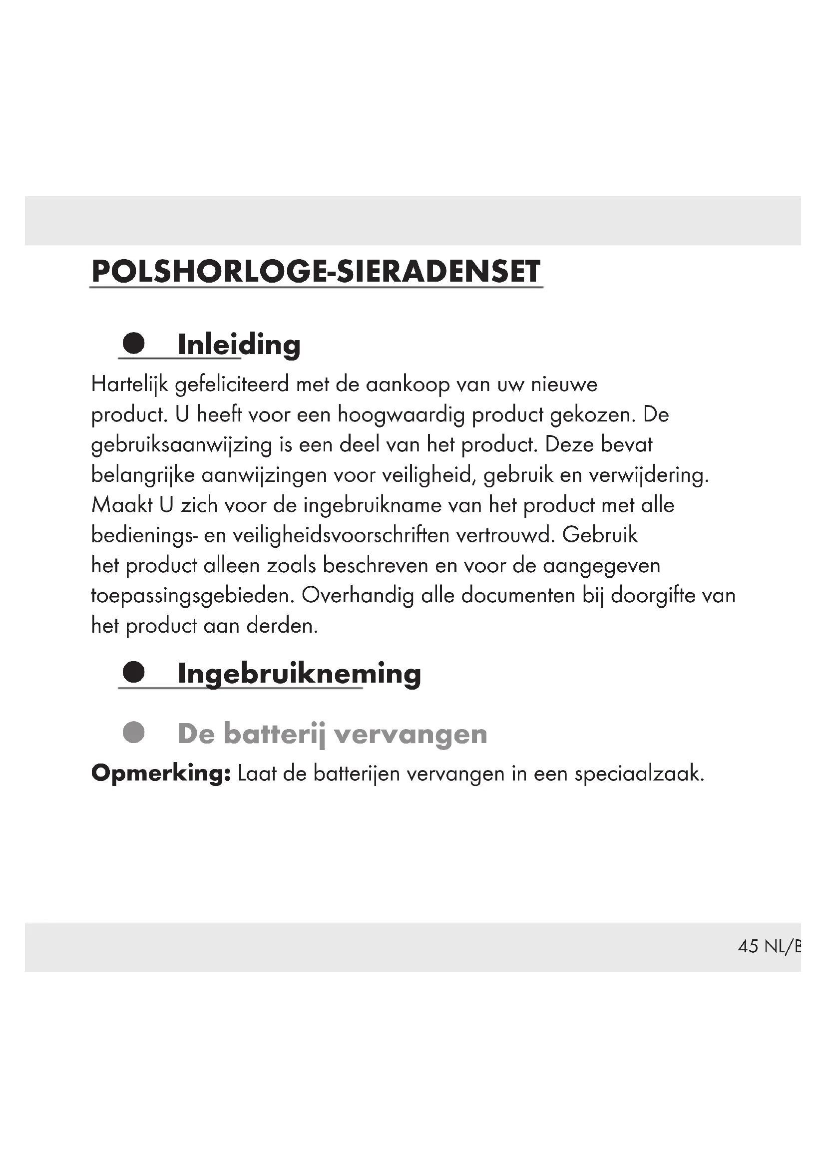 van de horlogeband opnieuw.51 NL/BE Reiniging en onderhoud Reinig het product alleen aan de buitenzijde met een zachte, droge doek. Afvoer De verpakking bestaat uit milieuvriendelijke grondstoffen die u via de plaatselijke recyclingcontainers kunt afvoeren. Neem de aanduiding van de verpakkingsmaterialen voor de afvalscheiding in acht. Deze zijn gemarkeerd met de afkortingen (a) en een cijfers (b) met de volgende betekenis: 1 – 7: kunststoffen / 20 – 22: papier en vezelplaten / 80 – 98: composietmaterialen. Het product en de verpakkingsmaterialen zijn recyclebaar; verwijder deze afzonderlijk voor een betere afvalbehandeling. Het Triman-logo geldt alleen voor Frankrijk. Informatie over de mogelijkheden om het uitgediende product na gebruik te verwijderen, verstrekt uw gemeentelijke overheid.52 NL/BE Gooi het afgedankte product omwille van het milieu niet weg via het huisvuil, maar geef het af bij het daarvoor bestemde depot of het gemeentelijke milieupark. Over afgifteplaatsen en hun openingstijden kunt u zich bij uw aangewezen instantie informeren. Defecte of verbruikte batterijen / accu‘s moeten volgens de richtlijn 2006/66/EG en veranderingen daarop worden gerecycled. Geef batterijen / accu‘s en / of het product af bij de daarvoor bestemde verzamelstations. Milieuschade door foutieve verwijdering van de batterijen / accu‘s! Batterijen / accu‘s mogen niet via het huisvuil worden weggegooid. Ze kunnen giftige zware metalen bevatten en vallen onder het chemisch afval. De chemische symbolen van de zware metalen zijn: Cd = cadmium, Hg = kwik, Pb = lood. Geef verbruikte batterijen / accu‘s daarom af bij een gemeentelijk inzamelpunt.53 NL/BE P Garantie en service P Garantie Het product wordt volgens strenge kwaliteitsrichtlijnen zorgvuldig geproduceerd en voor levering grondig getest. In geval van schade aan het product kunt u rechtmatig beroep doen op de verkoper van het product. Deze wettelijke rechten worden door onze hierna vermelde garantie niet beperkt. Op dit product verlenen wij 3 jaar garantie vanaf aankoopdatum. De garantieperiode start op de dag van aankoop. Bewaar de originele kassabon alstublieft. Dit document is nodig als bewijs voor aankoop. Wanneer binnen 3 jaar na de aankoopdatum van dit product een materiaal- of productiefout optreedt, dan wordt het product door ons – naar onze keuze – gratis voor u gerepareerd of vervangen. Deze garantie komt te vervallen als het product beschadigd wordt, niet correct gebruikt of onderhouden wordt. De garantie geldt voor materiaal- en productiefouten. Deze garantie is niet van toepassing op productonderdelen, die onderhevig zijn aan normale slijtage en hierdoor als aan slijtage onderhevige onderdelen gelden (bijv. batterijen) of voor beschadigingen aan breekbare54 NL/BE onderdelen, zoals bijv. schakelaars, accu’s of dergelijke onderdelen, die gemaakt zijn van glas. Het verminderen van de waterdichtheid valt eveneens niet onder de garantie. De toestand van de waterdichtheid is geen voortdurende eigenschap en dient daarom regelmatig onderhouden te worden. Houd er alstublieft rekening mee, dat door het openen en repareren van uw horloge door personen, die hiertoe niet gemachtigd zijn, uw garantie komt te vervallen. P Afwikkeling in geval van garantie Om een snelle afhandeling van uw reclamatie te waarborgen dient u de volgende instructies in acht te nemen: Houd bij alle vragen alstublieft de kassabon en het artikelnummer (bijv. IAN 123456_7890) als bewijs van aankoop bij de hand. Het artikelnummer vindt u op de typeplaat, ingegraveerd, op het titelblad van uw handleiding (linksonder) of als sticker op de achter- of onderzijde. Wanneer er storingen in de werking of andere gebreken optreden, dient u eerst telefonisch of per e-mail contact met de onderstaande service-afdeling op te nemen. Een als defect geregistreerd product kunt u dan samen met uw aankoopbewijs (kassabon) en vermelding van de concrete55 NL/BE schade alsmede het tijdstip van optreden voor u franco aan het u meegedeelde servicepunt verzenden. P Service Service Nederland Tel.: 08000225537 E-Mail: owim@lidl.nl Service Belgiё Tél.: 080071011 Tél.: 80023970 (Luxembourg) E-Mail: owim@lidl.be56 PL Wstęp.......................................Strona 57 Uruchomienie ...............................Strona 57 Wymiana baterii ............................Strona 57 Wyświetlacz ................................Strona 58 Dane techniczne . . . . . . . . . . . . . . . . . . . . . . . . . . . . . Strona 59 Zakres dostawy.............................Strona 59 Nastawianie czasu ..........................Strona 60 Wodoszczelność .............................Strona 60 Skracanie paska zegarka Model nr. HG08172B ........................Strona 61 Wyjmowanie segmentów (Rys. C)...............Strona 61 Jak wymienić szpilkę w suwaku (Rys. D, E, F) ......Strona 62 Skracania paska zegarka (HG08172C) (Rys. G) ..Strona 62 Czyszczenie i pielęgnacja ....................Strona 63 Utylizacja ...................................Strona 63 Gwarancja i serwis .........................Strona 65 Gwarancja.................................Strona 65 Sposób postępowania w przypadku naprawy gwarancyjnej .......................Strona 66 Serwis ....................................Strona 6757 PL