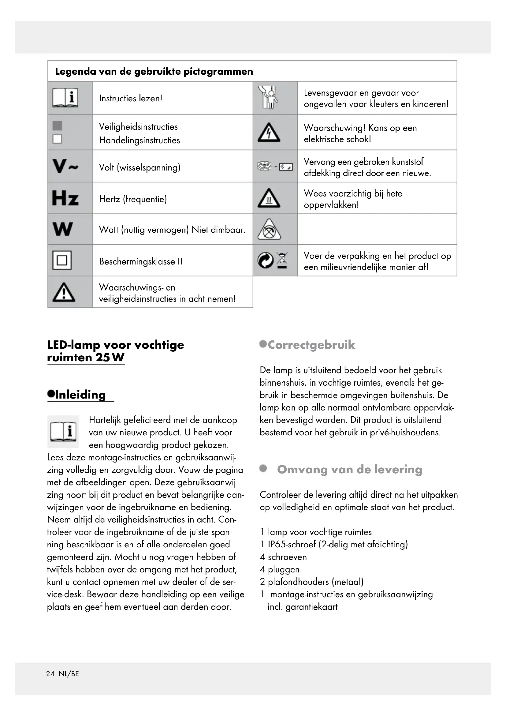Si le dommage n'est pas couvert par la garantie : Renvoyez-nous l'article non réparé en supportant les frais de transports existants. Veuillez nous communiquer le montant de ces frais. Faites réparer l'article contre facturation.23 NL/BE Inhoudsopgave Legenda van de gebruikte pictogrammen ..................................................... Pagina 24 Inleiding ....................................................................................................................................... Pagina 24 Correct gebruik ............................................................................................................................... Pagina 24 Omvang van de levering ................................................................................................................ Pagina 24 Beschrijving van de onderdelen ..................................................................................................... Pagina 25 Technische gegevens ...................................................................................................................... Pagina 25 Veiligheid .................................................................................................................................... Pagina 25 Veiligheidsinstructies ....................................................................................................................... Pagina 25 Voorbereiding ........................................................................................................................ Pagina 26 Benodigd gereedschap en materiaal ............................................................................................ Pagina 26 Voor de installatie ............................................................................................................... Pagina 26 Ingebruikname ...................................................................................................................... Pagina 26 Lamp monteren ................................................................................................................................ Pagina 26 Lamp aan- / uitschakelen ................................................................................................................ Pagina 27 Onderhoud en reiniging ................................................................................................. Pagina 27 Afvoer ............................................................................................................................................ Pagina 27 Verklaring van overeenstemming ........................................................................ Pagina 27 Garantie / Service ................................................................................................................. Pagina 27 Garantie .......................................................................................................................................... Pagina 27 Serviceadres .................................................................................................................................... Pagina 28 Garantiekaart .................................................................................................................................. Pagina 28 Garantie / Service24 NL/BE Inleiding / Veiligheid Inleiding LED-lamp voor vochtige ruimten 25 W Inleiding Hartelijk gefeliciteerd met de aankoop van uw nieuwe product. U heeft voor een hoogwaardig product gekozen. Lees deze montage-instructies en gebruiksaanwij- zing volledig en zorgvuldig door. Vouw de pagina met de afbeeldingen open. Deze gebruiksaanwij- zing hoort bij dit product en bevat belangrijke aan- wijzingen voor de ingebruikname en bediening. Neem altijd de veiligheidsinstructies in acht. Con- troleer voor de ingebruikname of de juiste span- ning beschikbaar is en of alle onderdelen goed gemonteerd zijn. Mocht u nog vragen hebben of twijfels hebben over de omgang met het product, kunt u contact opnemen met uw dealer of de ser- vice-desk. Bewaar deze handleiding op een veilige plaats en geef hem eventueel aan derden door. Correct gebruik De lamp is uitsluitend bedoeld voor het gebruik binnenshuis, in vochtige ruimtes, evenals het ge- bruik in beschermde omgevingen buitenshuis. De lamp kan op alle normaal ontvlambare oppervlak- ken bevestigd worden. Dit product is uitsluitend bestemd voor het gebruik in privé-huishoudens. Omvang van de levering Controleer de levering altijd direct na het uitpakken op volledigheid en optimale staat van het product. 1 lamp voor vochtige ruimtes 1 IP65-schroef (2-delig met afdichting) 4 schroeven 4 pluggen 2 plafondhouders (metaal) 1 montage-instructies en gebruiksaanwijzing incl. garantiekaart Legenda van de gebruikte pictogrammen Instructies lezen! Levensgevaar en gevaar voor ongevallen voor kleuters en kinderen! Veiligheidsinstructies Handelingsinstructies Waarschuwing! Kans op een elektrische schok! Volt (wisselspanning) Vervang een gebroken kunststof afdekking direct door een nieuwe. Hertz (frequentie) Wees voorzichtig bij hete oppervlakken! Watt (nuttig vermogen) Niet dimbaar. Beschermingsklasse II Voer de verpakking en het product op een milieuvriendelijke manier af! Waarschuwings- en veiligheidsinstructies in acht nemen!25 NL/BE Inleiding / Veiligheid Beschrijving van de onderdelen