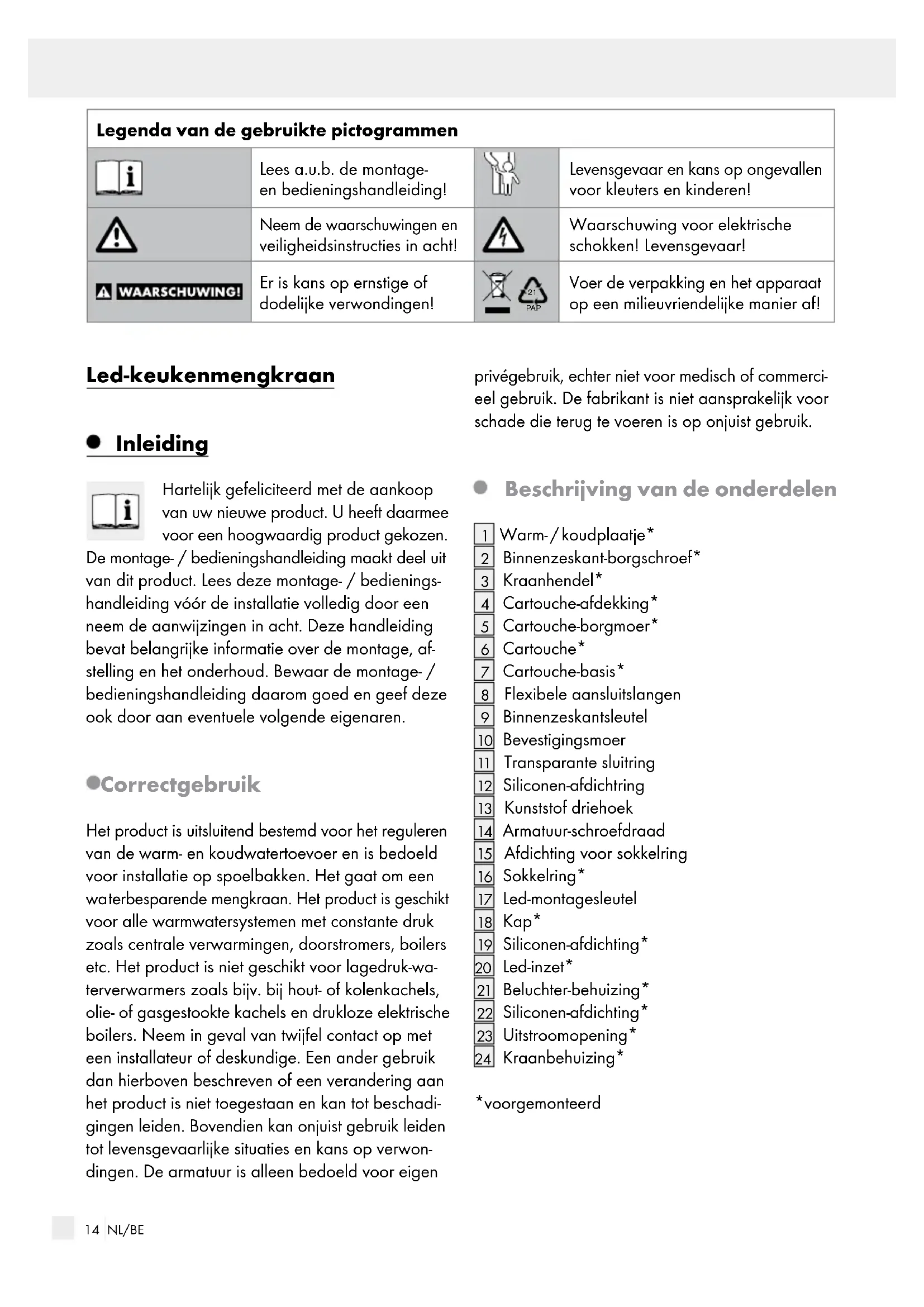 PAP Voer de verpakking en het apparaat op een milieuvriendelijke manier af! Led-keukenmengkraan Inleiding Hartelijk gefeliciteerd met de aankoop van uw nieuwe product. U heeft daarmee voor een hoogwaardig product gekozen. De montage- / bedieningshandleiding maakt deel uit van dit product. Lees deze montage- / bedienings- handleiding vóór de installatie volledig door een neem de aanwijzingen in acht. Deze handleiding bevat belangrijke informatie over de montage, af- stelling en het onderhoud. Bewaar de montage- / bedieningshandleiding daarom goed en geef deze ook door aan eventuele volgende eigenaren. Correct gebruik Het product is uitsluitend bestemd voor het reguleren van de warm- en koudwatertoevoer en is bedoeld voor installatie op spoelbakken. Het gaat om een