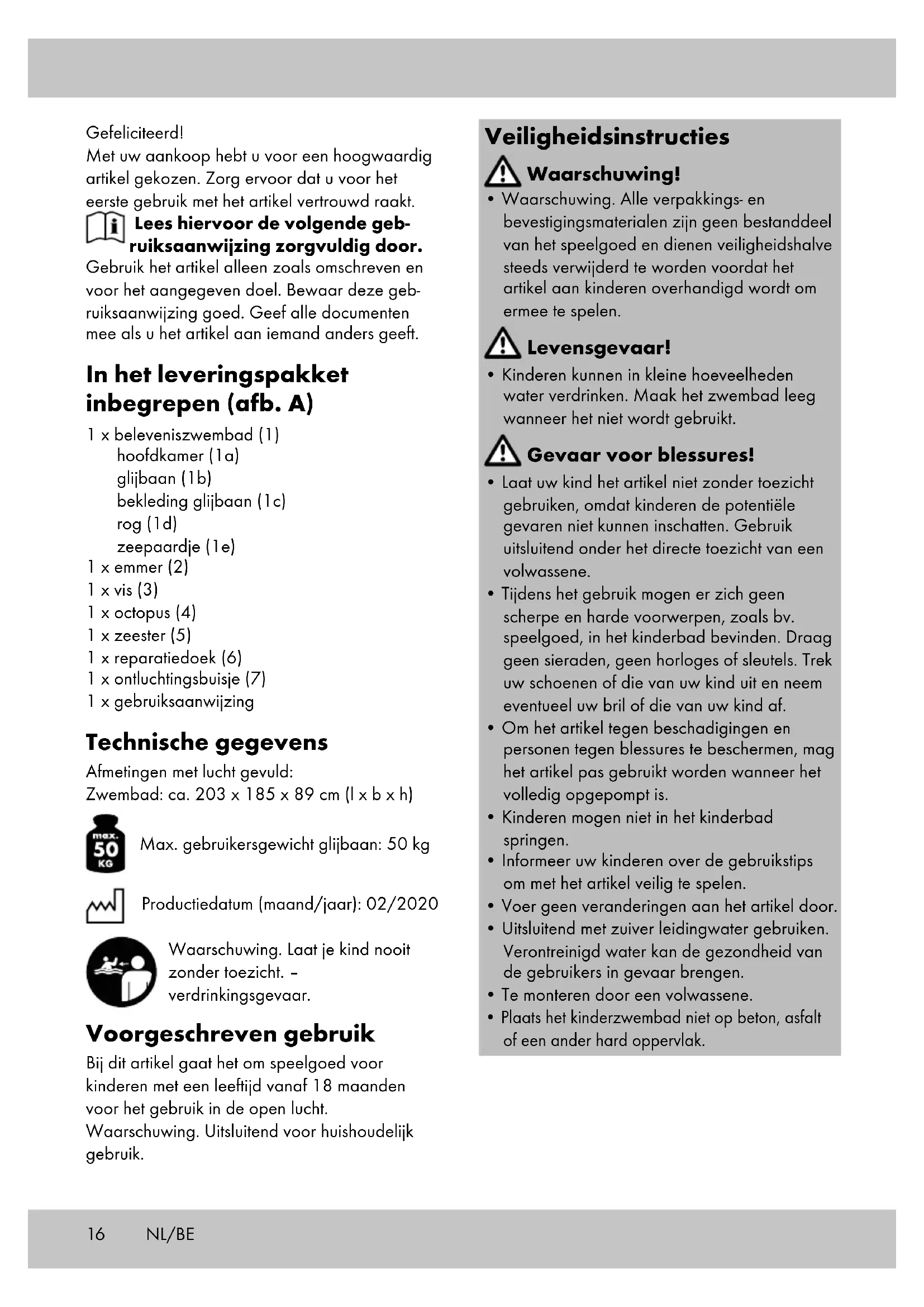 zet de reparatiedoek op het beschadigde oppervlak en druk de reparatiedoek stevig aan. NL/BE19 Opslag, reiniging Ververs het water in het artikel vaak, in het bijzonder bij warm weer en wanneer het vervuild is! Berg het artikel bij niet-gebruik altijd niet opgepompt, droog en schoon bij kamertemperatuur op. De ventielen dienen bij de opslag steeds gesloten te zijn. Uitsluitend met water of zeepwater en nooit met chemische onderhoudsproducten reinigen. Bij de opslag tijdens de winter geen scherpe voorwerpen op het artikel zetten en niet met talkpoeder bestrooien. BELANGRIJK! Reinig nooit met agressieve reinigingsmiddelen. Afvalverwerking Voer het artikel en verpakkingsmaterialen in overeenstemming met actuele lokale voor- schriften af. Verpakkingsmaterialen, zoals bv. foliezakjes, horen niet thuis in kinderhanden. Berg het verpakkingsmateriaal buiten het bereik van kinderen op. Voer de producten en verpakkingen op milieuvriendelijke wijze af. De recyclingcode dient om verschillende materialen te kenmerken ten behoeve van hergebruik via het recyclingproces. De code bestaat uit het recyclingsymbool, dat het recyclingproces weerspiegelt, en een getal dat het materiaal identificeert. Opmerkingen over garantie en serviceafhandeling Het product is geproduceerd met grote zorg en onder voortdurende controle. U ontvangt een garantie van drie jaar op dit product, vanaf de datum van aankoop. Bewaar alstublieft uw aan- koopbewijs. De garantie geldt alleen voor mate- riaal- en fabricagefouten en vervalt bij foutief of oneigenlijk gebruik. Uw wettelijke rechten, met name het garantierecht, worden niet beïnvloed door deze garantie. In geval van reclamaties dient u zich aan de beneden genoemde service-hotline te wenden of zich per e-mail met ons in verbinding te zetten. Onze servicemedewerkers zullen de verdere handelswijze zo snel mogelijk met u afspreken. Wij zullen u in ieder geval persoonlijk te woord staan. De garantieperiode wordt na eventuele reparaties en op basis van de garantie, wettelij- ke garantie of coulance niet verlengd. Dit geldt ook voor vervangen en gerepareerde delen. Na afloop van de garantieperiode dienen even- tuele reparaties te worden betaald. IAN: 324798_1907 Service België Tel.: 070 270 171 (0,15 EUR/Min.) E-Mail: deltasport@lidl.be Service Nederland Tel.: 0900 0400223 (0,10 EUR/Min.) E-Mail: deltasport@lidl.nl NL/BE20 Gratulujemy! Decydując się na ten produkt, otrzymują Państ- wo towar wysokiej jakości. Należy zapoznać się z produktem przed jego pierwszym użyciem. Należy uważnie przeczytać następującą instrukcję użytkowan- ia. Produkt ten należy użytkować wyłącznie w opisany sposób oraz zgodnie ze wskazanym przeznaczeniem. Niniejszą instrukcję użytkow- ania należy przechowywać w bezpiecznym miejscu. Przekazując produkt innej osobie, należy upewnić się, że otrzyma ona także całą dokumentację dotyczącą produktu. Zakres dostawy (rys. A) 1 x basen dmuchany (1) komora główna (1a) zjeżdżalnia (1b) tapicerka zjeżdżalni (1c) płaszczka (1d) konik morski (1e) 1 x wiaderko (2) 1 x ryba (3) 1 x ośmiornica (4) 1 x rozgwiazda (5) 1 x łatka naprawcza (6) 1 x rurka do spuszczania powietrza (7) 1 x instrukcja użytkowania Dane techniczne Wymiary po napełnieniu powietrzem: niecka basenu: ok. 203 x 185 x 89 cm (dł. x szer. x wys.) Maks. masa użytkownika zjeżdżalni: 50 kg Data produkcji (miesiąc/rok): 02/2020 Ostrzeżenie. Nigdy nie zostawiaj swojego dziecka bez nadzoru - niebezpieczeństwo utonięcia. Zastosowanie zgodne z przeznaczeniem Niniejszy artykuł jest zabawką dla dzieci w wieku powyżej 18 miesięcy do użytku na wolnym powietrzu. Ostrzeżenie. Wyłącznie do użytku domowego. Wskazówki bezpieczeństwa Ostrzeżenie!