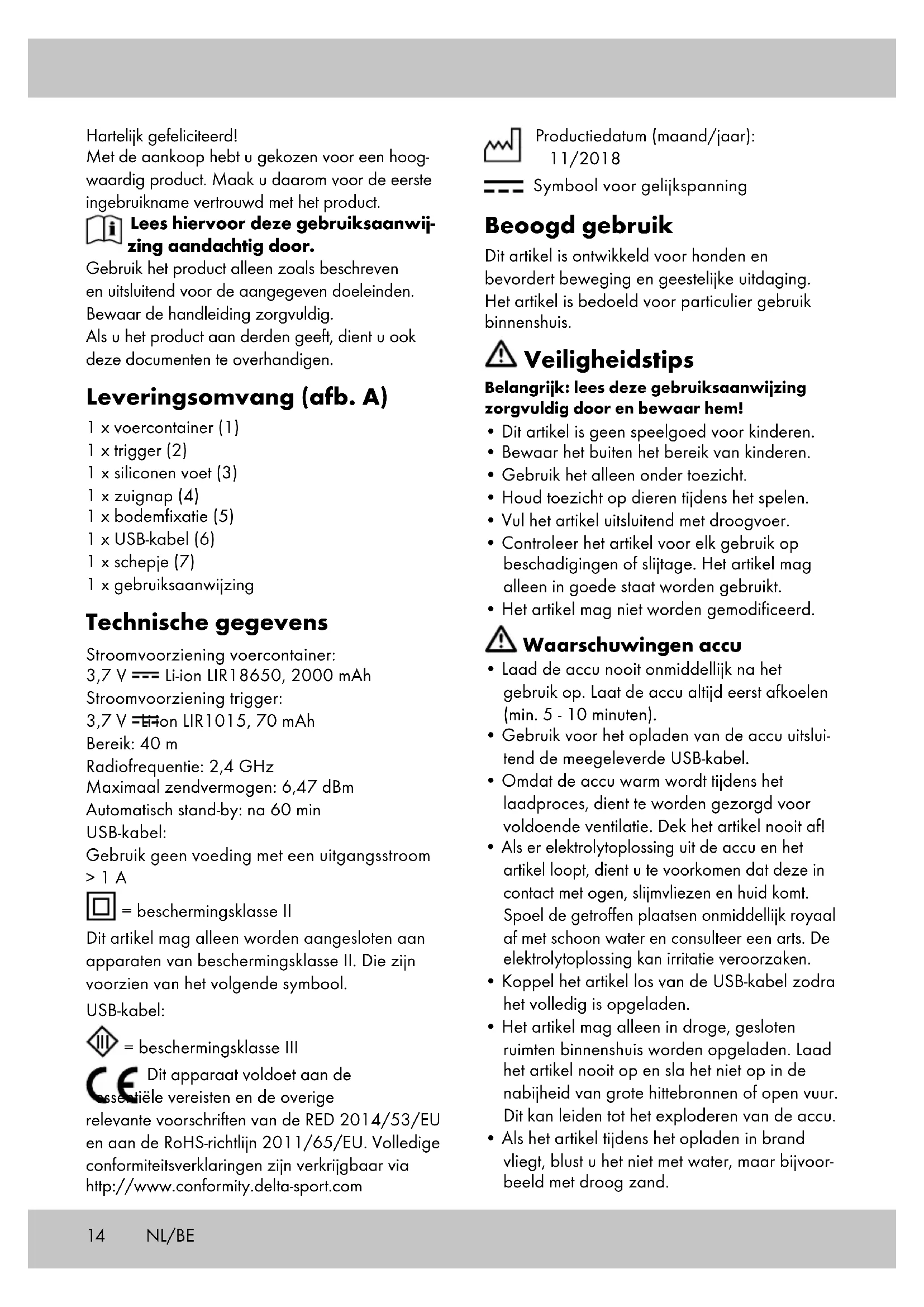 of poot wordt ingedrukt, klinkt er een signaal- toon. Gelijktijdig roteert het reservoir binnenin de voercontainer (1) en voert het voer via de beschikbare schacht uit naar het schuifvak (1b). Opslag, reiniging Het artikel altijd droog en netjes in een op tem- peratuur gebrachte kamer opbergen. Alleen met een vochtige reinigingsdoek reinigen en vervolgens droogvegen. BELANGRIJK! Nooit met chemische reinigings- middelen reinigen. Afvalverwerking Voer het artikel en verpakkingsmaterialen in overeenstemming met actuele lokale voor- schriften af. Verpakkingsmaterialen, zoals bv. foliezakjes, horen niet thuis in kinderhanden. Berg het verpakkingsmateriaal buiten het bereik van kinderen op. Apparaten die met het hiernaast afgebeel- de symbool gemarkeerd zijn, mogen niet samen met het huisvuil afgevoerd worden. U bent verplicht, dergelijke oude elektrische en elektronische apparaten afzonderlijk af te voeren. Gelieve bij uw gemeentebestuur naar de mogelijkheden van een reguliere afvalverwijde- ring te informeren. Voer de producten en verpakkingen op milieuvriendelijke wijze af. De recyclingcode dient om verschillende materialen te kenmerken ten behoeve van hergebruik via het recyclingproces. De code bestaat uit het recyclingsymbool, dat het recyclingproces weerspiegelt, en een getal dat het materiaal identificeert. Afvoermaatregelen accu In acht nemen a.u.b.: Dat het bij accu’s om bijzonder afval gaat dat volgens de wet niet samen met het huisvuil weggegooid mag worden. U kunt onbruikbaar geworden accu’s kosteloos op de gemeentelijke inzamelpunten of in de handel afgeven. Hier staan speciale verzamelbakken ter beschikking. Opmerkingen over garantie en service- afhandeling Het product is geproduceerd met grote zorg en onder voortdurende controle. U ontvangt een garantie van drie jaar op dit product, vanaf de datum van aankoop. Bewaar alstublieft uw aankoopbewijs. De garantie geldt alleen voor materiaal- en fa- bricagefouten en vervalt bij foutief of oneigenlijk gebruik. Uw wettelijke rechten, met name het garantierecht, worden niet beïnvloed door deze garantie. In geval van reclamaties dient u zich aan de beneden genoemde service-hotline te wenden of zich per e-mail met ons in verbinding te zetten. Onze servicemedewerkers zullen de verdere handelswijze zo snel mogelijk met u afspreken. Wij zullen u in ieder geval persoonlijk te woord staan. De garantieperiode wordt na eventuele repa- raties en op basis van de garantie, wettelijke garantie of coulance niet verlengd. Dit geldt ook voor vervangen en gerepareerde delen. Na afloop van de garantieperiode dienen eventuele reparaties te worden betaald. IAN: 292938 Service België Tel.: 070 270 171 (0,15 EUR/Min.) E-Mail: deltasport@lidl.be Service Nederland Tel.: 0900 0400223 (0,10 EUR/Min.) E-Mail: deltasport@lidl.nl NL/BE17 Herzlichen Glückwunsch! Mit Ihrem Kauf haben Sie sich für einen hochwertigen Artikel entschie- den. Machen Sie sich vor der ersten Inbetrieb- nahme mit dem Artikel vertraut. Lesen Sie hierzu aufmerksam die nachfolgende Gebrauchsanwei- sung und die Sicherheitshinweise. Benutzen Sie den Artikel nur wie beschrieben und für die angegebenen Einsatzbereiche. Bewahren Sie diese Anweisung gut auf. Händigen Sie alle Unterlagen bei Weitergabe des Artikels an Dritte ebenfalls mit aus. Lieferumfang (Abb. A) 1 x Futtercontainer (1) 1 x Auslöser (2) 1 x Silikonstandfuß (3) 1 x Saugnapf (4) 1 x Bodenfixierung (5) 1 x USB-Kabel (6) 1 x Schaufel (7) 1 x Gebrauchsanweisung Technische Daten Energieversorgung Futtercontainer: 3,7V Li-Ion LIR18650, 2000 mAh Energieversorgung Auslöser: 3,7V Li-Ion LIR1015, 70 mAh Reichweite: 40 m Funkfrequenz: 2,4 GHz Maximale Sendeleistung: 6,47 dBm Auto-Standby: nach 60 min USB-Kabel: Verwenden Sie keine Netzteile mit einem Ausgangsstrom >1A = Schutzklasse II Dieser Artikel darf nur an Geräten der Schutz- klasse II angeschlossen werden, die dieses Symbol tragen. USB-Kabel: = Schutzklasse III Dieses Gerät entspricht hinsichtlich Übereinstimmung mit den grundlegen- den Anforderungen und den anderen relevanten Vorschriften der RED 2014/53/EU sowie der RoHS-Richtlinie 2011/65/EU. Vollständige Konformitätserklärungen sind erhält- lich unter http://www.conformity.delta-sport.com Herstellungsdatum (Monat/Jahr): 11/2018 Symbol für Gleichspannung Bestimmungsgemäße Verwendung Dieser Artikel ist für Hunde zur Förderung der Bewegung und geistigen Herausforderung ent- wickelt worden. Der Artikel ist für den privaten Gebrauch im Innenbereich bestimmt. Sicherheitshinweise Wichtig: Lesen Sie diese Gebrauchsan- weisung sorgfältig und bewahren Sie sie unbedingt auf!