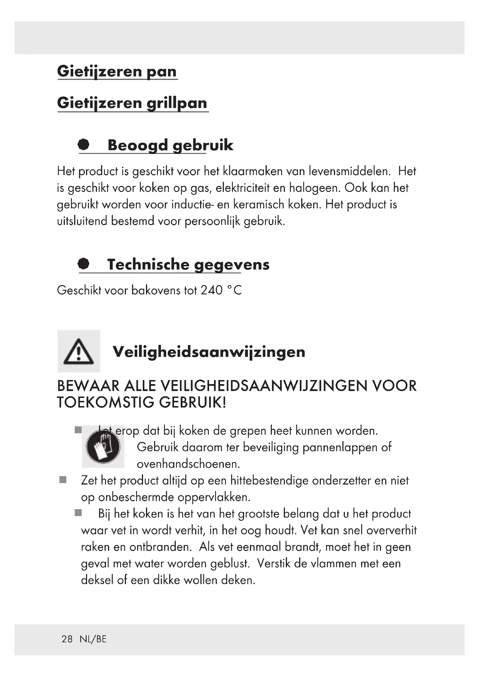 TOEKOMSTIG GEBRUIK! Let erop dat bij koken de grepen heet kunnen worden. Gebruik daarom ter beveiliging pannenlappen of ovenhandschoenen. Zet het product altijd op een hittebestendige onderzetter en niet op onbeschermde oppervlakken. Bij het koken is het van het grootste belang dat u het product waar vet in wordt verhit, in het oog houdt. Vet kan snel oververhit raken en ontbranden. Als vet eenmaal brandt, moet het in geen geval met water worden geblust. Verstik de vlammen met een deksel of een dikke wollen deken.29 NL/BE Let erop dat u het product nooit verhit als het leeg is. Gebeurt dat toch dan kan het emaille afschilferen. Gebruik om de zwarte emaillen coating niet te beschadigen alleen keukenhulpen gemaakt van hittebestendig kunststof of van hout. Snijd de gaargekookte producten niet direct in de pan. Leg geen kletsnat vlees in heet vet. Het op een gloeiende kookplaat spattend vet kan gemakkelijk brand veroorzaken. Opgelet! Til het product altijd recht omhoog als u op kookplaten met een glazen oppervlak ( bijv. glaskeramische, halogeen- of inductiekookplaten) of in een oven kookt. Schuif het product nooit over zulke oppervlakken omdat daardoor de onderkant van het product, het kookoppervlak of de oven beschadigd kunnen worden. De grootte van de gasvlam moet altijd zo aangepast worden aan het bodem van het product dat de gasvlam NIET buiten de zijkanten van het product te zien is. Het product is niet geschikt voor gebruik in de magnetron. Het product kan in de oven gebruikt worden! Zet het product op een daarvoor bestemd rooster en niet op de bodem van de oven. Het product is niet geschikt voor de vaatwasser.