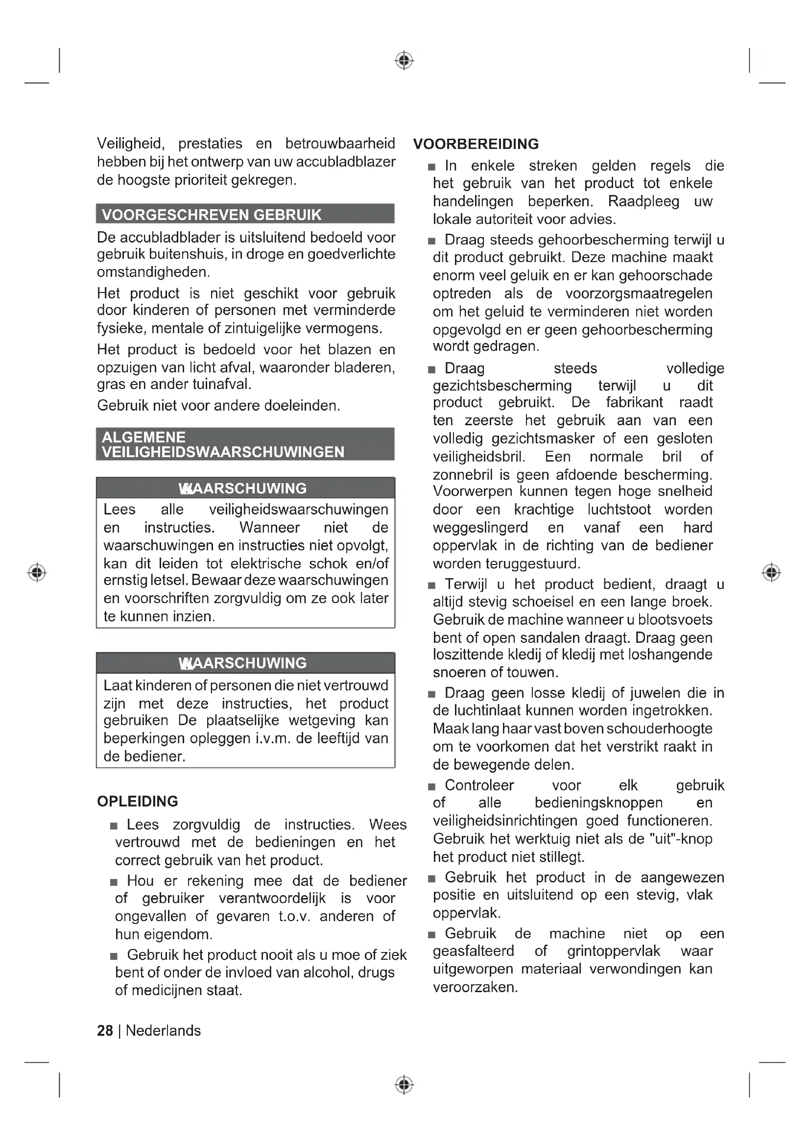 – het product onbeheerd achterlaten – verwijderen van blokkades – controleren, schoonmaken en onderhouden van het product – het product inspecteert na het raken van een vreemd voorwerp ■ Bij een incident of defect moet onmiddellijk de accu worden verwijderd. Gebruik het product niet opnieuw totdat het volledig is gecontroleerd door een erkend onderhoudscentrum. VEILIGHEIDSWAARSCHUWINGEN VOOR DE BLAZER