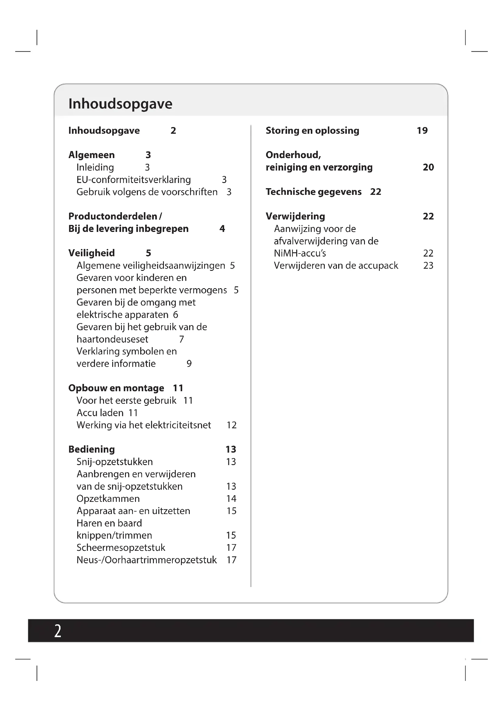 Inhoudsopgave 2 Algemeen 3 Inleiding 3 EU-conformiteitsverklaring 3 Gebruik volgens de voorschriften 3 Productonderdelen / Bijdeleveringinbegrepen 4 Veiligheid 5 Algemene veiligheidsaanwijzingen 5 Gevaren voor kinderen en personenmet beperkte vermogens 5 Gevaren bij de omgang met elektrische apparaten 6 Gevaren bij het gebruik van de haartondeuseset 7 Verklaring symbolen en verdereinformatie 9 Opbouw en montage 11 Voor het eerste gebruik 11 Accu laden 11 Werking via het elektriciteitsnet 12 Bediening 13 Snij-opzetstukken 13 Aanbrengen en verwijderen van de snij-opzetstukken 13 Opzetkammen 14 Apparaat aan- en uitzetten 15 Haren en baard knippen/trimmen 15 Scheermesopzetstuk 17 Neus-/Oorhaartrimmeropzetstuk 17 Storing en oplossing 19 Onderhoud, reinigingenverzorging 20 Technische gegevens 22 Verwijdering 22 Aanwijzing voor de afvalverwijdering van de NiMH-accu’s 22 Verwijderen van de accupack 23 Inhoudsopgave3