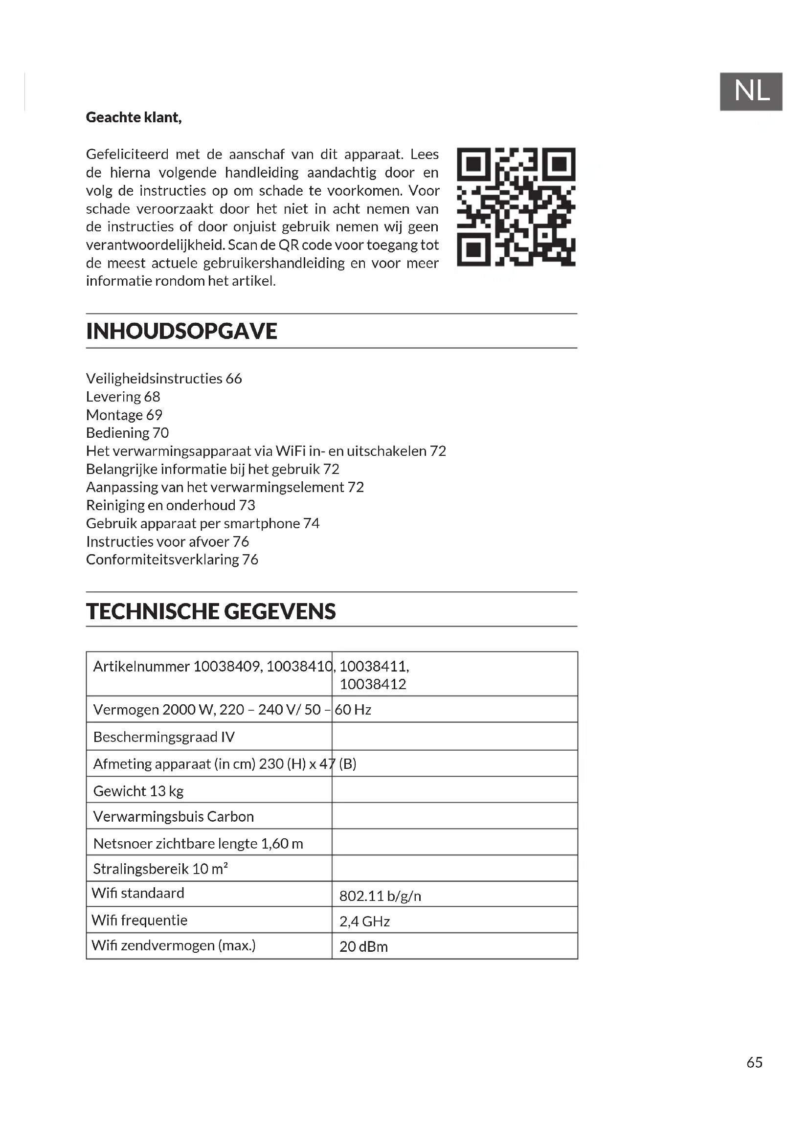 Geachte klant, Gefeliciteerd met de aanschaf van dit apparaat. Lees de hierna volgende handleiding aandachtig door en volg de instructies op om schade te voorkomen. Voor schade veroorzaakt door het niet in acht nemen van de instructies of door onjuist gebruik nemen wij geen verantwoordelijkheid. Scan de QR code voor toegang tot de meest actuele gebruikershandleiding en voor meer informatie rondom het artikel. INHOUDSOPGAVE Veiligheidsinstructies 66 Levering 68 Montage 69 Bediening 70 Het verwarmingsapparaat via WiFi in- en uitschakelen 72 Belangrijke informatie bij het gebruik 72 Aanpassing van het verwarmingselement 72 Reiniging en onderhoud 73 Gebruik apparaat per smartphone 74 Instructies voor afvoer 76 Conformiteitsverklaring 76 TECHNISCHE GEGEVENS Artikelnummer 10038409, 10038410, 10038411,