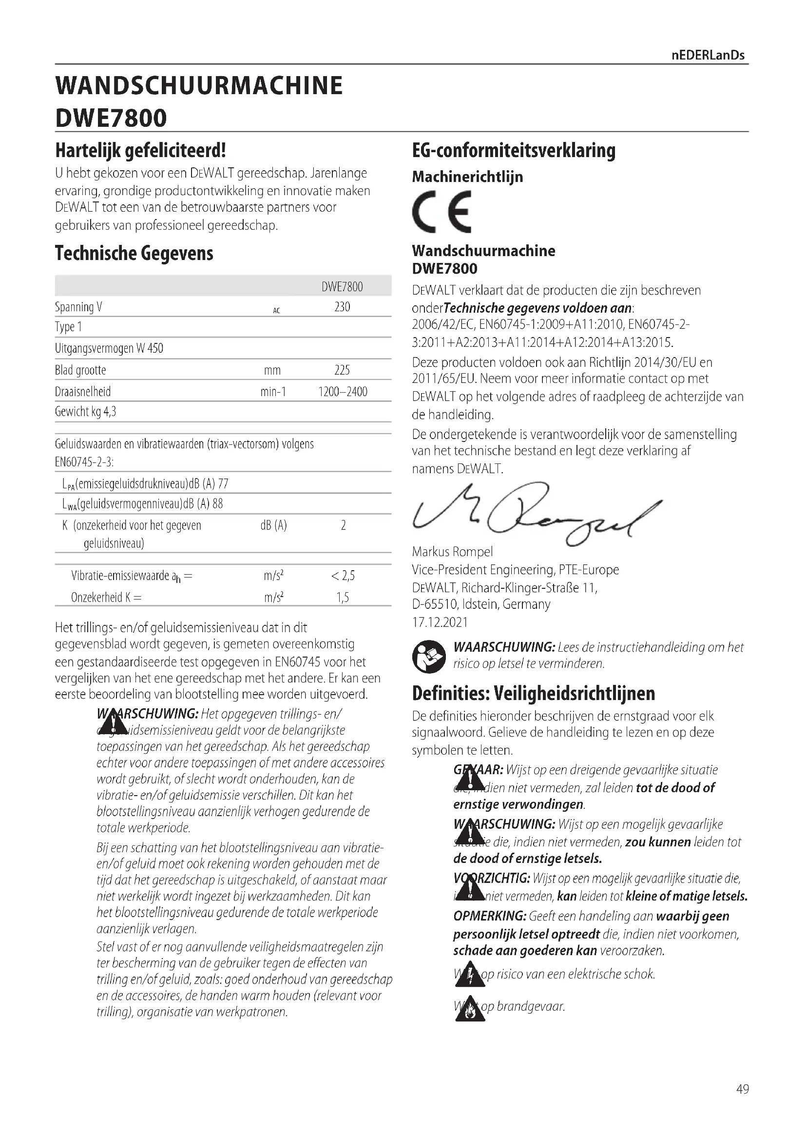 AVVERTENZA: non utilizzare mai solventi o altri prodotti chimici aggressivi per pulire le parti non metalliche dell’utensile. Queste sostanze chimiche rischiano di indebolire i materiali di cui sono fatte tali parti; usare un panno inumidito solo con acqua e detergente neutro. Non lasciare che penetri del liquido all’interno dell’utensile e non immergere alcuno dei suoi componenti direttamente in unliquido. Le feritoie di ventilazione possono essere pulite con uno spazzolino asciutto e morbido di materiale non metallico e/o con un aspirapolvere adatto. Non utilizzare acqua o soluzioni detergenti. Indossare occhiali di protezione e una mascherina antipolvereomologati. Lubrificazione L’apparato non richiede alcuna ulteriorelubrificazione.49 nEDERLanDs WAARSCHUWING: Lees de instructiehandleiding om het risico op letsel teverminderen. Definities: Veiligheidsrichtlijnen De definities hieronder beschrijven de ernstgraad voor elk signaalwoord. Gelieve de handleiding te lezen en op deze symbolen teletten. GEVAAR: Wijst op een dreigende gevaarlijke situatie die, indien niet vermeden, zal leiden tot de dood of ernstigeverwondingen. WAARSCHUWING: Wijst op een mogelijk gevaarlijke situatie die, indien niet vermeden, zou kunnen leiden tot de dood of ernstigeletsels. VOORZICHTIG: Wijst op een mogelijk gevaarlijke situatie die, indien niet vermeden, kan leiden tot kleine of matigeletsels. OPMERKING: Geeft een handeling aan waarbij geen persoonlijk letsel optreedt die, indien niet voorkomen, schade aan goederen kanveroorzaken. Wijst op risico van een elektrischeschok. Wijst opbrandgevaar. EG‑conformiteitsverklaring Machinerichtlijn Wandschuurmachine DWE7800 DeWALT verklaart dat de producten die zijn beschreven onderTechnische gegevens voldoen aan: 2006/42/EC, EN60745‑1:2009+A11:2010, EN60745‑2‑3:2011+A2:2013+A11:2014+A12:2014+A13:2015.Deze producten voldoen ook aan Richtlijn 2014/30/EU en 2011/65/EU. Neem voor meer informatie contact op met DeWALT op het volgende adres of raadpleeg de achterzijde van dehandleiding.De ondergetekende is verantwoordelijk voor de samenstelling van het technische bestand en legt deze verklaring af namensDeWALT.Markus Rompel Vice‑President Engineering, PTE‑Europe DeWALT, Richard‑Klinger‑Straße 11, D‑65510, Idstein, Germany 17.12.2021Het trillings‑ en/of geluidsemissieniveau dat in dit gegevensblad wordt gegeven, is gemeten overeenkomstig een gestandaardiseerde test opgegeven in 60745 voor het vergelijken van het ene gereedschap met het andere. Er kan een eerste beoordeling van blootstelling mee wordenuitgevoerd. WAARSCHUWING: Het opgegeven trillings- en/ geluidsemissieniveau geldt voor de belangrijkste toepassingen van het gereedschap. Als het gereedschap echter voor andere toepassingen of met andere accessoires wordt gebruikt, of slecht wordt onderhouden, kan de vibratie- en/of geluidsemissie verschillen. Dit kan het blootstellingsniveau aanzienlijk verhogen gedurende de totalewerkperiode.Bij een schatting van het blootstellingsniveau aan vibratie- en/of geluid moet ook rekening worden gehouden met de tijd dat het gereedschap is uitgeschakeld, of aanstaat maar niet werkelijk wordt ingezet bij werkzaamheden. Dit kan het blootstellingsniveau gedurende de totale werkperiode aanzienlijkverlagen.Stel vast of er nog aanvullende veiligheidsmaatregelen zijn ter bescherming van de gebruiker tegen de effecten van trilling en/of geluid, zoals: goed onderhoud van gereedschap en de accessoires, de handen warm houden (relevant voor trilling), organisatie vanwerkpatronen.DWE7800Spanning V