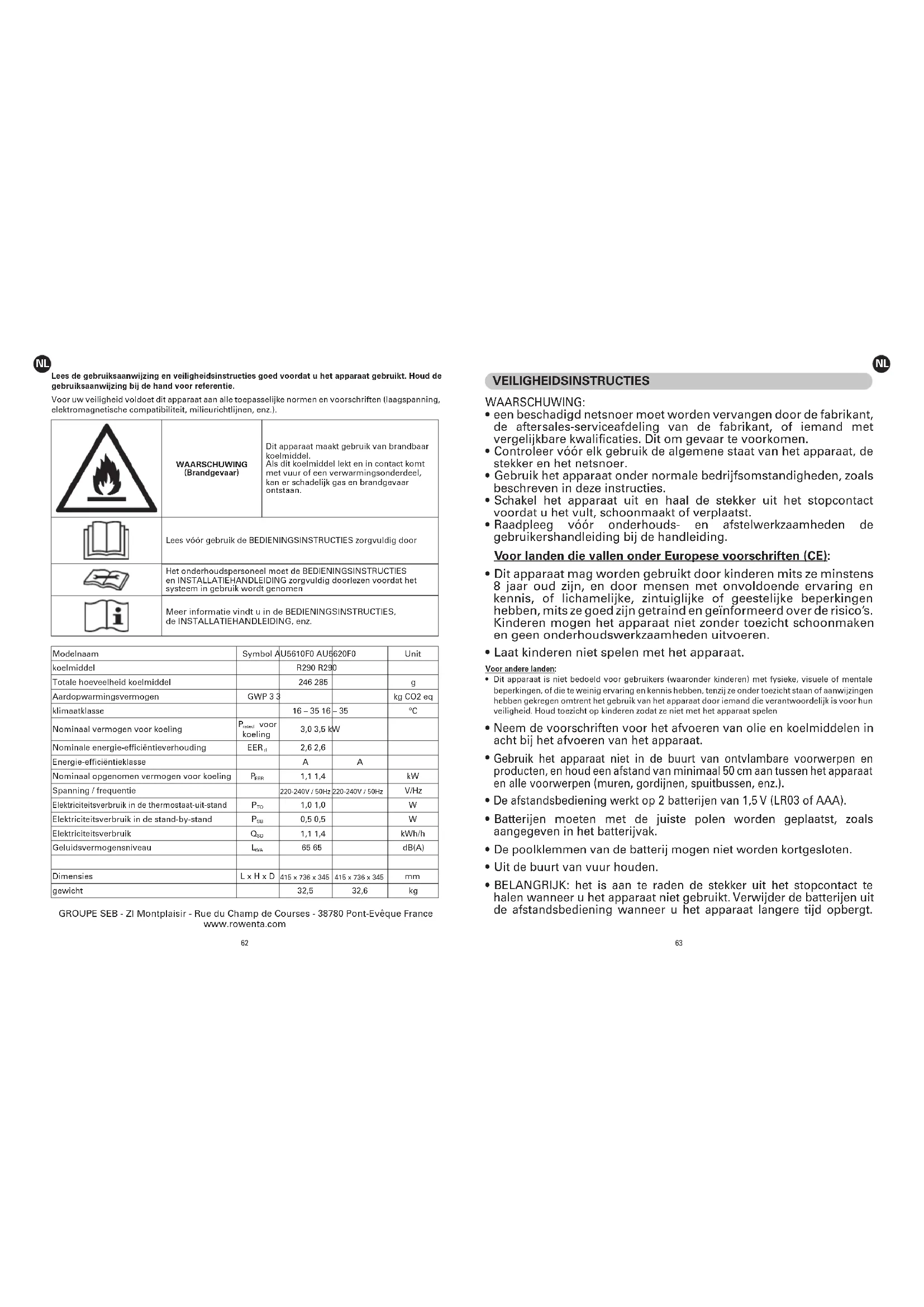 Lees de gebruiksaanwijzing en veiligheidsinstructies goed voordat u het apparaat gebruikt. Houd de gebruiksaanwijzing bij de hand voor referentie. Voor uw veiligheid voldoet dit apparaat aan alle toepasselijke normen en voorschriften (laagspanning, elektromagnetische compatibiliteit, milieurichtlijnen, enz.). WAARSCHUWING (Brandgevaar) Dit apparaat maakt gebruik van brandbaar koelmiddel. Als dit koelmiddel lekt en in contact komt met vuur of een verwarmingsonderdeel, kan er schadelijk gas en brandgevaar ontstaan. Lees vóór gebruik de BEDIENINGSINSTRUCTIES zorgvuldig door Het onderhoudspersoneel moet de BEDIENINGSINSTRUCTIES en INSTALLATIEHANDLEIDING zorgvuldig doorlezen voordat het systeem in gebruik wordt genomen Meer informatie vindt u in de BEDIENINGSINSTRUCTIES, de INSTALLATIEHANDLEIDING, enz. Modelnaam Symbol AU5610F0 AU5620F0 Unit koelmiddel R290 R290 Totale hoeveelheid koelmiddel