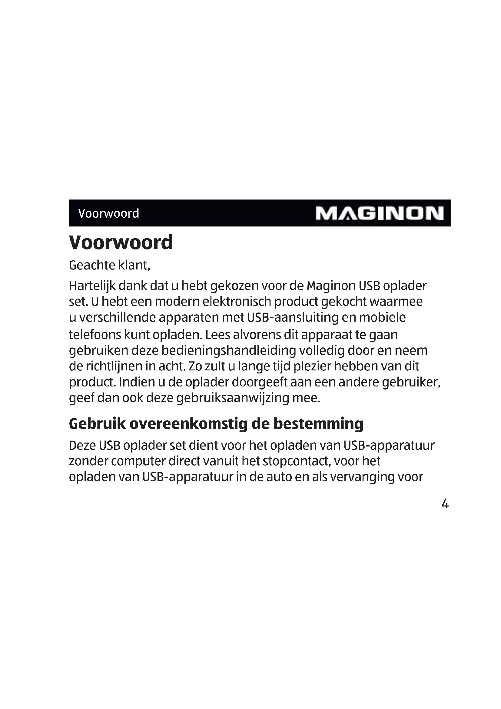 Hartelijk dank dat u hebt gekozen voor de Maginon USB oplader set. U hebt een modern elektronisch product gekocht waarmee u verschillende apparaten met USB-aansluiting en mobiele telefoons kut opladen. Lees alvorens dit apparaat te gaan gebruiken deze bedieningshandleiding volledig door en neem de richtlijnen in acht. Zo zult u langeijd plezier hebben van dit product. Indien u de oplader doorgeeft aan een andere gebruiker, geef dan ook deze gebruiksaanwijzing mee.