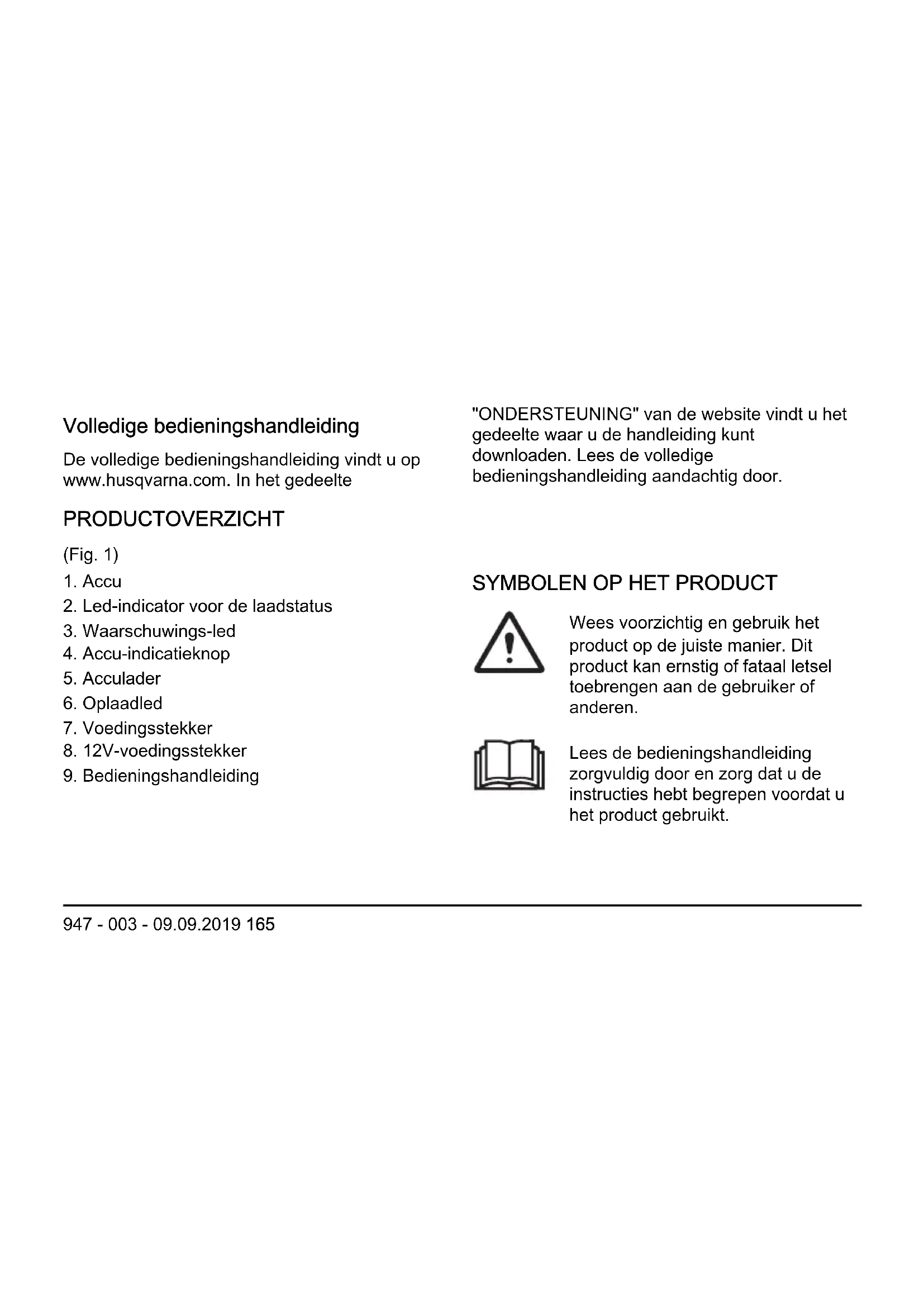 EG-richtlijnen. Het product of de verpakking ervan is geen huishoudelijk afval. Lever het in bij een geschikte verwijderingslocatie voor elektrische en elektronische apparatuur. Houd het apparaat uit de buurt van water en regen. Bewaar en gebruik de acculader alleen binnen. Let op: Andere symbolen/stickers op het product hebben betrekking op certificeringseisen voor een aantal commerciële markten. VEILIGHEIDSDEFINITIES Waarschuwingen, voorzorgsmaatregelen en opmerkingen worden gebruikt om te wijzen op belangrijke delen van de handleiding. WAARSCHUWING: Wordt gebruikt om te wijzen op de kans op ernstig of fataal letsel voor de gebruiker of omstanders wanneer de instructies in de handleiding niet worden gevolgd. 166 947 - 003 - 09.09.2019OPGELET: Wordt gebruikt indien er een risico bestaat op schade aan het product en andere eigendommen of aan de omgeving wanneer de instructies in de handleiding niet worden gevolgd. Let op: Geven verdere informatie die nodig is in een bepaalde situatie. BELANGRIJKE VEILIGHEIDSINSTRUCTIES WAARSCHUWING: Lees alle veiligheidswaarschuwingen en alle instructies. Het niet opvolgen van de waarschuwingen en instructies kan leiden tot elektrische schokken, brand en/of ernstig letsel. Let op: Bewaar alle waarschuwingen en instructies.