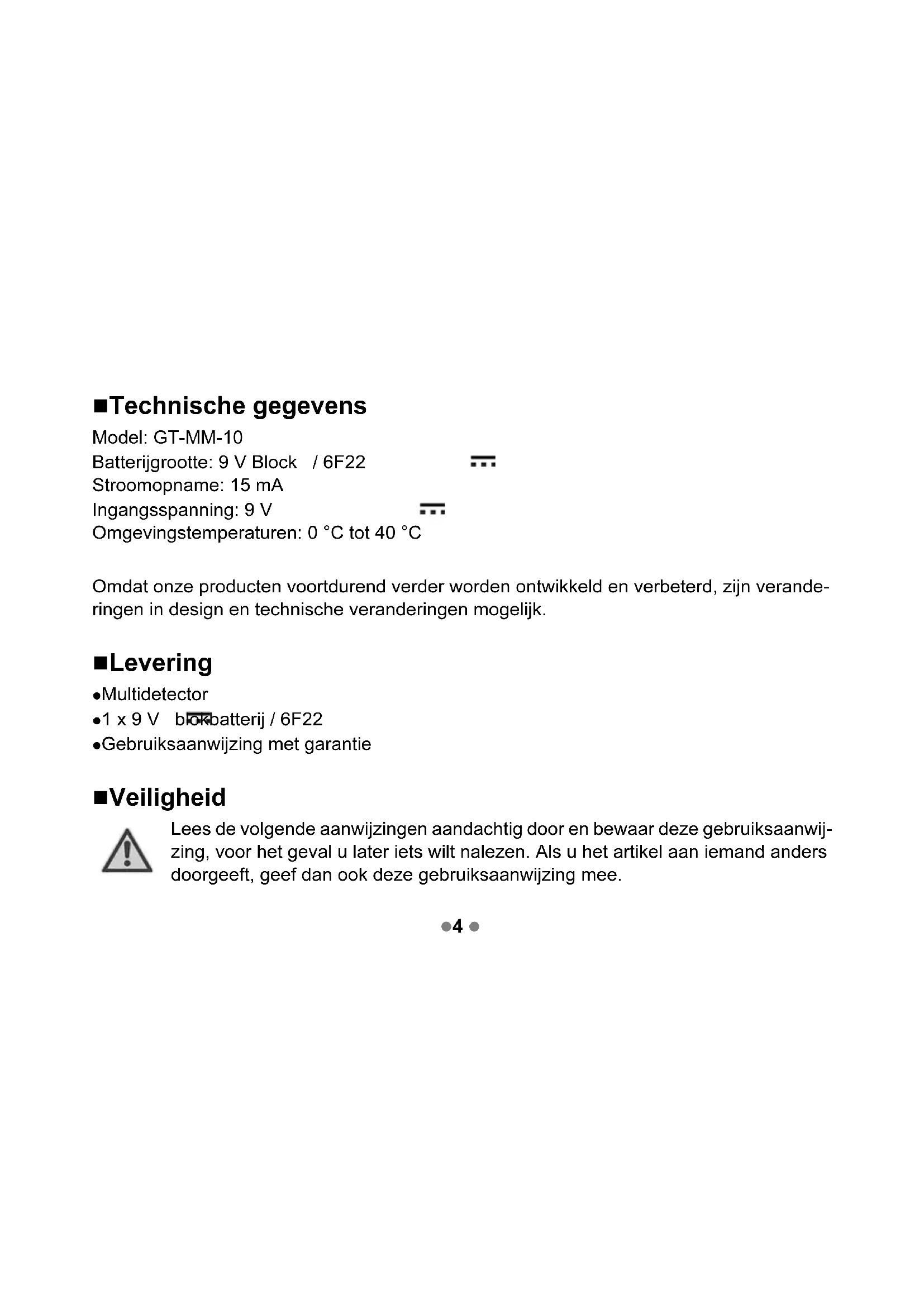 - Garantiebewijs Als het apparaat niet overeenkomstig deze gebruiksaanwijzing gebruikt wordt, kan de voorzie- ne bescherming negatief beïnvloed worden. Bewaar deze handleiding en geef deze door aan andere gebruikers. Druckbuch Multisensor Belgien.book Seite 3 Freitag, 19. April 2013 11:33 11 4 Technische gegevens Model: GT-MM-10 Batterijgrootte: 9 V Block / 6F22 Stroomopname: 15 mA Ingangsspanning: 9 V Omgevingstemperaturen: 0 °C tot 40 °C Omdat onze producten voortdurend verder worden ontwikkeld en verbeterd, zijn verande- ringen in design en technische veranderingen mogelijk. Levering Multidetector 1 x 9 V blokbatterij / 6F22 Gebruiksaanwijzing met garantie Veiligheid Lees de volgende aanwijzingen aandachtig door en bewaar deze gebruiksaanwij- zing, voor het geval u later iets wilt nalezen. Als u het artikel aan iemand anders doorgeeft, geef dan ook deze gebruiksaanwijzing mee. Druckbuch Multisensor Belgien.book Seite 4 Freitag, 19. April 2013 11:33 11 5 p. 55