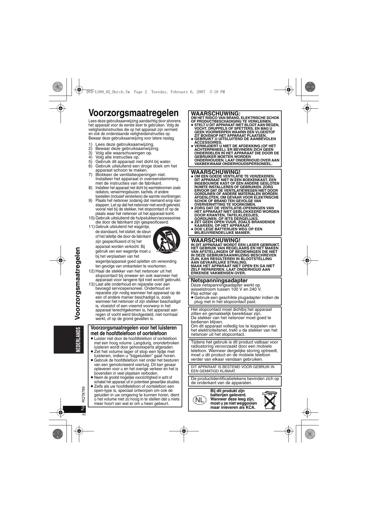 DVD-LS80_82_Dutch.fm Page 2 Tuesday, February 6, 2007 Voorzorgsmaatregelen Voorzorgsmaatregelen Lees deze gebruiksaanwijzing aandachtig door alvorens het apparaat voor de eerste keer te gebruiken. Volg de veiligheidsinstructies die op het apparaat zijn vermeld en ook de onderstaande veiligheidsinstructies op. Bewaar deze gebruiksaanwijzing voor latere naslag.