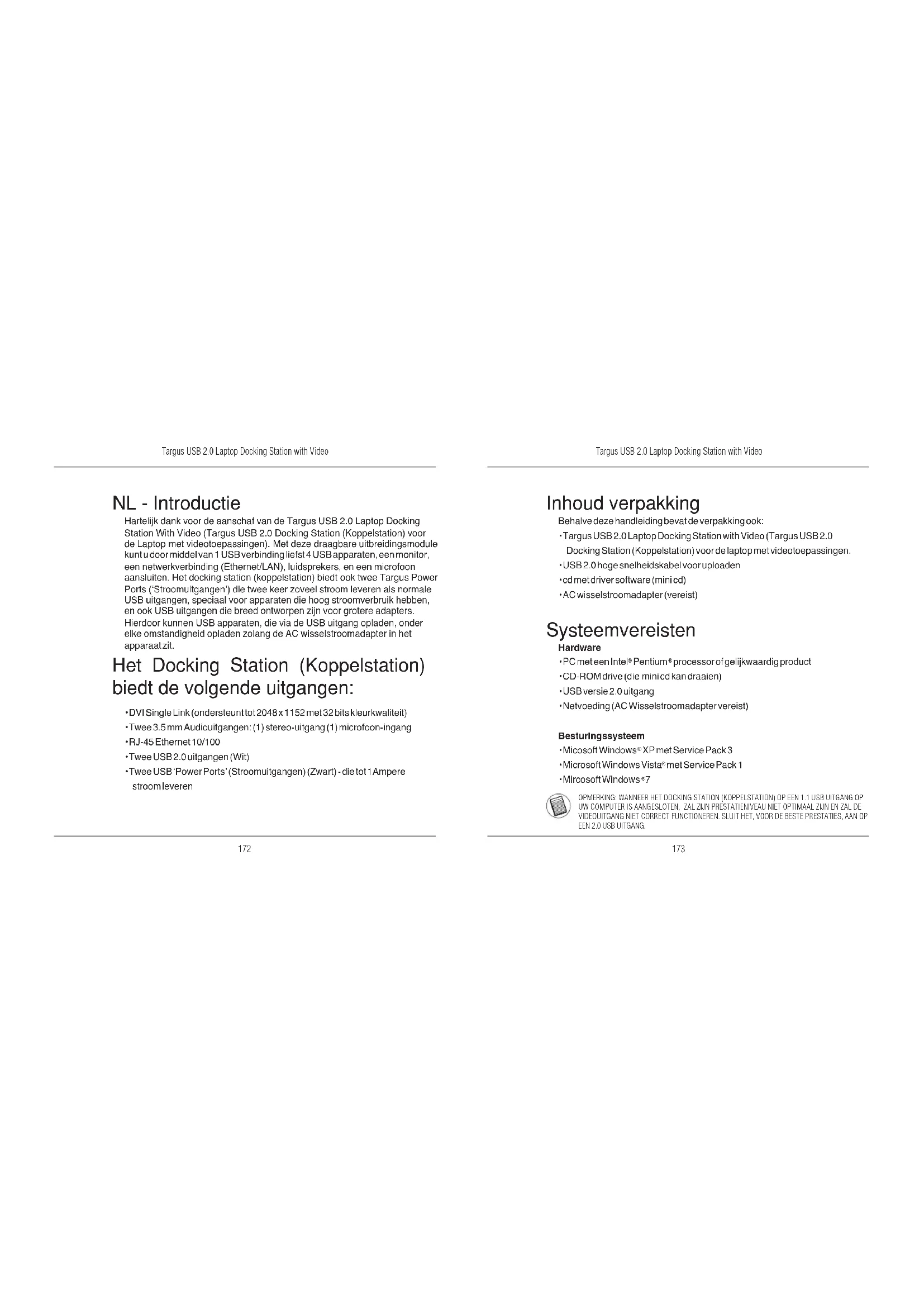 NL - Introductie Hartelijk dank voor de aanschaf van de Targus USB 2.0 Laptop Docking Station With Video (Targus USB 2.0 Docking Station (Koppelstation) voor de Laptop met videotoepassingen). Met deze draagbare uitbreidingsmodule kunt u door middel van 1 USB verbinding liefst 4 USB apparaten, een monitor, een netwerkverbinding (Ethernet/LAN), luidsprekers, en een microfoon aansluiten. Het docking station (koppelstation) biedt ook twee Targus Power Ports (‘Stroomuitgangen’) die twee keer zoveel stroom leveren als normale USB uitgangen, speciaal voor apparaten die hoog stroomverbruik hebben, en ook USB uitgangen die breed ontworpen zijn voor grotere adapters. Hierdoor kunnen USB apparaten, die via de USB uitgang opladen, onder elke omstandigheid opladen zolang de AC wisselstroomadapter in het apparaat zit. Het Docking Station (Koppelstation) biedt de volgende uitgangen:
