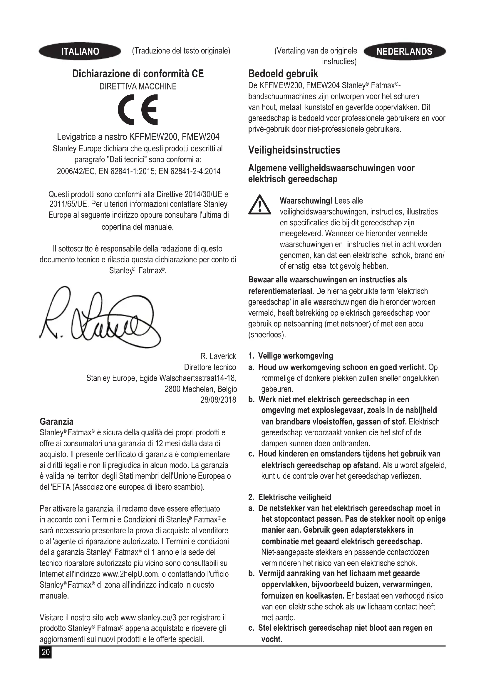 KFFMEW200, FMEW204 Bandschuurmachine Stanley Europe verklaart dat deze producten, beschreven onder "Technische gegevens", voldoen aan: 2006/42/EC, EN 62841-1:2015; EN 62841-2-4:2014 Deze producten voldoen ook aan richtlijn 2014/30/EU en 2011/65/EU. Neem voor meer informatie contact op met Stanley Europe op het volgende adres of raadpleeg de achterzijde van de handleiding. Ondergetekende is verantwoordelijk voor de compilatie van het technische bestand en geeft deze verklaring namens Stanley