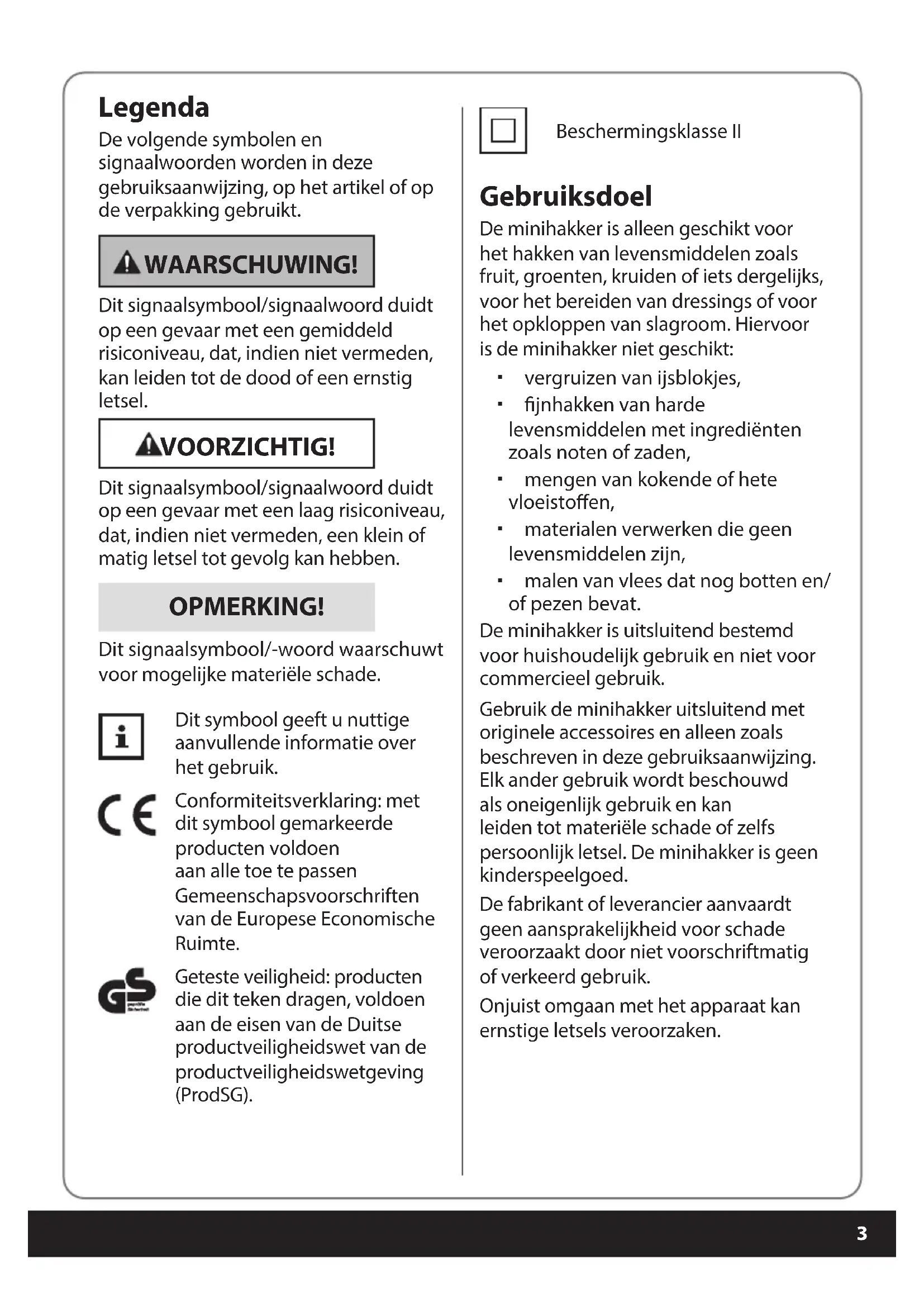 De minimakker is voorzien van scherpe messen. Onjuiste behandeling van de minimakker of afzonderlijke onderdelen kan leiden tot ernstige snijwonden.