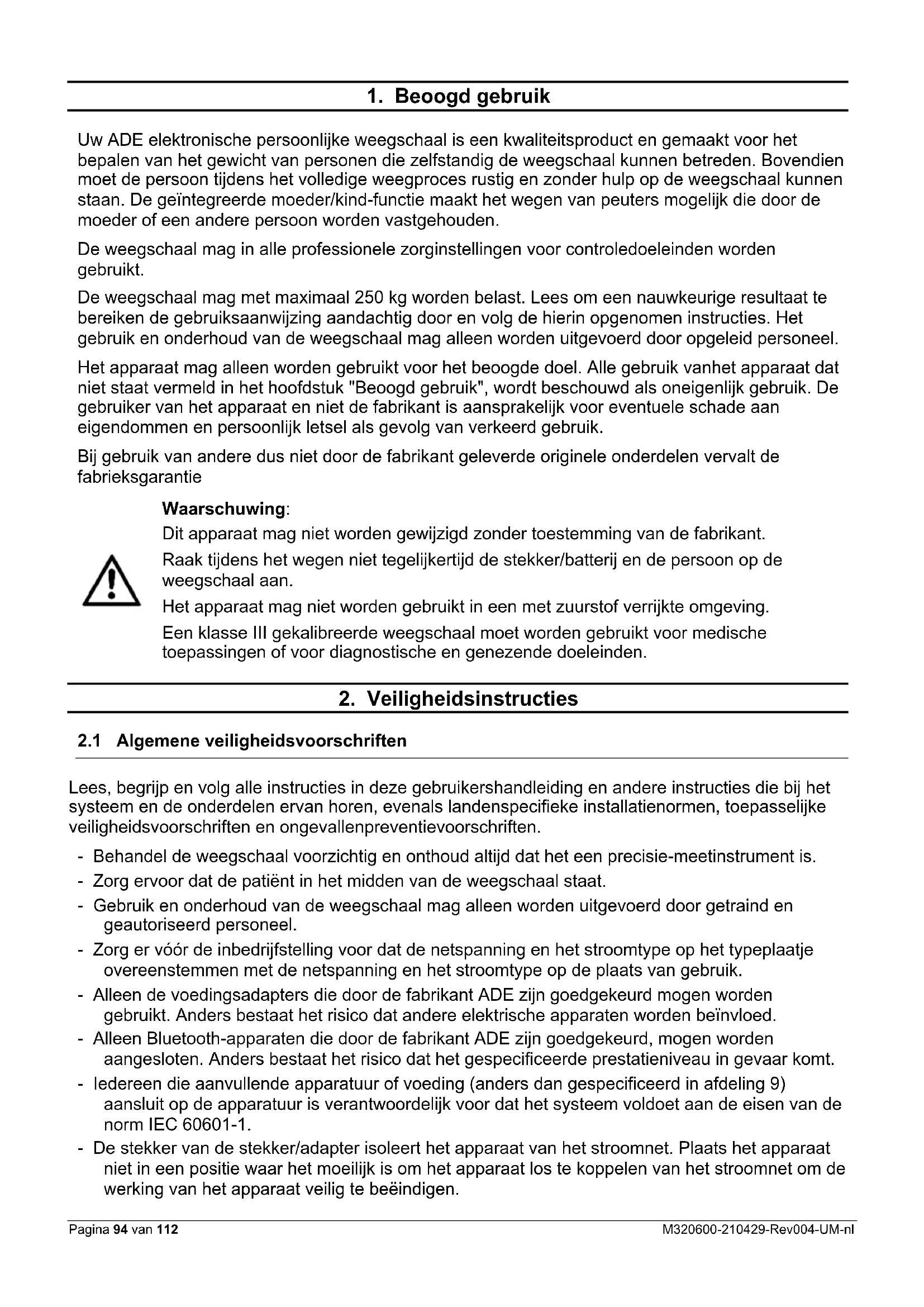 Lees, begrijp en volg alle instructies in deze gebruikershandleiding en andere instructies die bij het systeem en de onderdelen ervan horen, evenals landenspecifieke installatienormen, toepasselijke veiligheidsvoorschriften en ongevallenpreventievoorschriften. - Behandel de weegschaal voorzichtig en onthoud altijd dat het een precisie-meetinstrument is. - Zorg ervoor dat de patiënt in het midden van de weegschaal staat. - Gebruik en onderhoud van de weegschaal mag alleen worden uitgevoerd door getraind en geautoriseerd personeel. - Zorg er vóór de inbedrijfstelling voor dat de netspanning en het stroomtype op het typeplaatje overeenstemmen met de netspanning en het stroomtype op de plaats van gebruik. - Alleen de voedingsadapters die door de fabrikant ADE zijn goedgekeurd mogen worden gebruikt. Anders bestaat het risico dat andere elektrische apparaten worden beïnvloed. - Alleen Bluetooth-apparaten die door de fabrikant ADE zijn goedgekeurd, mogen worden aangesloten. Anders bestaat het risico dat het gespecificeerde prestatieniveau in gevaar komt. - Iedereen die aanvullende apparatuur of voeding (anders dan gespecificeerd in afdeling 9) aansluit op de apparatuur is verantwoordelijk voor dat het systeem voldoet aan de eisen van de norm IEC 60601-1. - De stekker van de stekker/adapter isoleert het apparaat van het stroomnet. Plaats het apparaat niet in een positie waar het moeilijk is om het apparaat los te koppelen van het stroomnet om de werking van het apparaat veilig te beëindigen.M320600-210429-Rev004-UM-nl Pagina 95 van 112 - Leg de aansluitkabel tussen weegschaal en netaansluiting zodanig dat deze geen struikelgevaar veroorzaakt. - Leg de verbindingskabel tussen weegschaal en netaansluiting zodanig dat deze geen verstikkingsgevaar veroorzaakt. - Schuif de weegschaal nooit heen en weer op de standplaats, omdat dit de weegcellen kan beschadigen. - Gebruik het apparaat alleen binnen de toegestane omgevingscondities. - Stel de weegschaal niet bloot aan hoge temperaturen, of dit nu te wijten is aan aangrenzende apparaten of zonnestralen. Het LCD-display zou daaronder kunnen lijden. - Gebruik de weegschaal bij constante omgevingstemperaturen en vermijd het gebruik in tocht, anders kunnen de meetresultaten worden beïnvloed. - Na opslag onder extreme omstandigheden minimaal 30 min. nodig totdat de weegschaal is geacclimatiseerd en gereed is voor gebruik. - Plaats de weegschaal zo mogelijk uit de buurt van andere apparaten of bronnen die elektromagnetische of andere storingen genereren, omdat deze de meetresultaten kunnen beïnvloeden. - Gebruik alleen goedgekeurde accessoires en randapparatuur. - Koppel de voedingsadapter los van het lichtnet voordat u het apparaat schoonmaakt. - Dompel het apparaat niet onder in water of andere vloeistoffen. - Als de weegschaal lange tijd niet wordt gebruikt, moet deze worden schoongemaakt en bewaard in een beschermende folie. De toevoeging van een droogmiddel is wenselijk. - Verwijder de batterijen als u de weegschaal gedurende langere tijd niet gebruikt. - Als u problemen hebt met dit apparaat, zoals het instellen, onderhouden of gebruiken, neem dan contact op met de geautoriseerde klantenservice. Open of repareer het apparaat niet zelf. - Meld geautoriseerde klantenservice bij onverwachte bediening of gebeurtenissen. Gebruik de weegschaal NIET: - als de voedingsadapter is beschadigd; - als de voedingsadapter niet werkt; - als het batterijvak onnatuurlijk uitpuilt; - na lange bewaring in een vochtige omgeving. Neem in deze gevallen contact op met de geautoriseerde klantendienst.Pagina 96 van 112 M320600-210429-Rev004-UM-nl