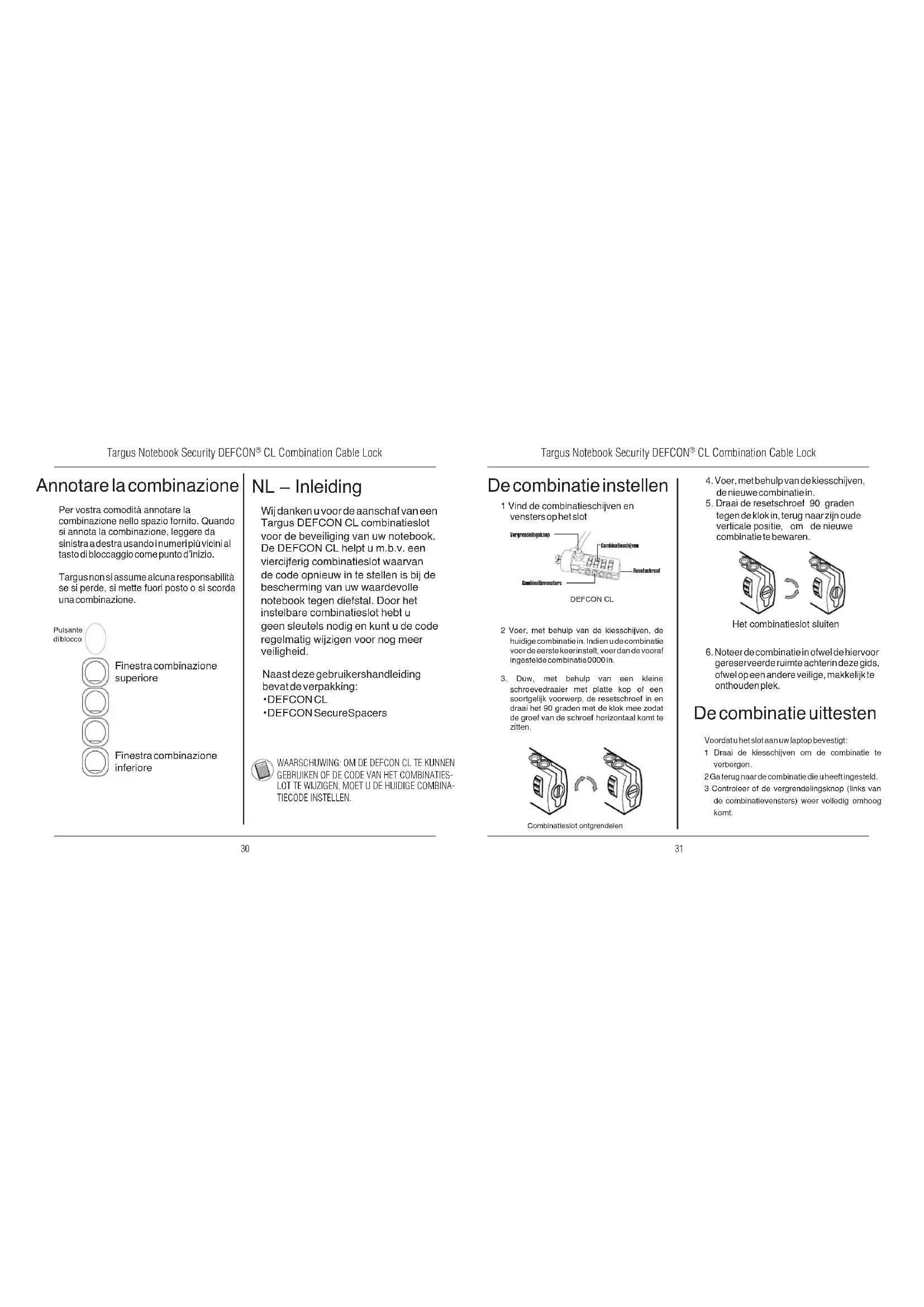 Annotare la combinazione Per vostra comodità annotare la combinazione nello spazio fornito. Quando si annota la combinazione, leggere da sinistra a destra usando i numeri più vicini al tasto di bloccaggio come punto d’inizio.Targus non si assume alcuna responsabilità se si perde, si mette fuori posto o si scorda una combinazione. Finestra combinazione superiore Pulsante di blocco Finestra combinazione inferiore Wij danken u voor de aanschaf van een Targus DEFCON CL combinatieslot voor de beveiliging van uw notebook. De DEFCON CL helpt u m.b.v. een viercijferig combinatieslot waarvan de code opnieuw in te stellen is bij de bescherming van uw waardevolle notebook tegen diefstal. Door het instelbare combinatieslot hebt u geen sleutels nodig en kunt u de code regelmatig wijzigen voor nog meer veiligheid. Naast deze gebruikershandleiding bevat de verpakking: