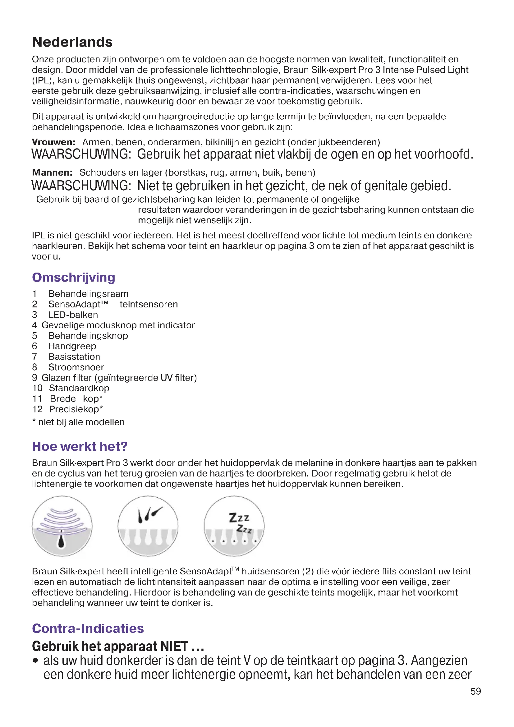 huidsensoren (2) die vóór iedere flits constant uw teint lezen en automatisch de lichtintensiteit aanpassen naar de optimale instelling voor een veilige, zeer effectieve behandeling. Hierdoor is behandeling van de geschikte teints mogelijk, maar het voorkomt behandeling wanneer uw teint te donker is. Contra-Indicaties Gebruik het apparaat NIET ...
