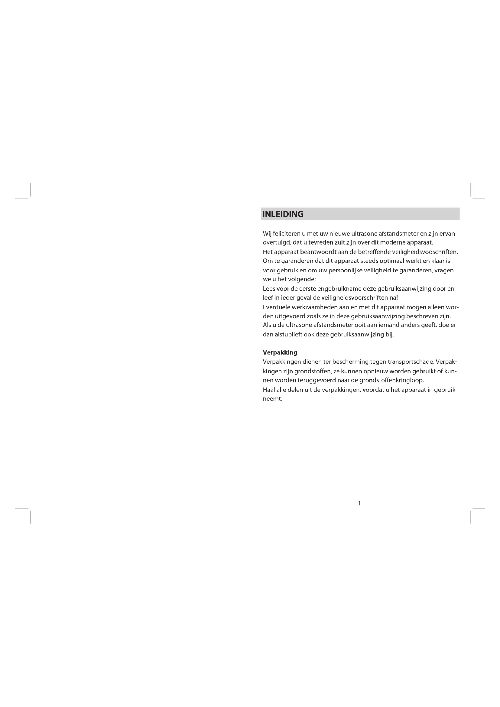 Het elektronisch meervoudige meetapparaat GT-UDM-07 bepaalt de afstand van een object door elektronisch opgewekte hogesnelheids- signalen. Het meetresultaat kan op het display worden afgelezen. Het apparaat heeft een computerchip en bezit een sleutelindicator- en geheugenfunctie, kan voor de ononderbroken, cumulatieve meting, automatische oppervlaktenberekening en volumetelling worden gebruikt en is een ideaal apparaat voor de bouw- en inrichtingsindustrie (bijv. voor makelaars in grond, meubelontwerpers en ambachtslieden, enz.). Het apparaat bezit een laseroriënteringfunctie, d.w.z. het zendt een rode laserstraal uit, waarmee u tijdens het gebruik licht op een object kunt richten. De automatische temperatuurafstemming van het apparaat leidt tot een nauwkeurig meetresultaat en laat tegelijkertijd de exacte omgevingstemperatuur zien4 5 Gebruik het juiste apparaat! In deze bedrijfshandleiding is het voorgeschreven gebruik beschreven. Waarschuwing! Het gebruik van andere dan de in deze handleiding aanbevolen voorzetapparaten en accessoires of de uitvoering van werkzaamheden met dit apparaat die niet overeenkomen met het voorgeschreven gebruik, kan tot ongevalsrisico‘s leiden. Controleer uw apparaat op beschadigingen! Laat het apparaat niet vallen. Controleer het apparaat voor het werk op beschadigingen. Controleer of het apparaat naar behoren zal functioneren. Gebruik het apparaat niet, als enig onderdeel defect is. Bewaar uw apparaten op een veilige plaats! Ongebruikte apparaten en batterijen moeten op een droge plaats wor- den bewaard die niet bereikbaar is voor kinderen. Reparaties: Dit apparaat beantwoordt aan de betreffende veiligheidsvoorschriften. Reparaties mogen alleen door bevoegde vakmensen en met originele reserveonderdelen worden uitgevoerd, anders bestaat er gevaar voor ongelukken voor de gebruiker. Houd ook rekening met het volgende: Als u het apparaat niet overeenkomstig deze gebruiksaanwijzing gebruikt, kan de beoogde bescherming minder worden. VEILIGHEIDSVOORSCHRIFTEN VEILIGHEIDSVOORSCHRIFTEN Houd uw werkruimte in orde! Wanorde in de werkruimte leidt tot ongevalsrisico‘s. Houd rekening met omgevingsinvloeden! Stel het apparaat niet bloot aan regen. Gebruik het apparaat niet in een vochtige of natte omgeving. Zorg voor een goede verlichting van de werkruimte. Gebruik het apparaat niet op plaatsen, waar brandgevaar of explosiegevaar bestaat, bijv. in de buurt van brandbare vloeistoffen of gassen. Houd kinderen op afstand! Dit apparaat is niet bedoeld om te worden gebruikt door personen (inclusief kinderen) met beperkte fysieke, sensorische of geestelijke ver- mogens of een gebrek aan ervaring en/of gebrek aan kennis, tenzij iemand die verantwoordelijk is voor hun veiligheid toezicht houdt, of wanneer deze hun aanwijzingen heeft gegeven, hoe het apparaat moet worden gebruiken. Er moet toezicht zijn op kinderen, om te garanderen, dat ze niet met het apparaat spelen. Let op een veilige stand! Let op een veilige stand, zodat u in iedere werkpositie uw evenwicht kunt bewaren. Let altijd goed op! Concentreer u op uw werk. Ga verstandig te werk. Gebruik het apparaat niet, als u moe bent. Niet in de laserstraal kijken. Richt de laserstraal niet direct op de ogen van andere personen. Stel het apparaat niet op ooghoogte op, en gebruik het niet op of in de buurt van reflecterende oppervlakken, omdat de laserstraal in uw ogen of in de ogen van andere personen geprojecteerd kan worden. Bekijk de laserstraal niet met een verrekijker of vergrootglas.6 7 Afvoer van het apparaat Als het apparaat niet meer kan worden gebruikt, wendt u zich tot de bevoegde instantie voor de afvalverwijdering. Hier ontvangt u informatie over deskundige afvoer. Voordat u aan de slag gaat ... Aanwijzingen voor de batterijen