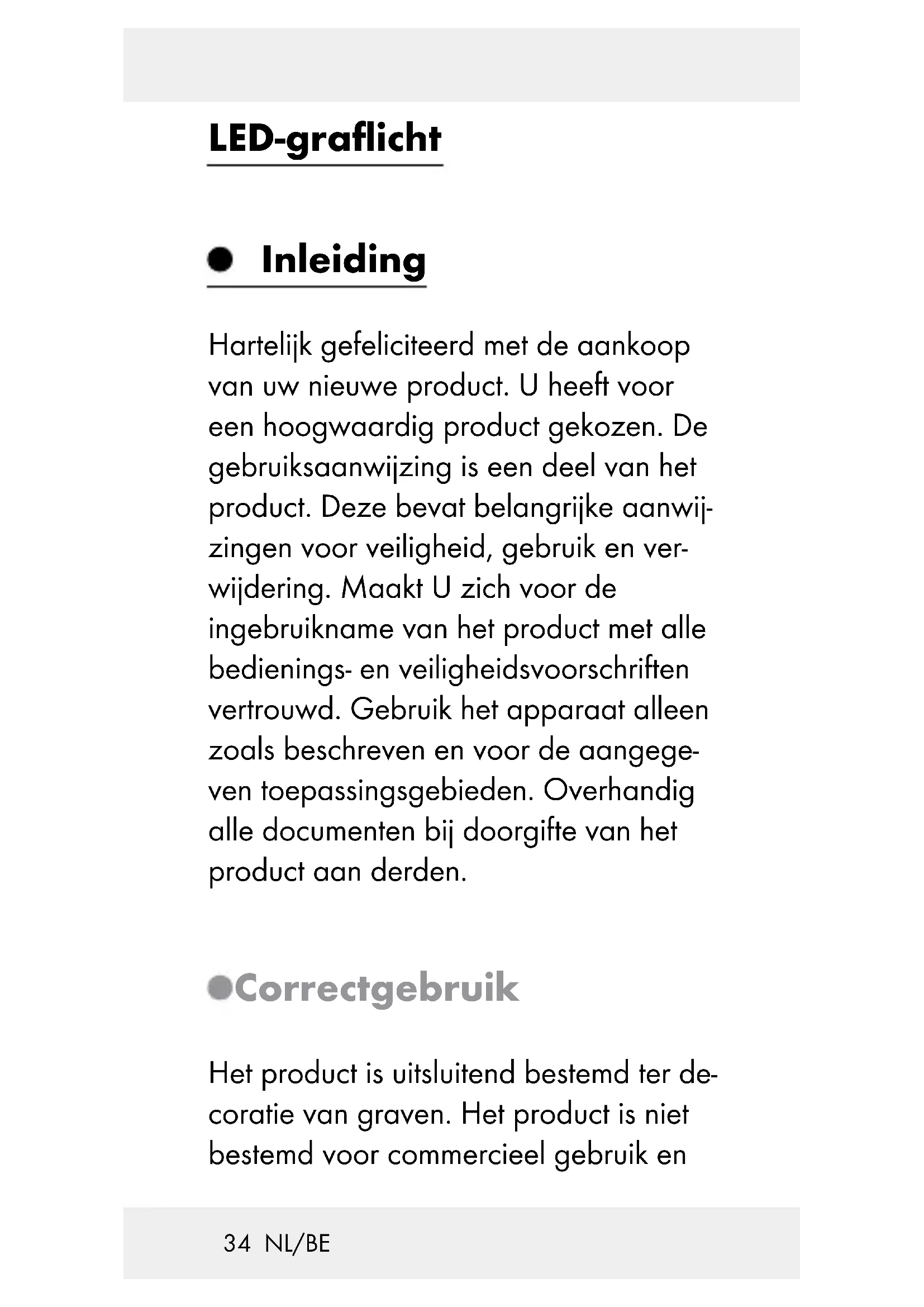 uit de batterijvakbehuizing. Verwijder de oude batterijen en plaats de nieuwe batterijen. Let hier- bij op de juiste polariteit. Deze wordt aangegeven in het batterijvak. Monteer weer alle onderdelen. De grafkaars is nu weer gereed voor gebruik. Reiniging en onderhoud Schakel de grafkaars uit en haal de batterijen eruit, voordat u hem reinigt. Gebruik voor reiniging en onderhoud een droge, zachte, pluisvrije doek.43 NL/BE Gebruik in geval van sterkere veront- reinigingen een iets vochtige doek en een mild afwasmiddel. Verwijderingsinstructies De verpakking bestaat uit mi- lieuvriendelijke grondstoffen die u via de plaatselijke recy- clingcontainers kunt afvoeren. Informatie over de mogelijkheden om het uitgediende product na gebruik te verwijderen, verstrekt uw gemeentelijke overheid. Gooi het afgedankte product omwille van het milieu niet weg via het huisvuil, maar geef het af bij het daarvoor bestemde depot of het ge- meentelijke milieupark. Over afgifteplaatsen en hun ope- ningstijden kunt u zich bij44 NL/BE uw aangewezen instantie informeren. Defecte of verbruikte batterijen moeten volgens de richtlijn 2006 / 66 / EG en diens veranderingen worden gerecycled. Geef batterijen en / of het apparaat af bij de daarvoor bestemde verzamelstati- ons. Milieuschade door verkeerde afvoer van batterijen! Batterijen mogen niet via het huisvuil worden weggegooid. Ze kunnen giftig zwaar metaal bevatten en vallen onder het chemisch afval. De chemische symbolen van de zware metalen zijn als volgt: Cd = cadmium, Hg = kwik, Pb = lood. Geef verbruikte batterijen daarom af bij een gemeentelijk inzamel- punt.45 NL/BE Garantie Het apparaat wordt volgens strenge kwaliteitsrichtlijnen zorgvuldig geprodu- ceerd en voor levering grondig getest. In geval van schade aan het product kunt u rechtmatig beroep doen op de verkoper van het product. Deze wettelijke rechten worden door onze hierna vermelde garantie niet beperkt. U ontvangt op dit apparaat 3 jaar garantie vanaf de aankoopdatum. De garantieperiode start op de dag van aankoop. Bewaar de originele kassabon alstublieft. Dit document is nodig als bewijs voor aankoop. Wanneer binnen 3 jaar na de aankoop- datum van dit product een materiaal- of productiefout optreedt, dan wordt het product door ons – naar onze keuze – gratis voor u gerepareerd of vervangen. Deze garantie komt te vervallen als het product beschadigd wordt, niet correct gebruikt of onderhouden wordt.46 NL/BE De garantie geldt voor materiaal- en pro- ductiefoute n. Deze garantie is niet van toepassing op productonderdelen, die onderhevig zijn aan normale slijtage en hierdoor als aan slijtage onderhevige onderdelen gelden (bijv. batterijen) of voor beschadigingen aan breekbare on- derdelen, zoals bijv. schakelaars, accu’s of dergelijke onderdelen, die gemaakt zijn van glas.47 DE/AT/CH Einleitung ........................... Seite 48 Bestimmungsgemäße Verwendung .......................... Seite 48 Teilebeschreibung ................. Seite 49 Technische Daten .................. Seite 49 Lieferumfang .......................... Seite 50 Allgemeine Sicherheitshinweise ... Seite 50 Sicherheitshinweise für Batterien ........................... Seite 52 Inbetriebnahme ........... Seite 54 Batterien wechseln ... Seite 55 Reinigung und Pflege ........................ Seite 56 Entsorgungs- hinweise ............................. Seite 57 Garantie ............................. Seite 5948 DE/AT/CH LED-Grablicht Einleitung Wir beglückwünschen Sie zum Kauf Ih- res neuen Produkts. Sie haben sich damit für ein hochwertiges Produkt entschieden. Die Bedienungsanleitung ist Teil dieses Produkts. Sie enthält wichtige Hinweise für Sicherheit, Gebrauch und Entsorgung. Machen Sie sich vor der Benutzung des Produkts mit allen Bedien- und Sicher- heitshinweisen vertraut. Benutzen Sie das Produkt nur wie beschrieben und für die angegebenen Einsatzbereiche. Händigen Sie alle Unterlagen bei Wei- tergabe des Produkts an Dritte mit aus. Bestimmungsgemäße Verwendung Das Produkt ist ausschließlich zur Deko- ration von Grabstätten geeignet. Das Produkt ist nicht für den gewerblichen49 DE/AT/CH Einsatz und nur für die angegebenen Einsatzbereiche bestimmt. Dieses Produkt ist nicht zur Raum beleuchtung im Haushalt geeignet. Teilebeschreibung