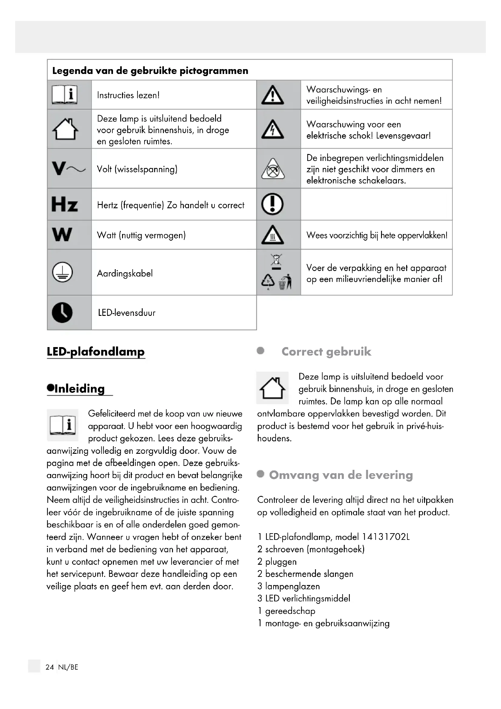 Voer de verpakking en het apparaat op een milieuvriendelijke manier af! LED-levensduur LED-plafondlamp Inleiding Gefeliciteerd met de koop van uw nieuwe apparaat. U hebt voor een hoogwaardig product gekozen. Lees deze gebruiks- aanwijzing volledig en zorgvuldig door. Vouw de pagina met de afbeeldingen open. Deze gebruiks- aanwijzing hoort bij dit product en bevat belangrijke aanwijzingen voor de ingebruikname en bediening. Neem altijd de veiligheidsinstructies in acht. Contro- leer vóór de ingebruikname of de juiste spanning beschikbaar is en of alle onderdelen goed gemon- teerd zijn. Wanneer u vragen hebt of onzeker bent in verband met de bediening van het apparaat, kunt u contact opnemen met uw leverancier of met het servicepunt. Bewaar deze handleiding op een veilige plaats en geef hem evt. aan derden door. Correct gebruik Deze lamp is uitsluitend bedoeld voor gebruik binnenshuis, in droge en gesloten ruimtes. De lamp kan op alle normaal ontvlambare oppervlakken bevestigd worden. Dit product is bestemd voor het gebruik in privé-huis- houdens. Omvang van de levering Controleer de levering altijd direct na het uitpakken op volledigheid en optimale staat van het product. 1 LED-plafondlamp, model 14131702L 2 schroeven (montagehoek) 2 pluggen 2 beschermende slangen 3 lampenglazen 3 LED verlichtingsmiddel 1 gereedschap 1 montage- en gebruiksaanwijzing25 NL/BE Inleiding / Veiligheid Inleiding Beschrijving van de onderdelen